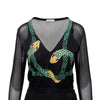 Krizia became iconic for clean lines, the combination of fine materials and superb craftsmanship. Her collections were frequently featured with animal motifs such as tigers and butterflies print. The dress from ‘70 with the hand painted snakes is a perfect example of her vision with crepe and sheer texture with the touch of green glitter embellishment.