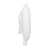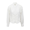 White cotton shirt by A.F. Vandevorst with band collar, pleated front, hook-button closure, and gathered pleated sleeves with cuffs at the hem.