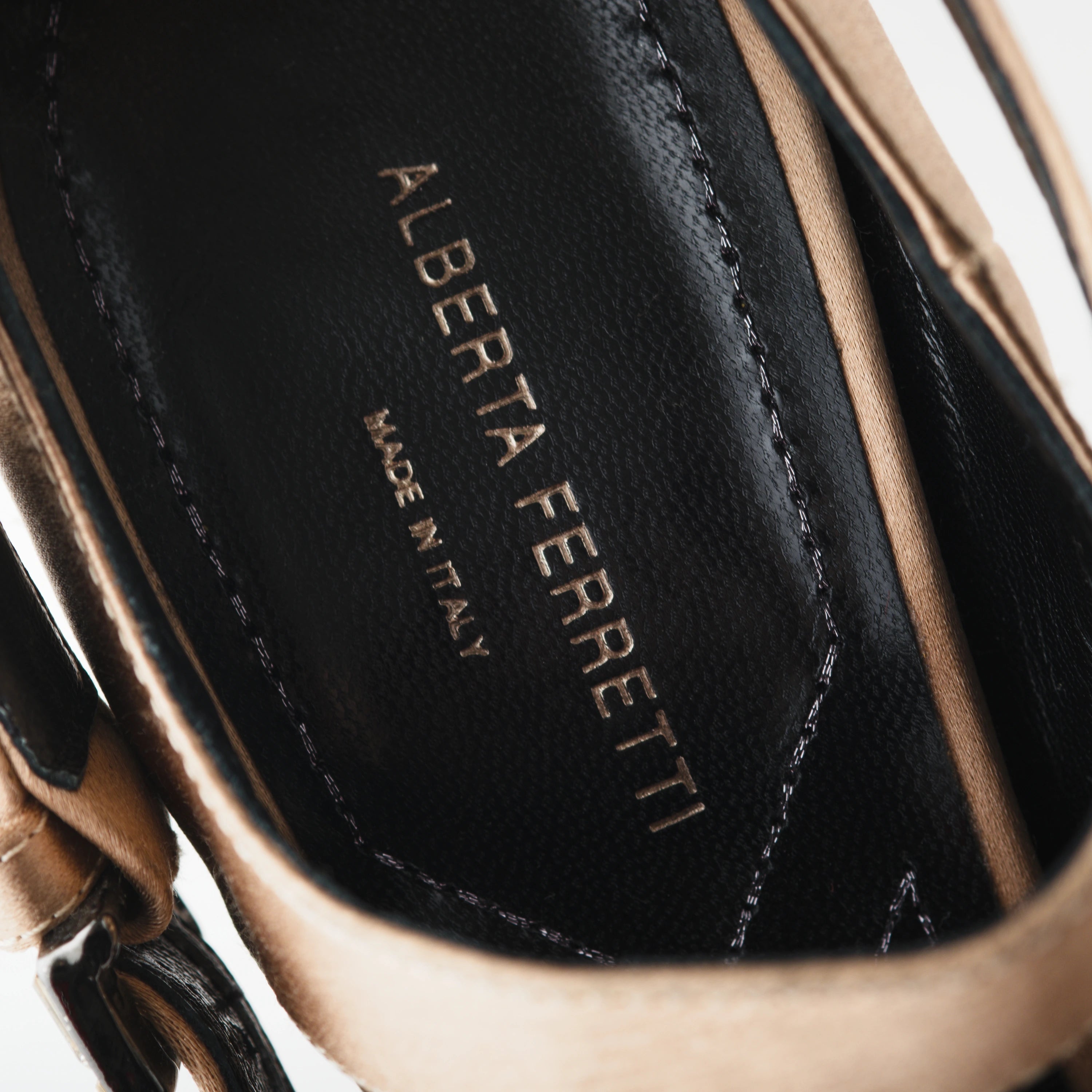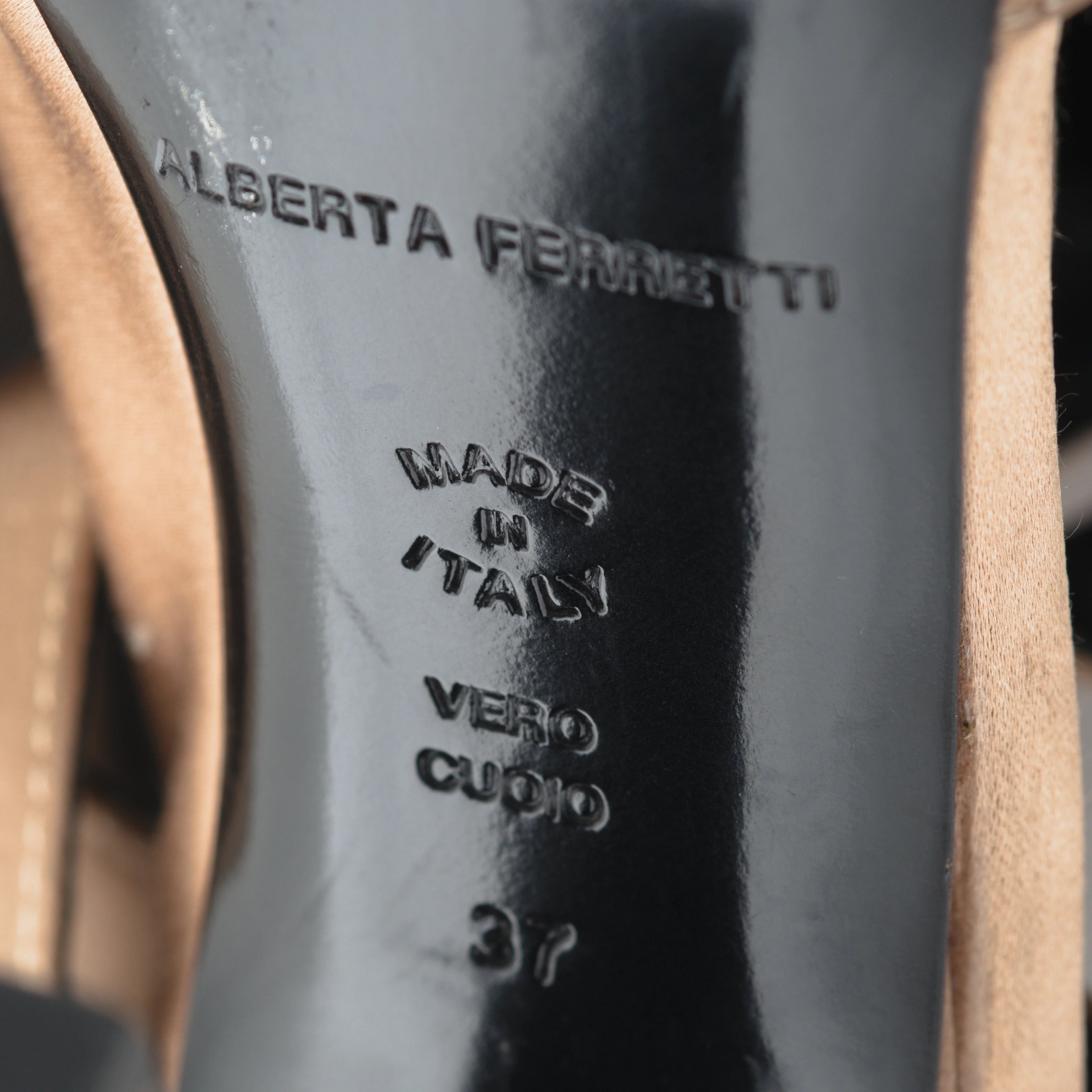 These refined beige satin sandals by Alberta Ferretti combine elegance and femininity. The chunky block heel provides comfort and stability, while the cross-strap ankle closure adds a sophisticated and modern touch, making them perfect for daytime looks and special occasions.