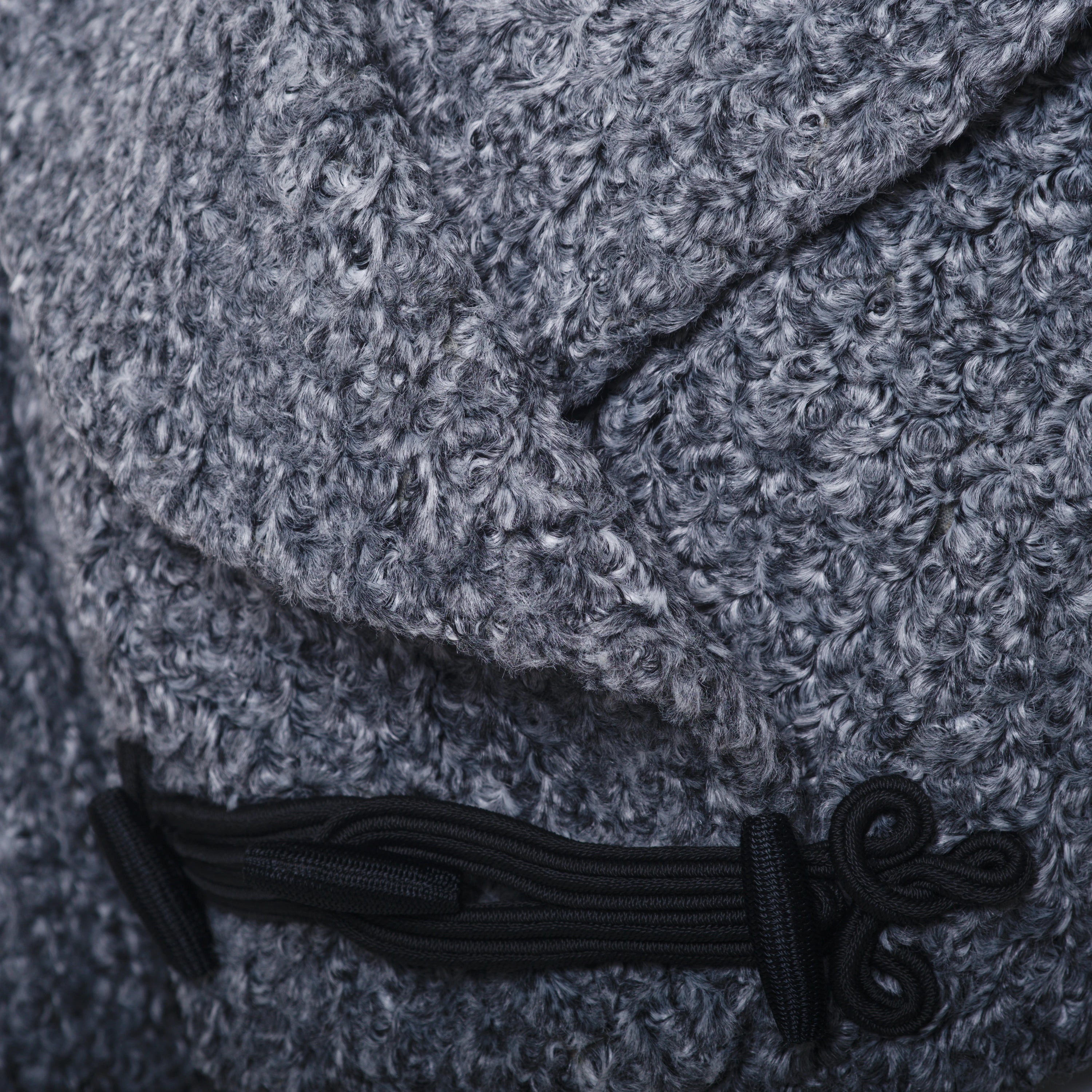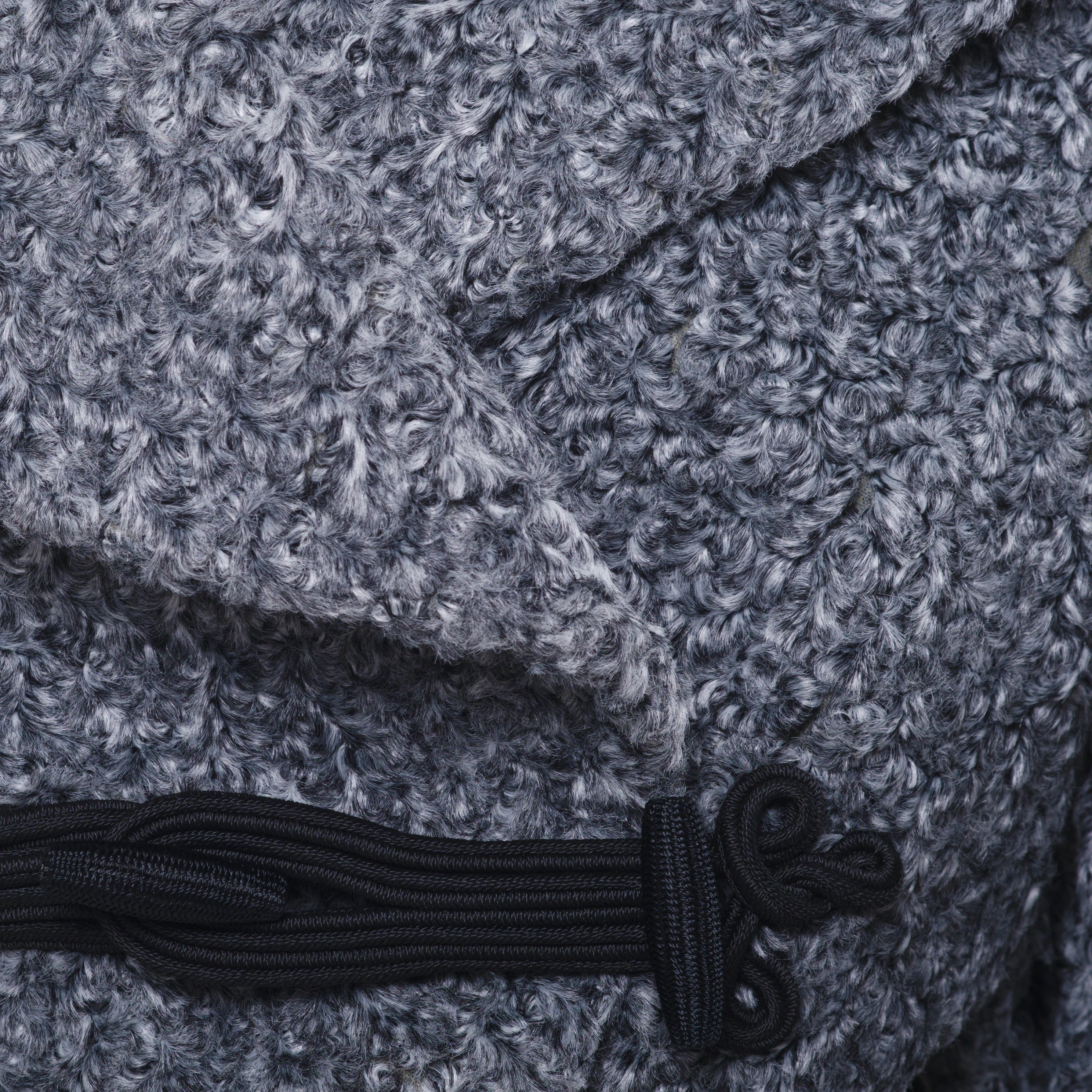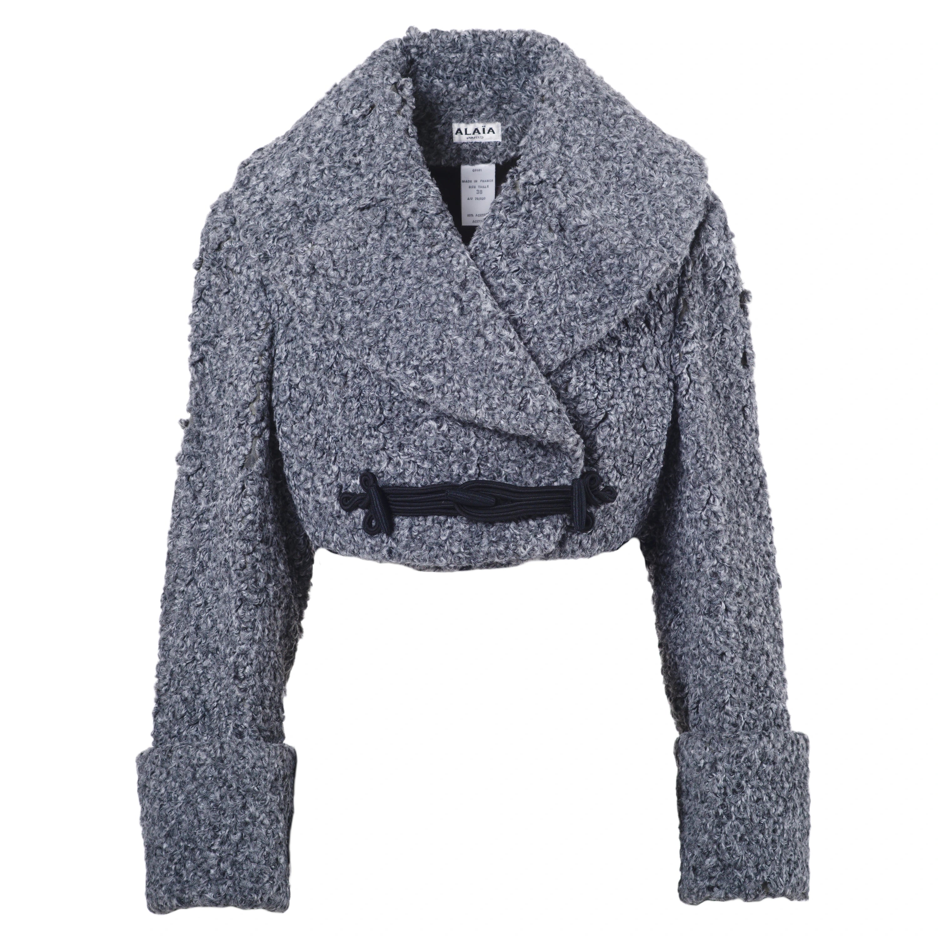 Cropped runway jacket by Azzedine Alaïa from the Fall/Winter 1991 collection. Crafted in textured Astrakhan with a structured silhouette, it features a wide notched collar, long sleeves with turned cuffs, and black cord toggle front fastening. The design emphasizes the waist and reflects Alaïa’s sculptural approach to tailoring. An increasingly rare archival piece from the early 1990s.