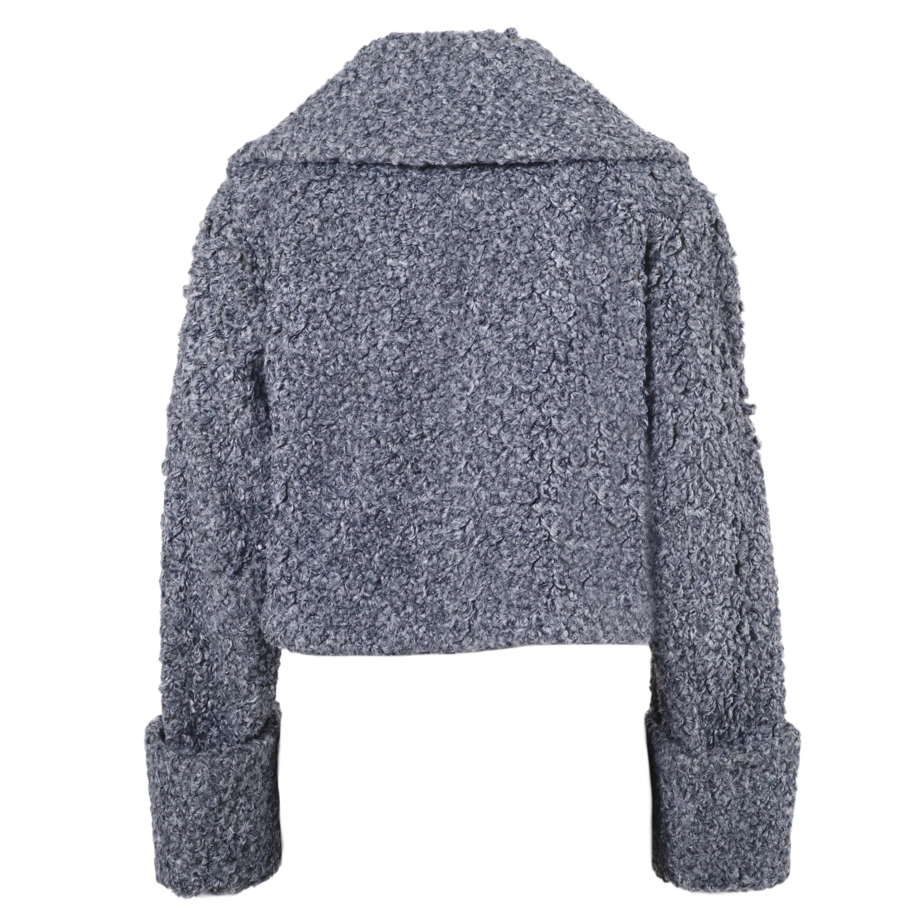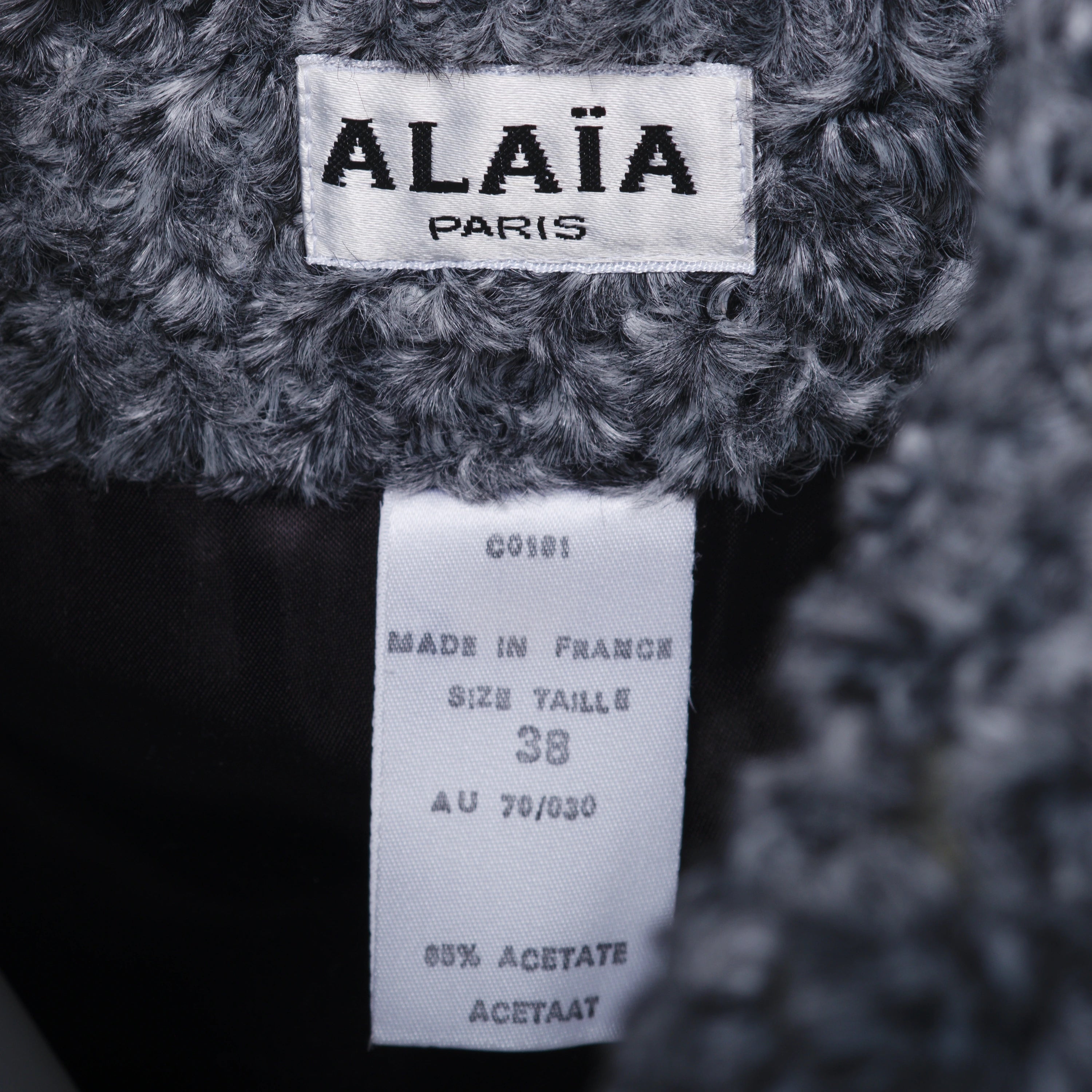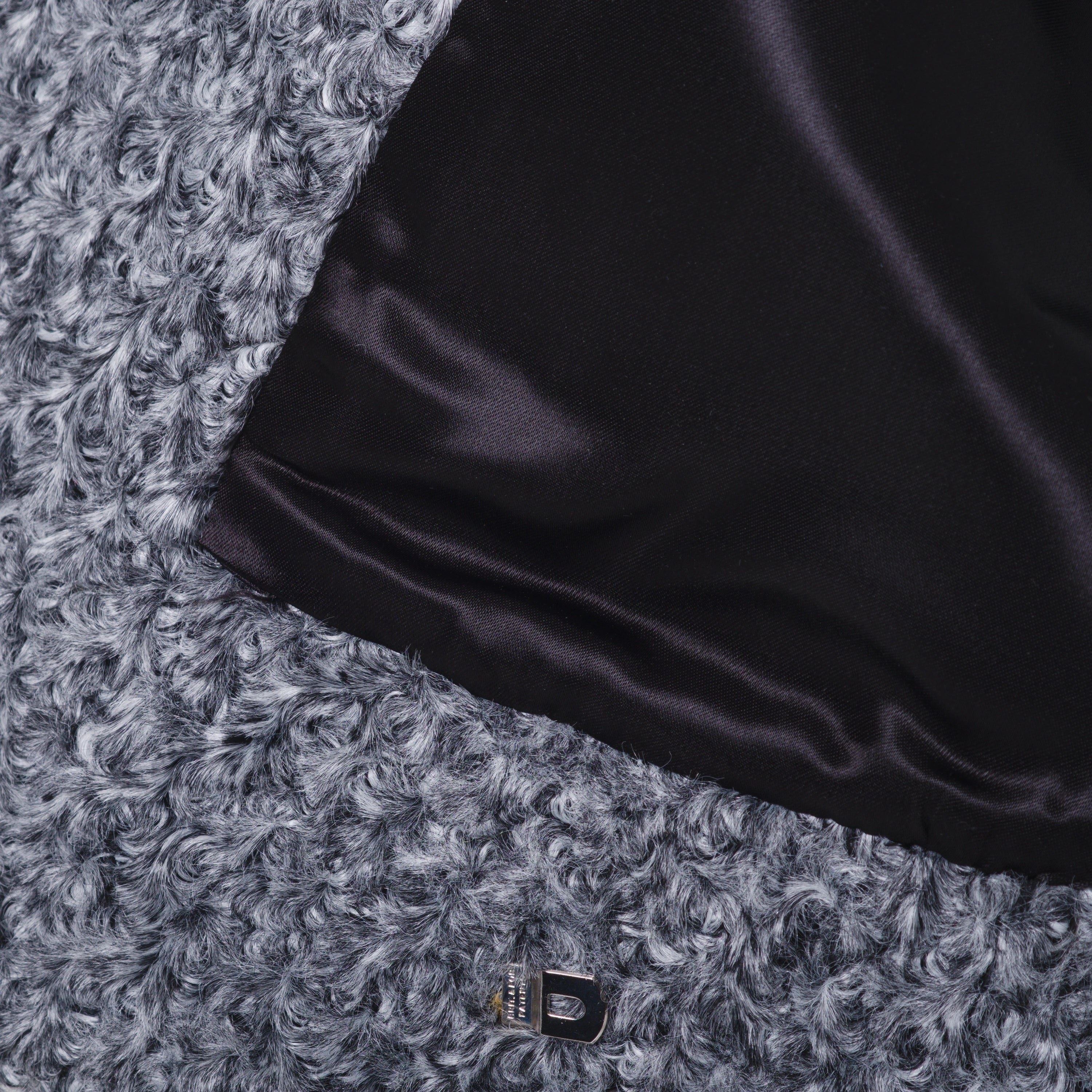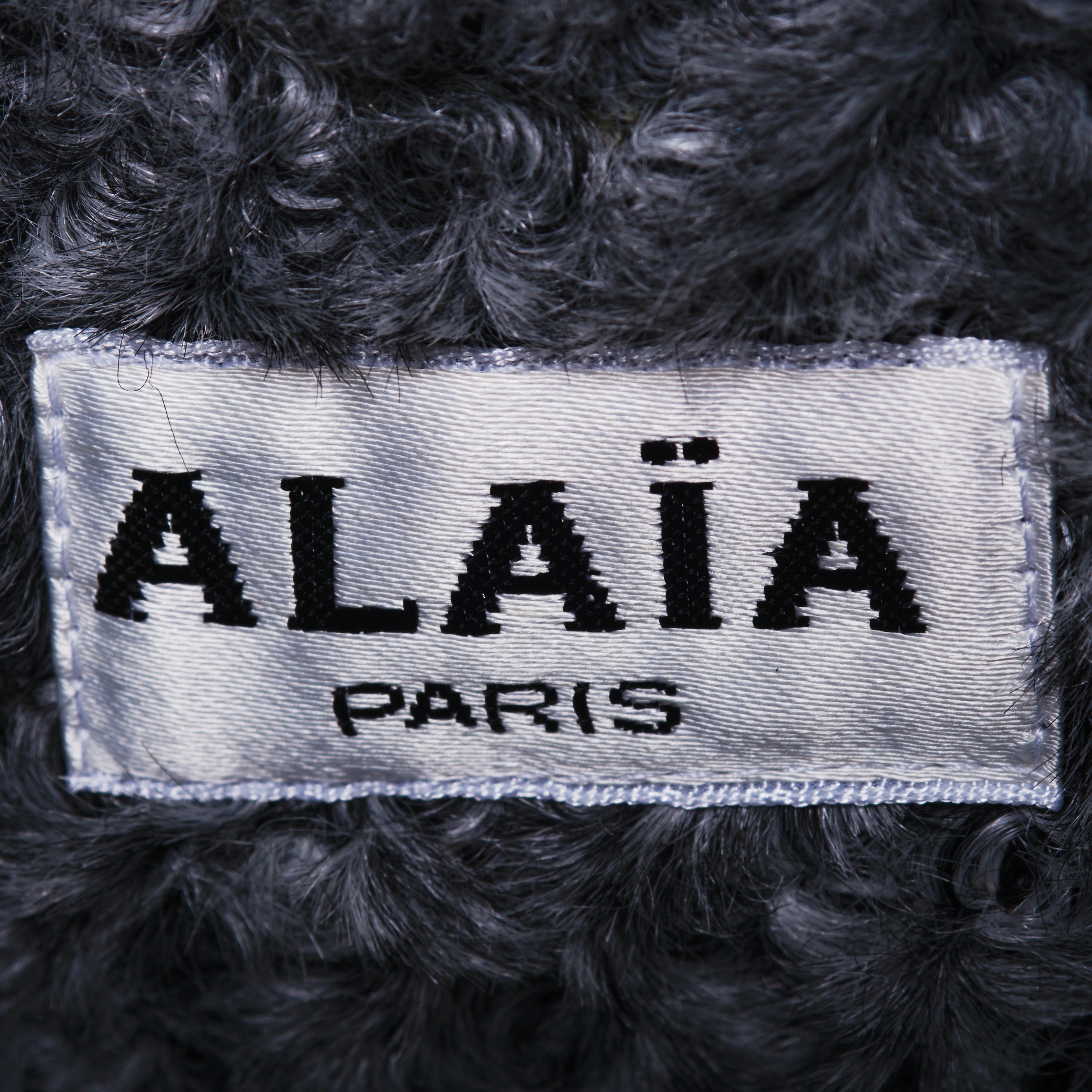 Cropped runway jacket by Azzedine Alaïa from the Fall/Winter 1991 collection. Crafted in textured Astrakhan with a structured silhouette, it features a wide notched collar, long sleeves with turned cuffs, and black cord toggle front fastening. The design emphasizes the waist and reflects Alaïa’s sculptural approach to tailoring. An increasingly rare archival piece from the early 1990s.