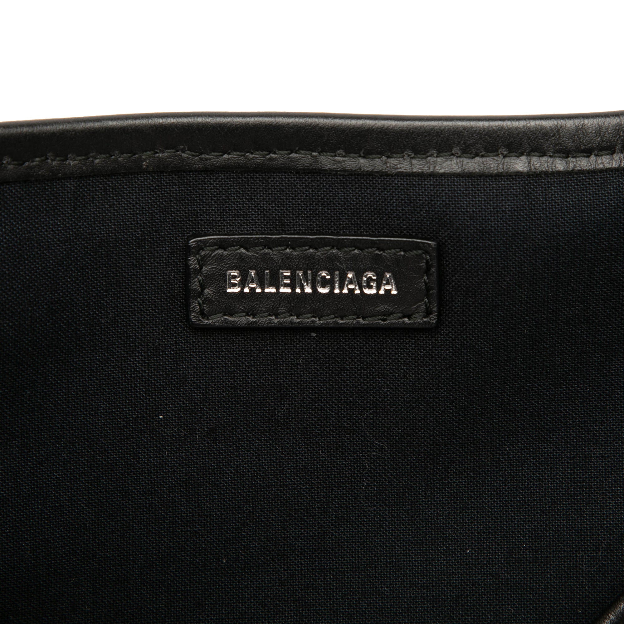 The Navy Cabas S features a canvas body with leather trim, flat leather top handles, an open top, and a pouch inclusion. Retail Price: 1625.00