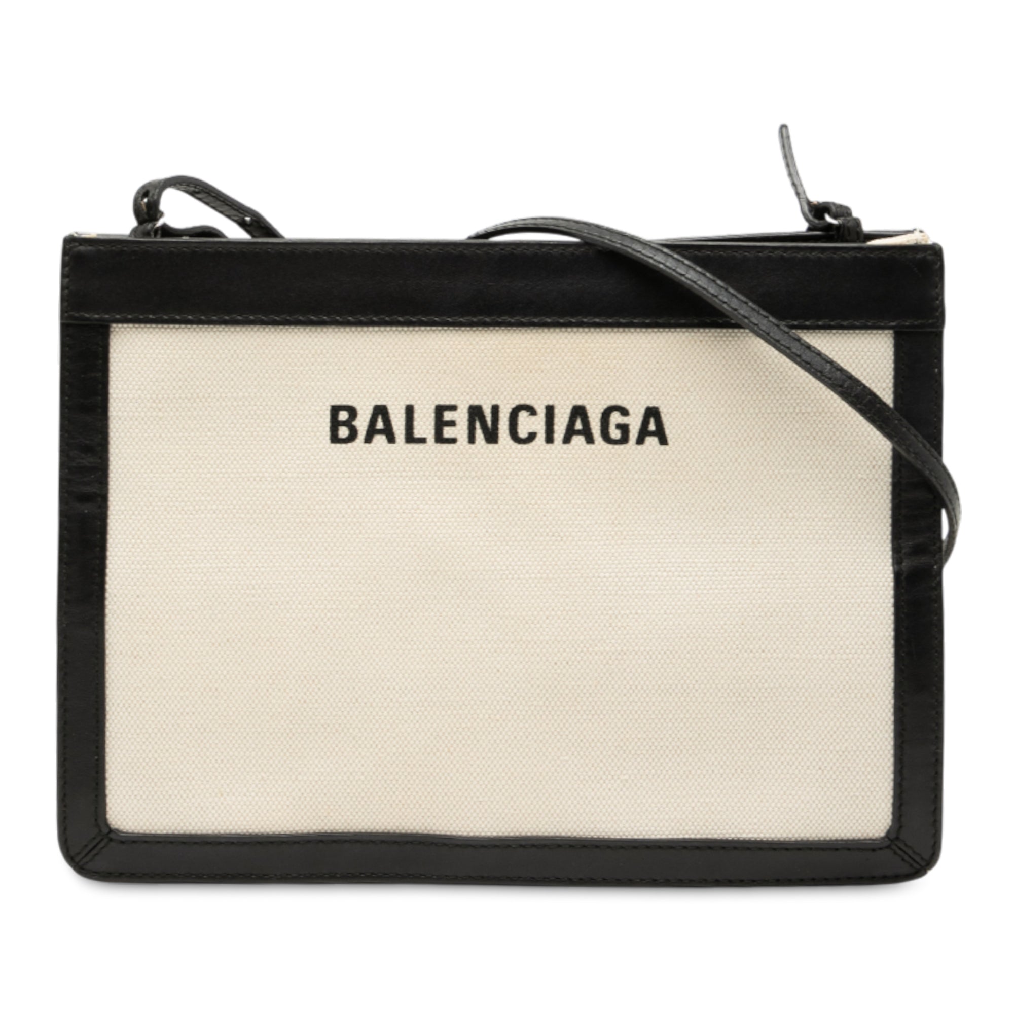 The Navy Pochette crossbody bag features a canvas body with leather trim, an adjustable flat leather shoulder strap, a top zip closure, and an interior slip pocket. Retail Price: 1000.00
