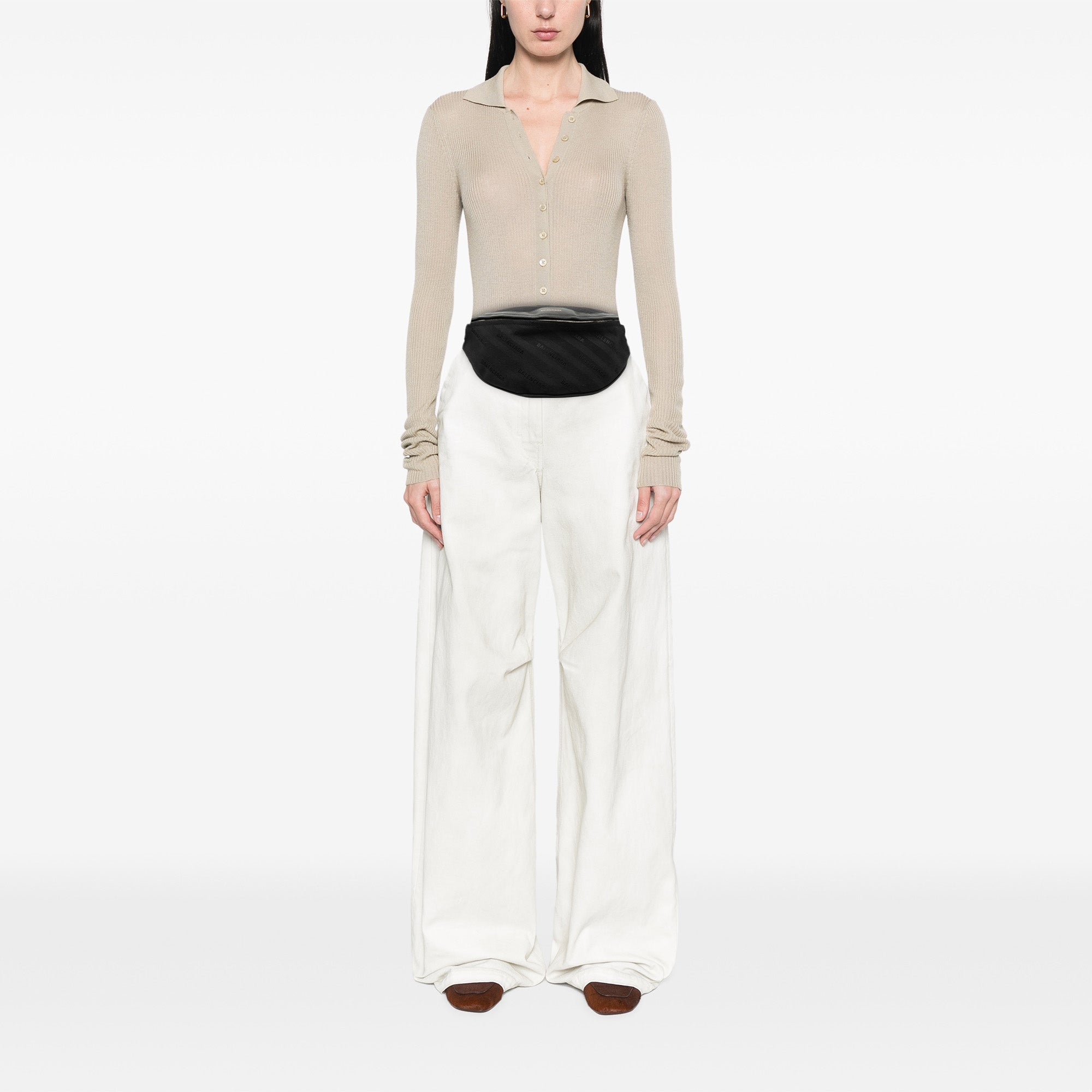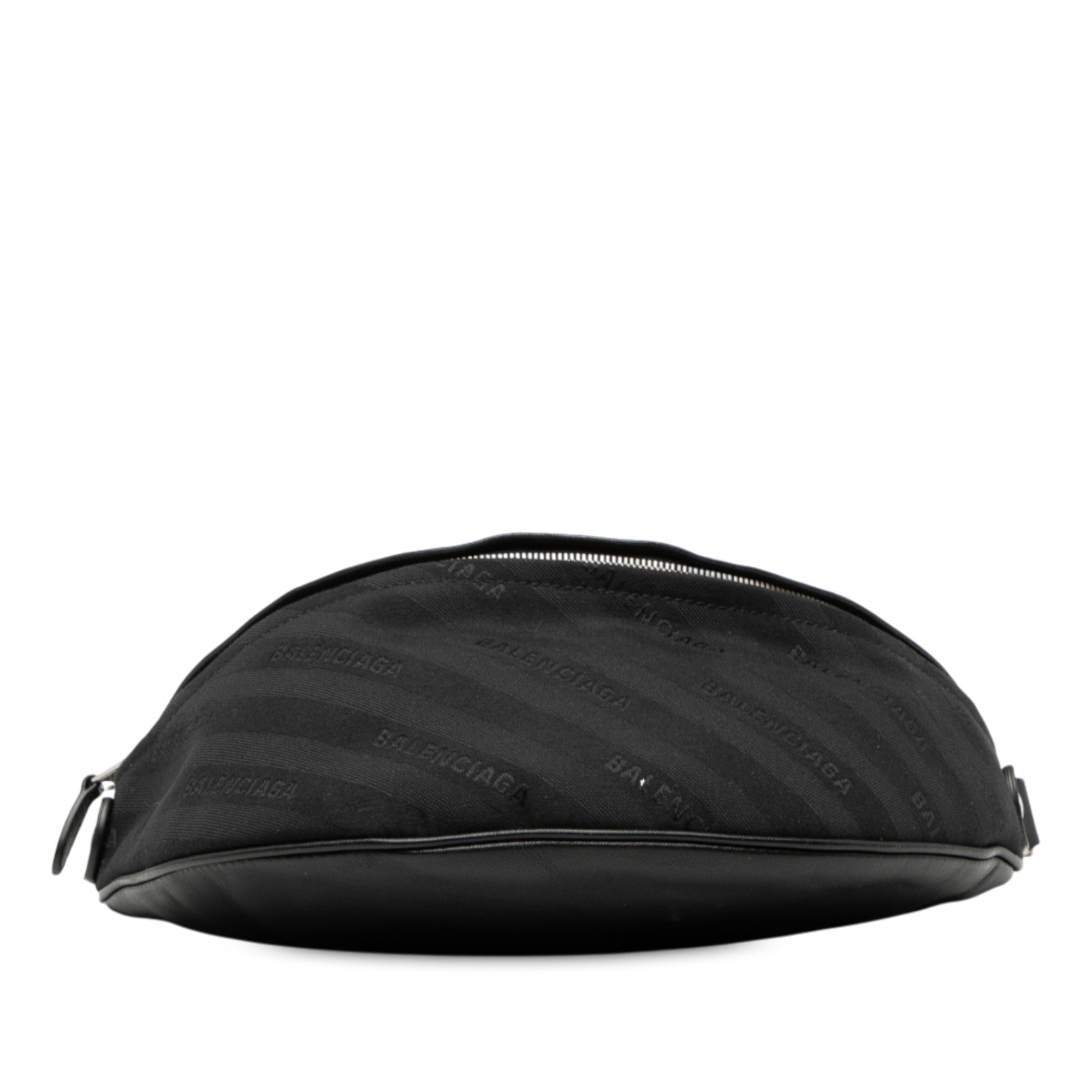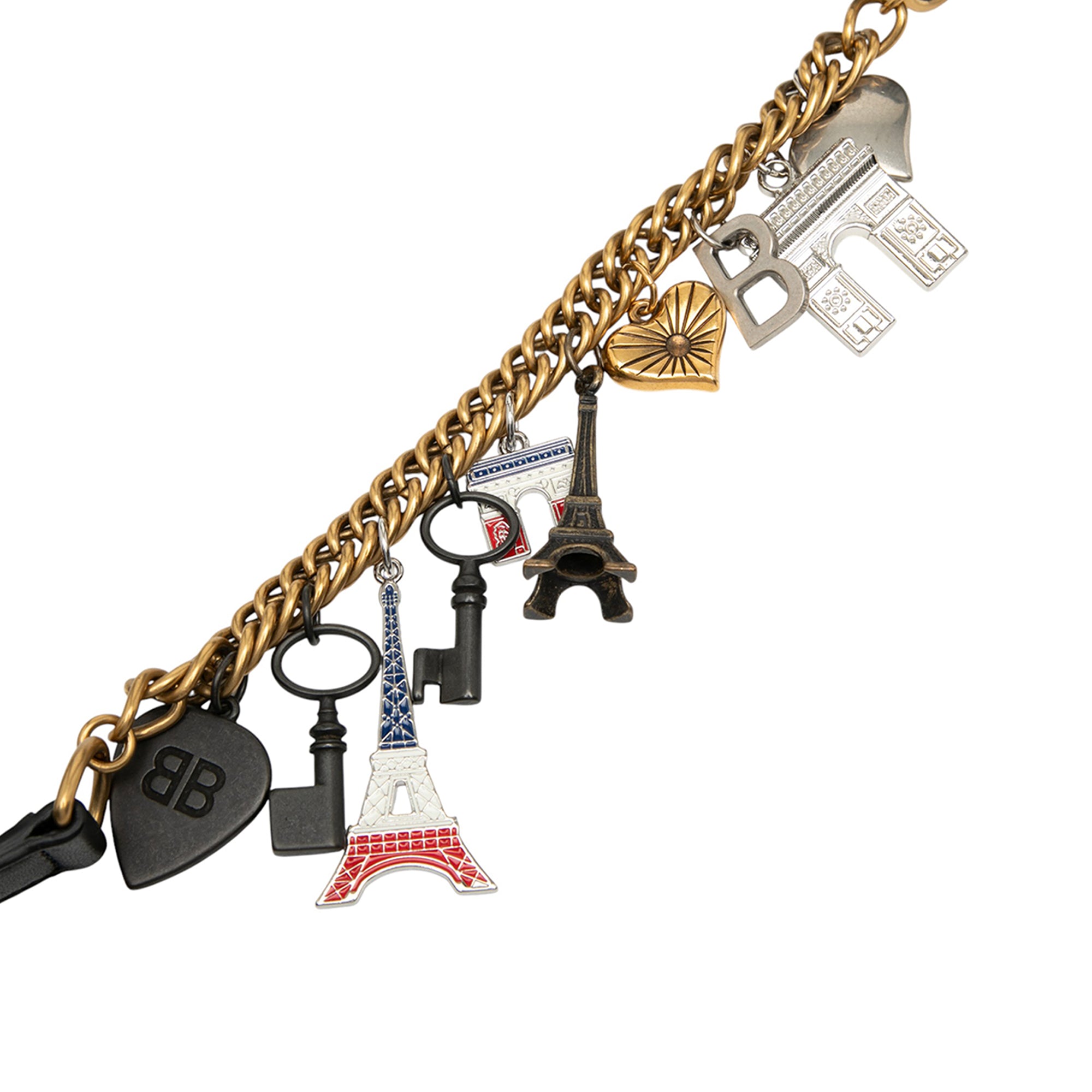 This belt bag bag features a canvas body with leather trim, a chain-link with charms and an adjustable flat leather waist strap, a front zip closure, an exterior back zip pocket, and an interior slip pocket. Retail Price: 1850.00
