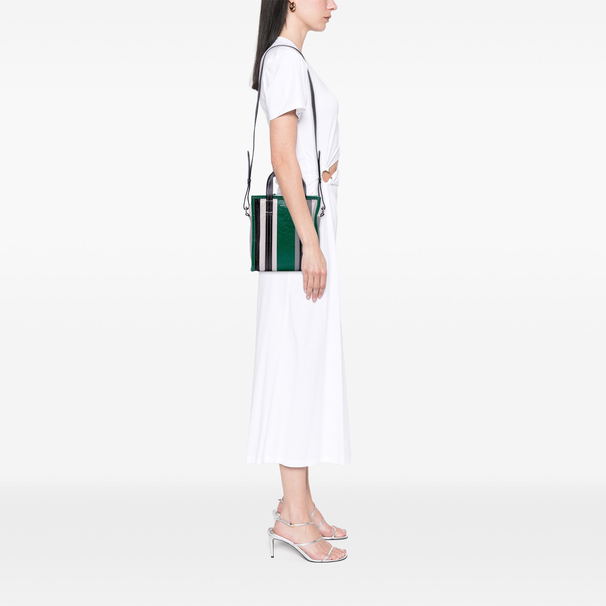 The XS Bazar Shopper features a lambskin leather body, flat leather top handles, a detachable flat leather shoulder strap, top zip closures, an interior fabric lining, and interior zip and slip pockets. Retail Price: 1000.00
