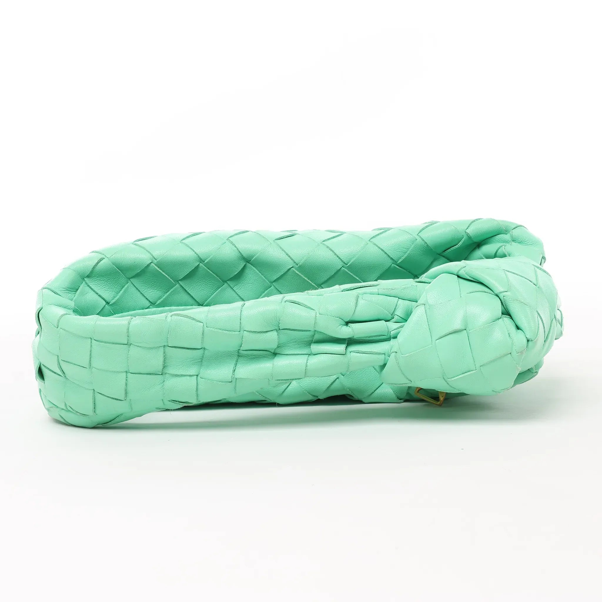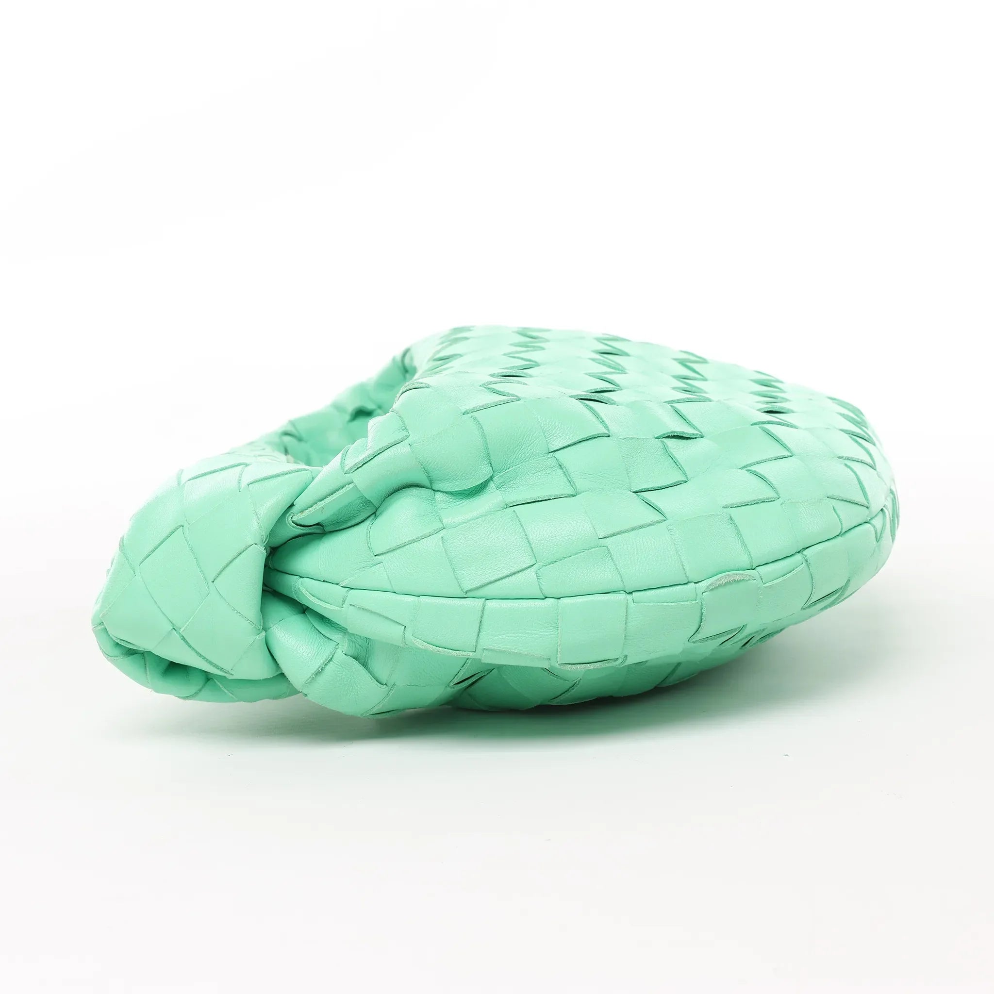 Bottega Veneta Intrecciato Mini Jodie Handbag in green woven leather, featuring the signature knot handle and soft, rounded silhouette. A playful yet luxurious accessory perfect for adding a pop of color to any look.