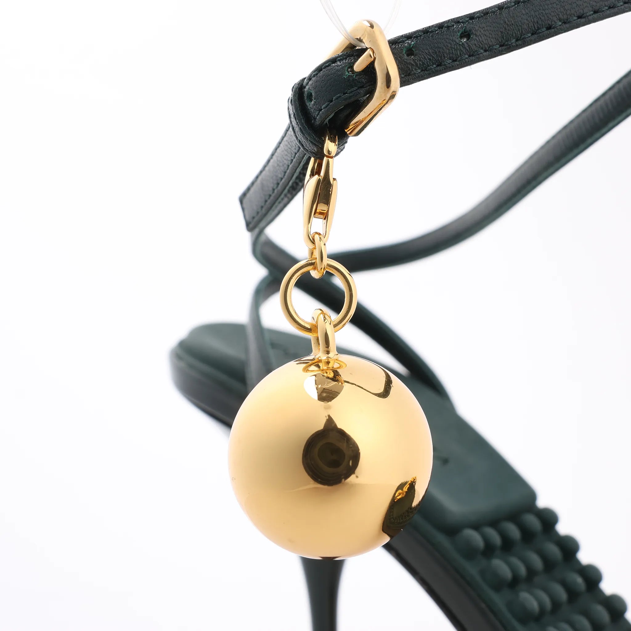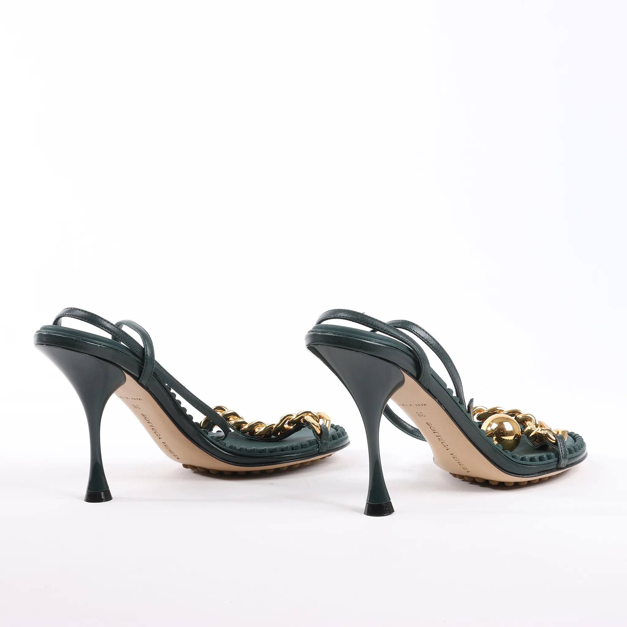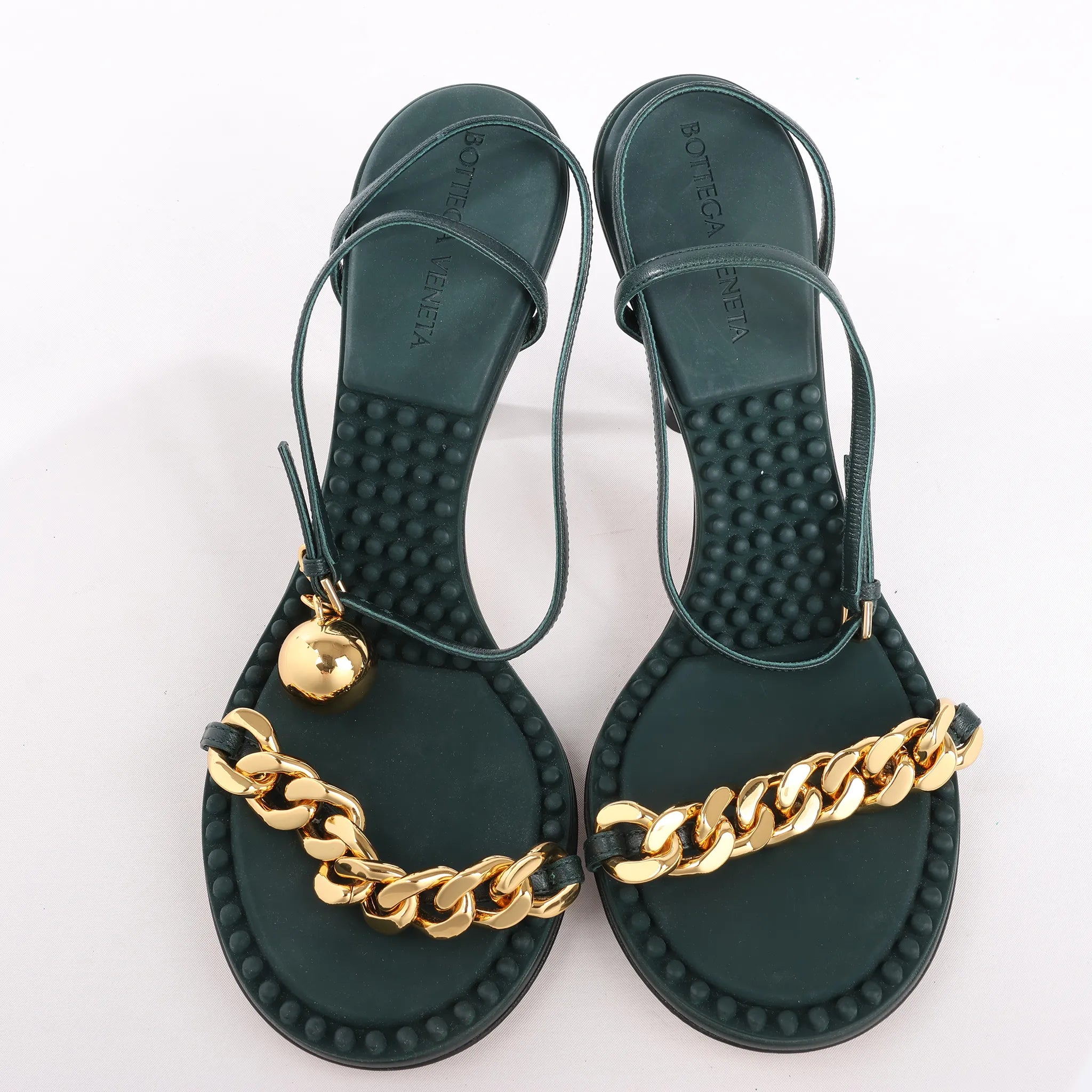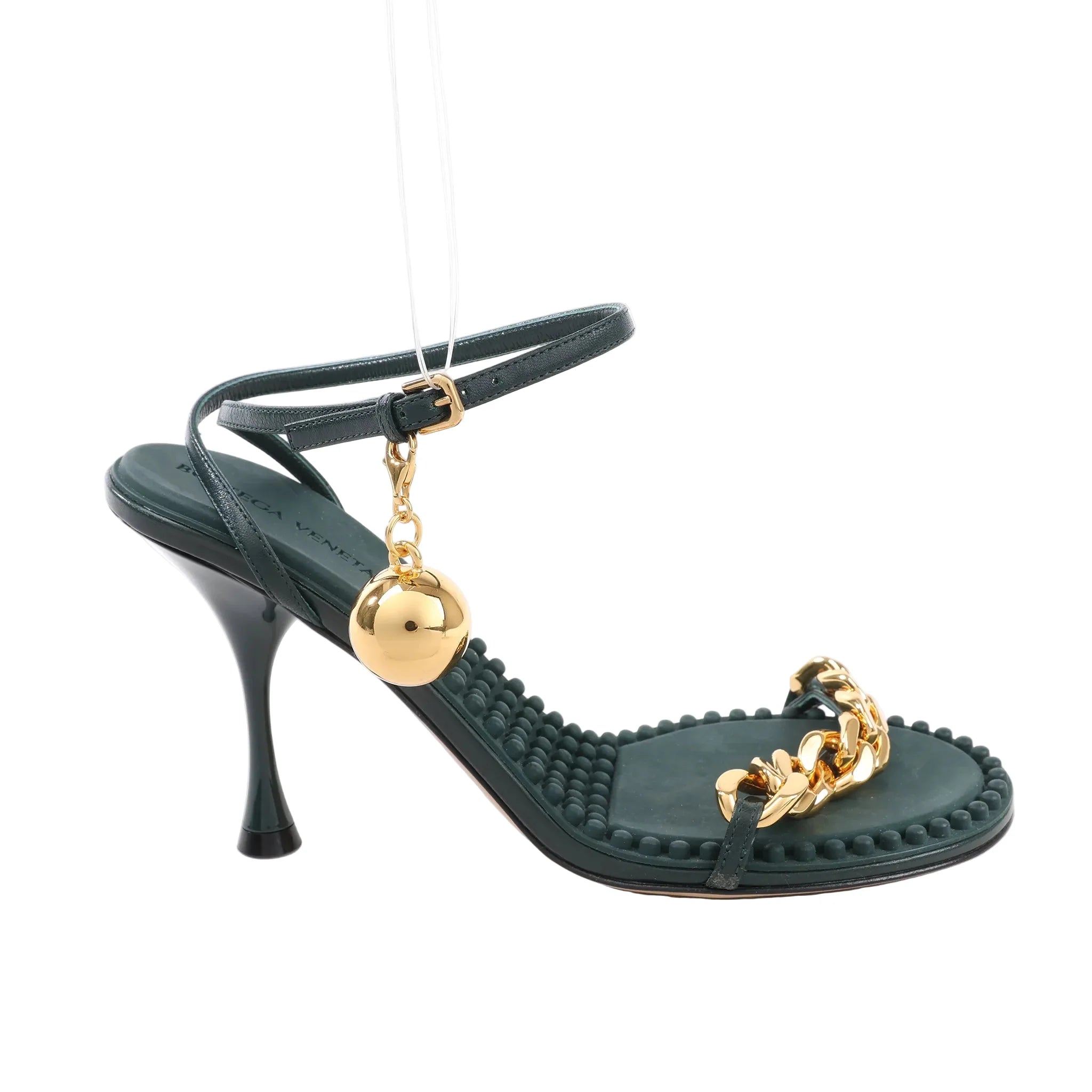 The Bottega Veneta Leather Heel Sandals in Green, Size 38 EU, showcase modern luxury with bold elegance. Featuring a sculpted heel, gold chain detail, and ankle strap with metallic orb charm, these heels embody iconic Italian craftsmanship.