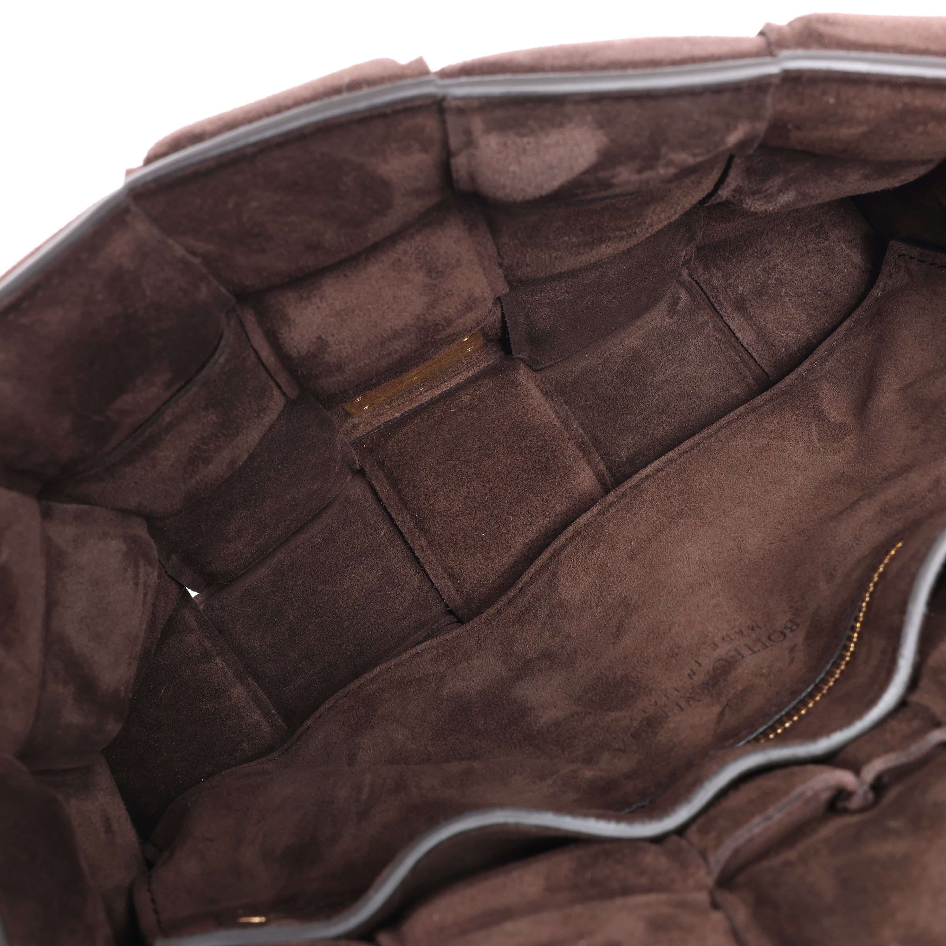 Bottega Veneta Padded Cassette Shoulder Bag in brown suede maxi Intrecciato leather. Bold and plush with geometric weave and signature triangle buckle—an ultra-modern icon of elevated style.
