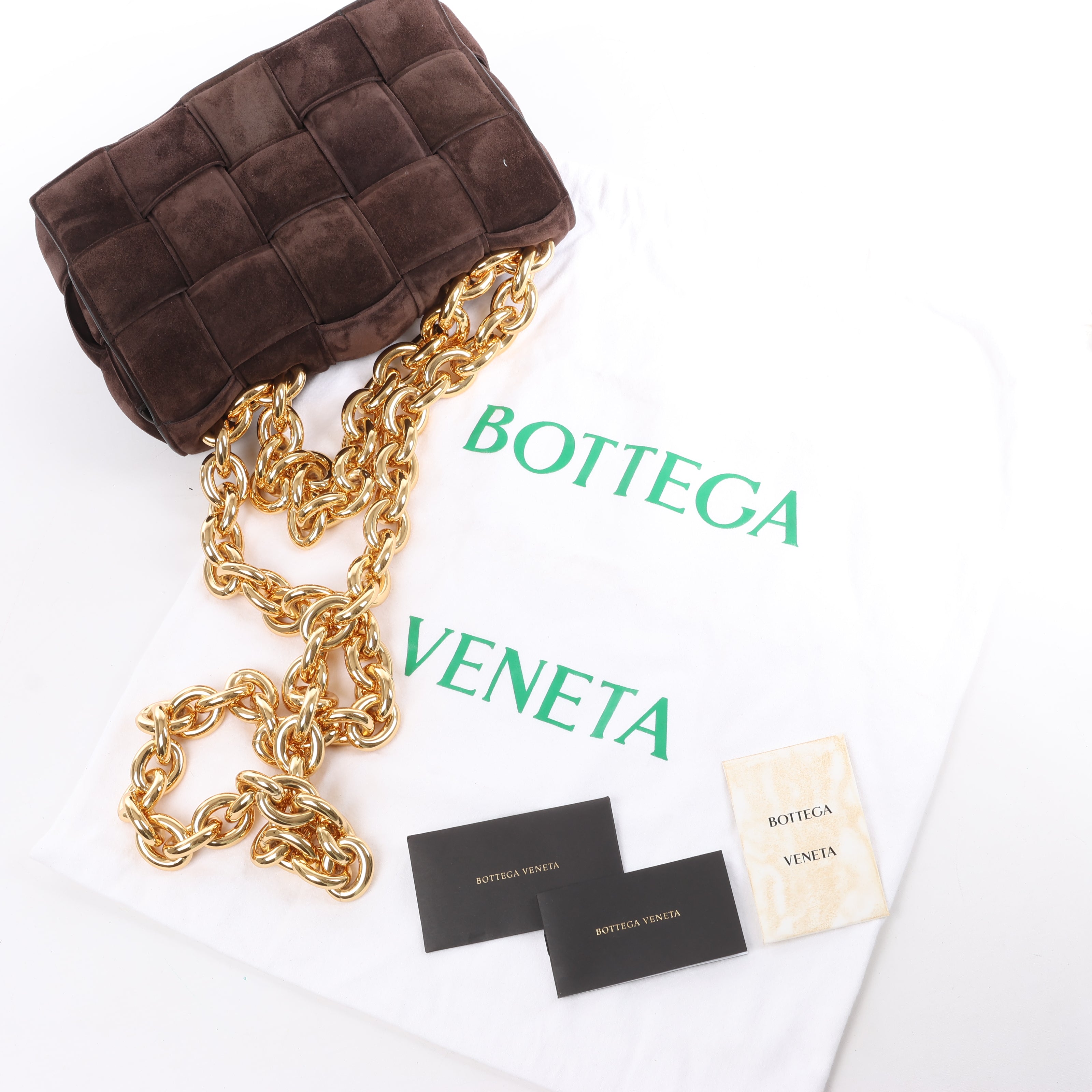 Brand: Bottega Veneta Model: Chain Cassette Size: -Width: 24 cmHeight: 14 cmExterior Condition: ExcellentInterior Condition: Excellent Condition Details: The exterior leather is clean and beautiful. The chain is bright and crisp - like new. The interior is clean and in great condition. Bag is practically unworn!Colour: BrownInterior Colour: BrownHardware Colour: GoldMaterial: SuedeComes With: Dustbag, papers