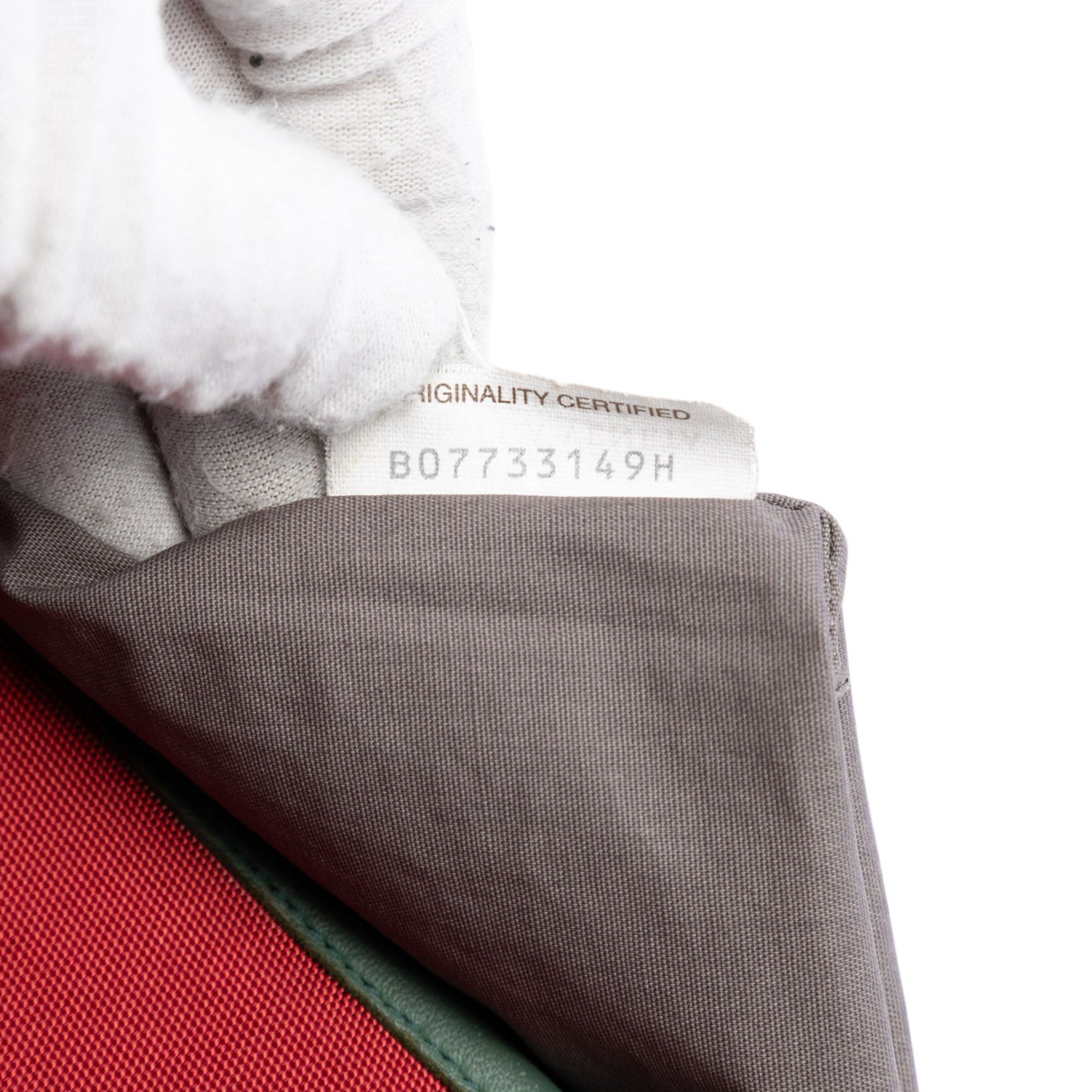 This clutch bag features a canvas body with leather trim, a top zip closure, and an exterior front flap compartment with a hook lock closure. Retail Price: 1010.00