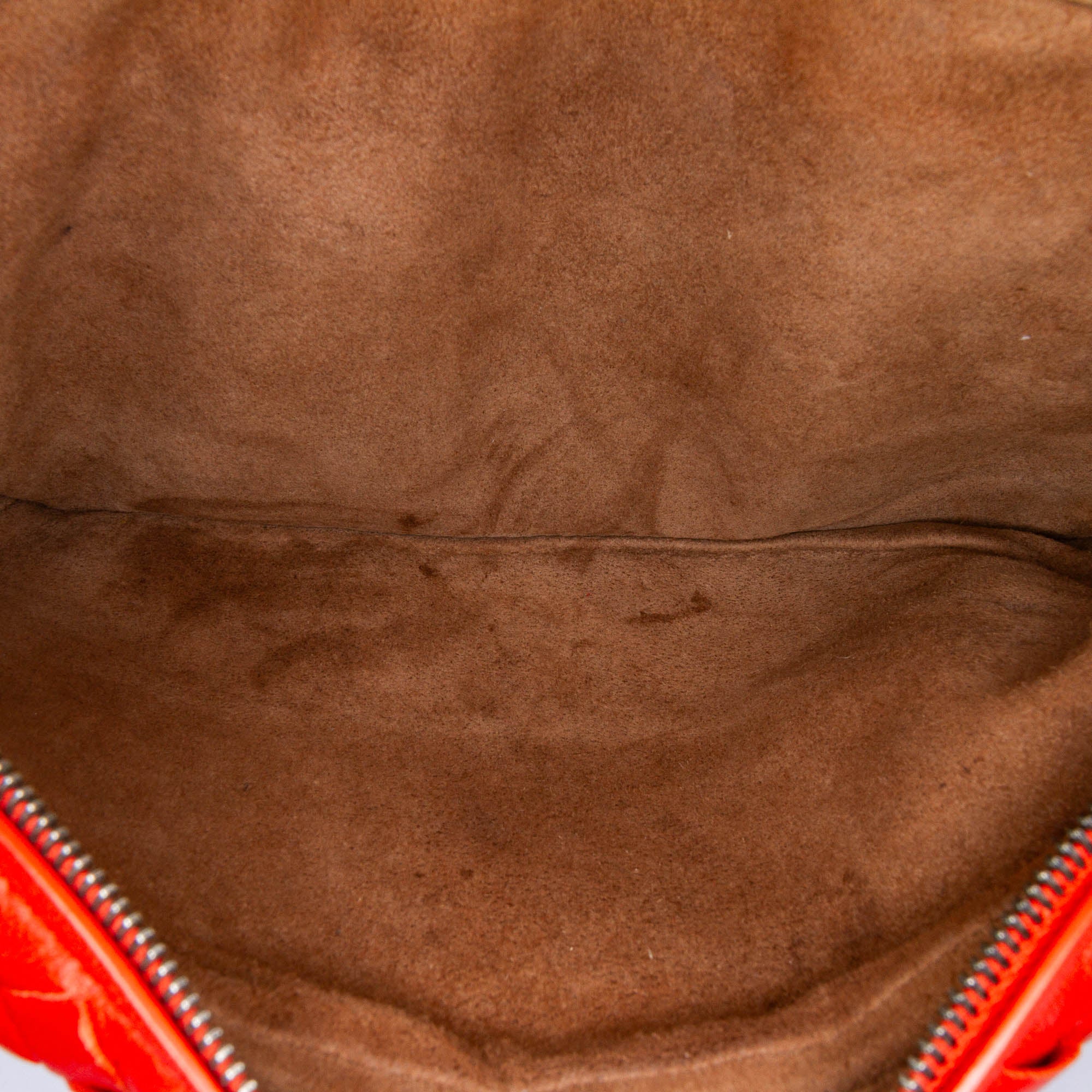 This crossbody bag features a woven leather body, a detachable chain link shoulder strap, a front flap closure, an interior zip compartment, and an exterior bottom zip compartment. Retail Price: 1650.00