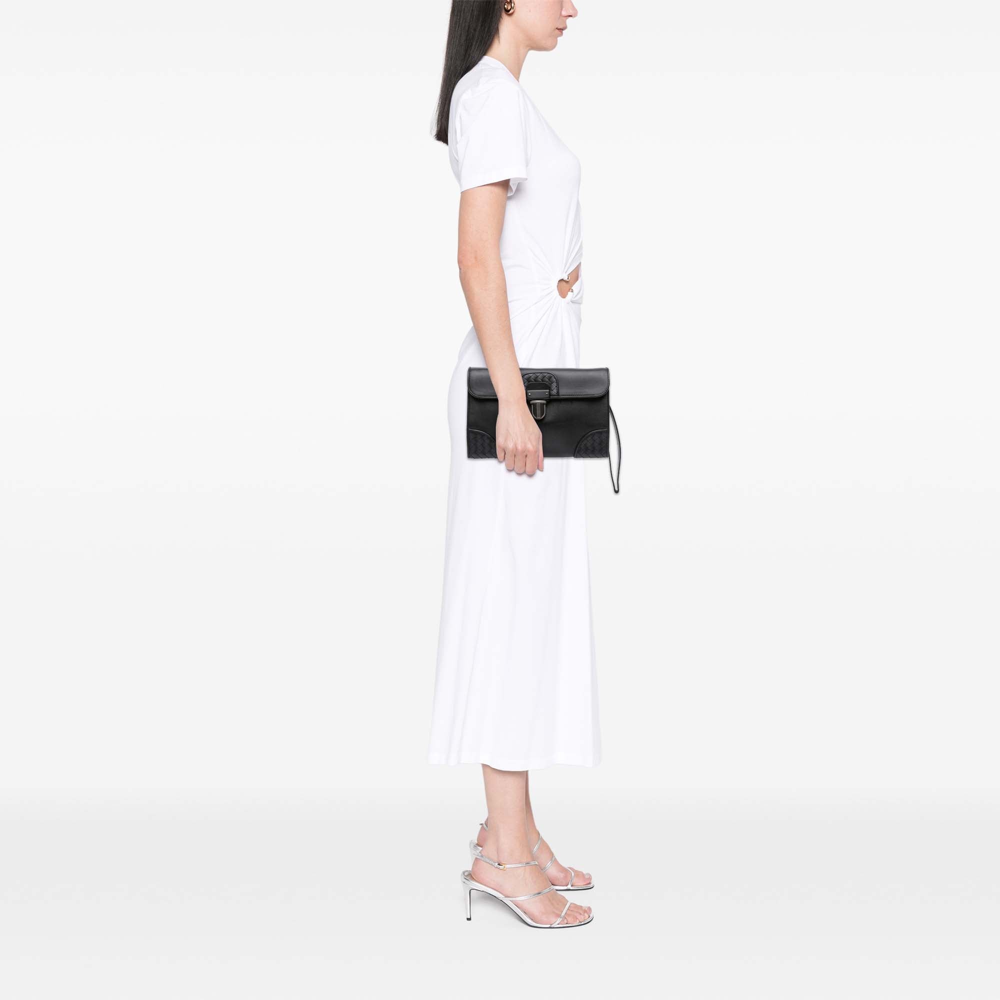 This clutch bag features a leather body with woven details, and a front flap with a push lock closure. Retail Price: 1290.00