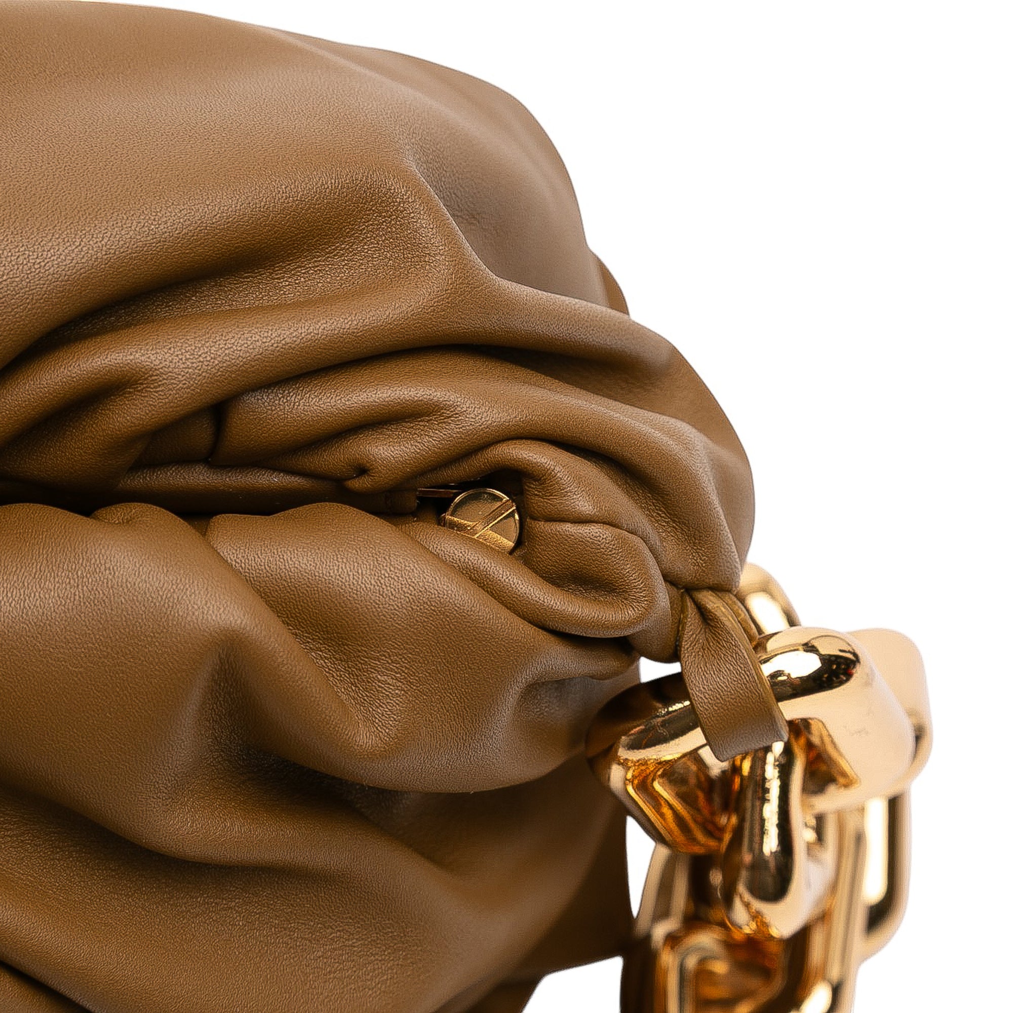 The Chain Pouch features a leather body, a gold-tone chain link strap, and a top magnetic frame closure. Retail Price: 3600.00