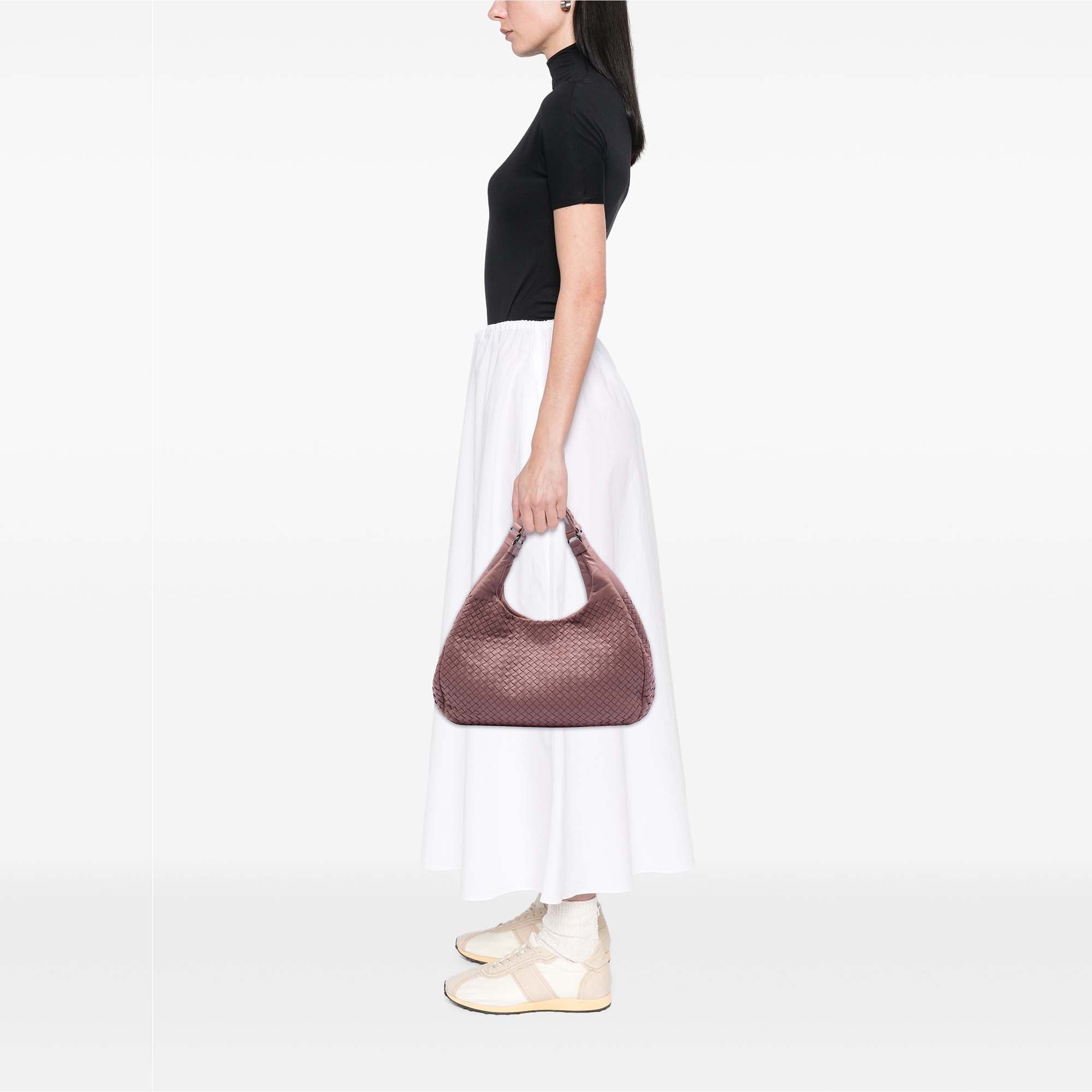 The Campana features a woven leather body, flat leather straps, an open top with magnetic snap and hook closure, and interior zip and slip pockets. Retail Price: 2820.00