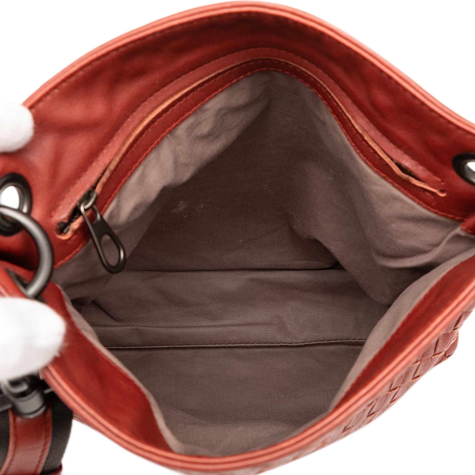 This crossbody bag features a woven leather body, an adjustable flat leather shoulder strap, an open top, and interior zip pocket. Retail Price: 1910.00
