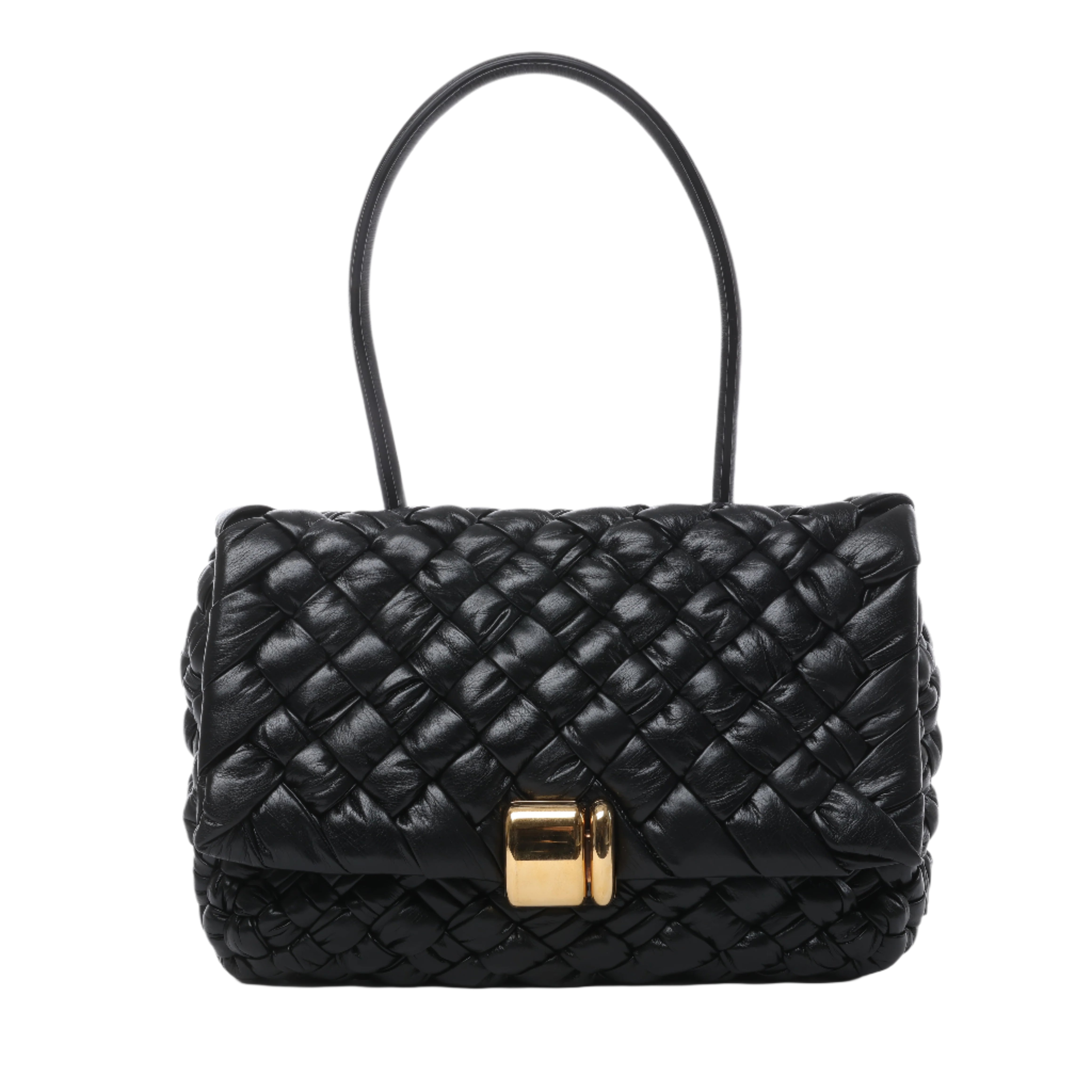 Bottega Veneta’s Rumple Desiree bag exudes quiet luxury with its plush woven leather, structured flap silhouette, and gleaming gold clasp. A statement of artisanal elegance—distinctive, compact, and endlessly chic in timeless black.