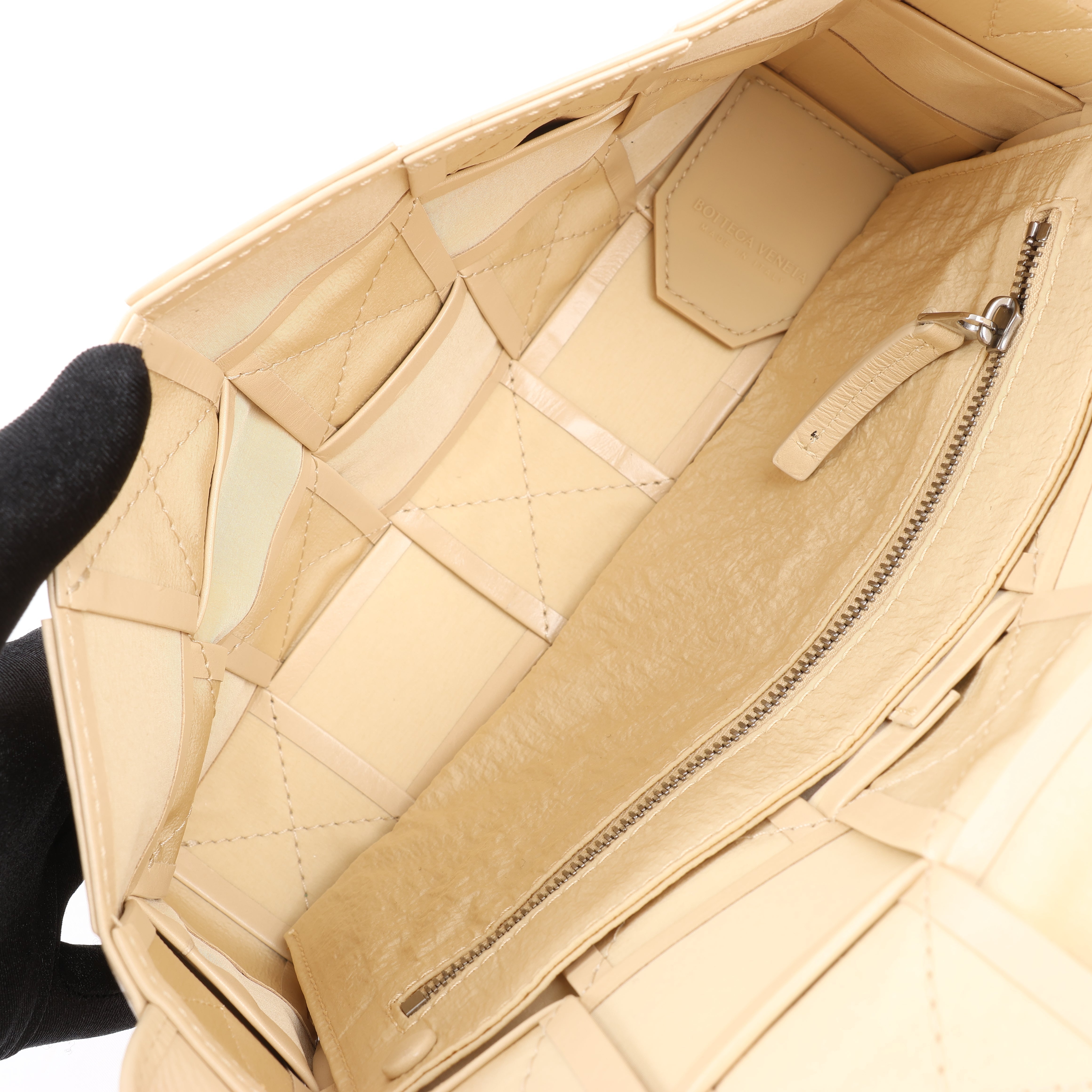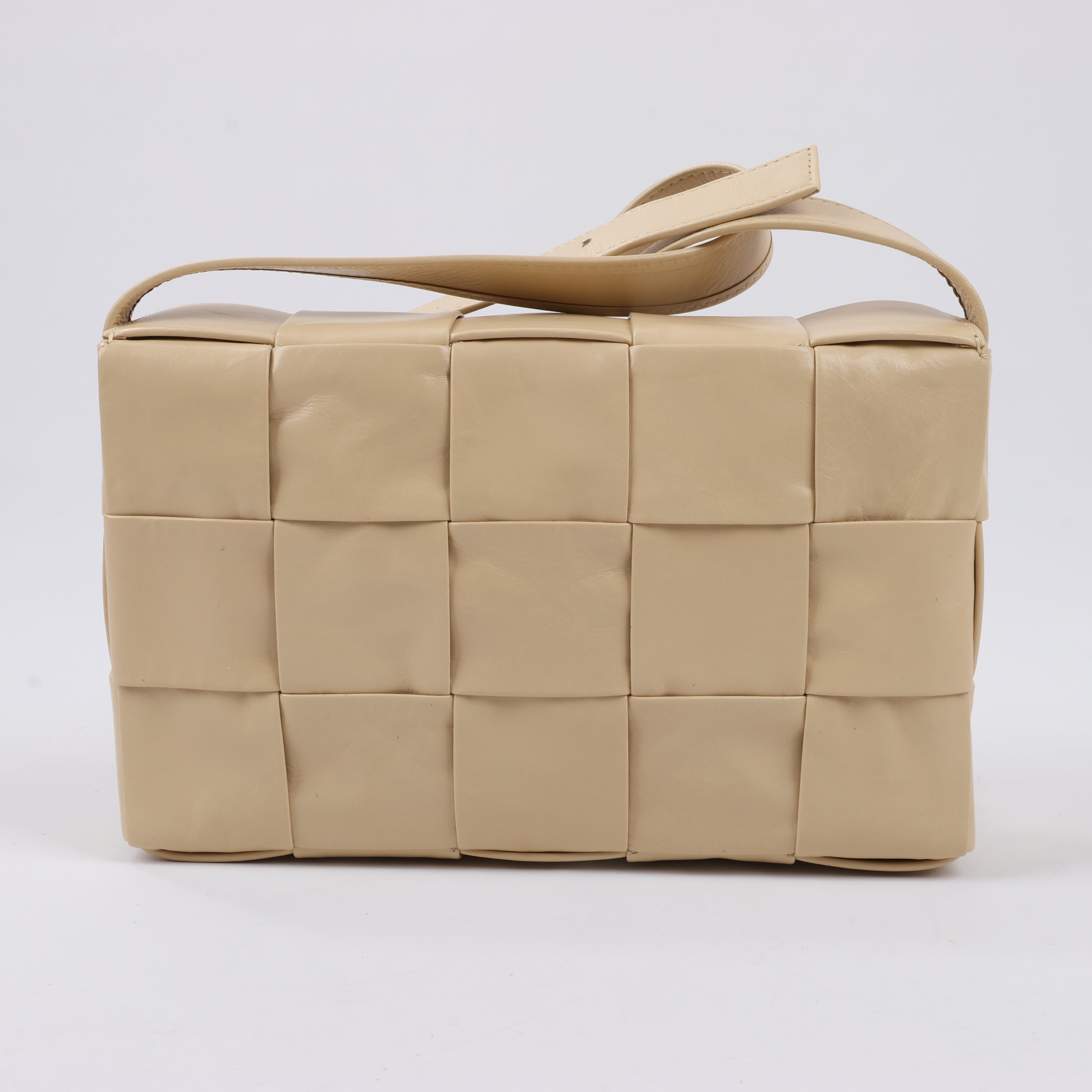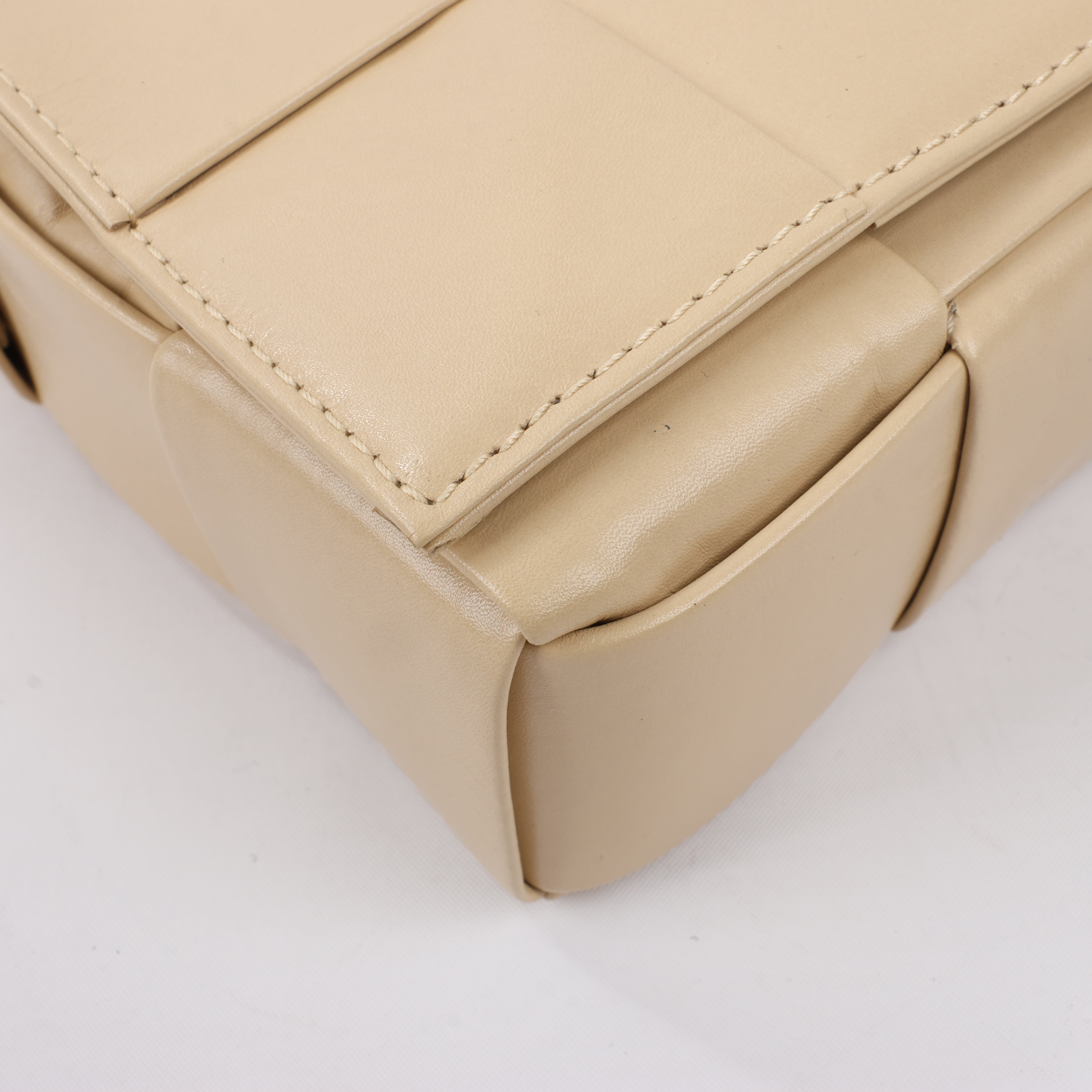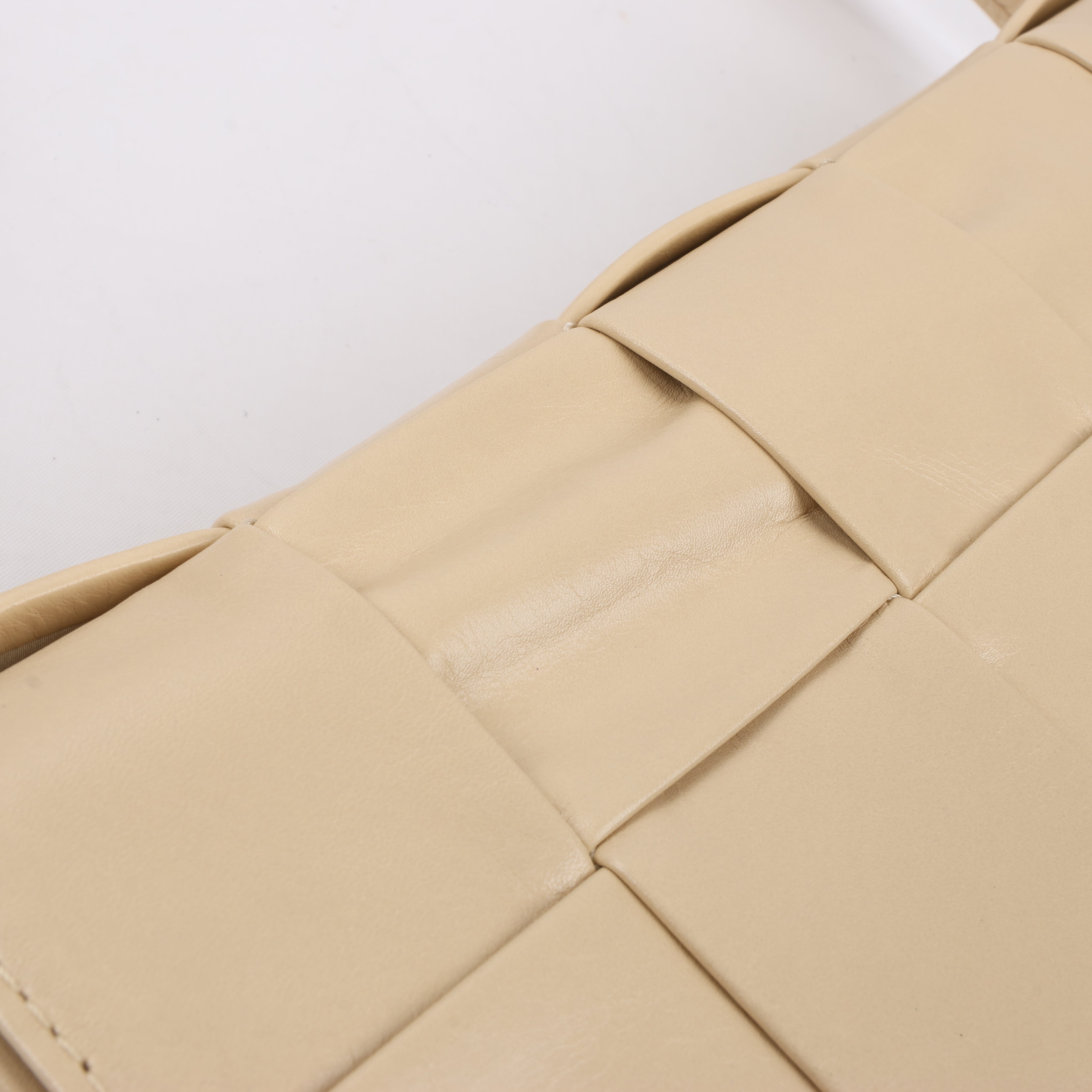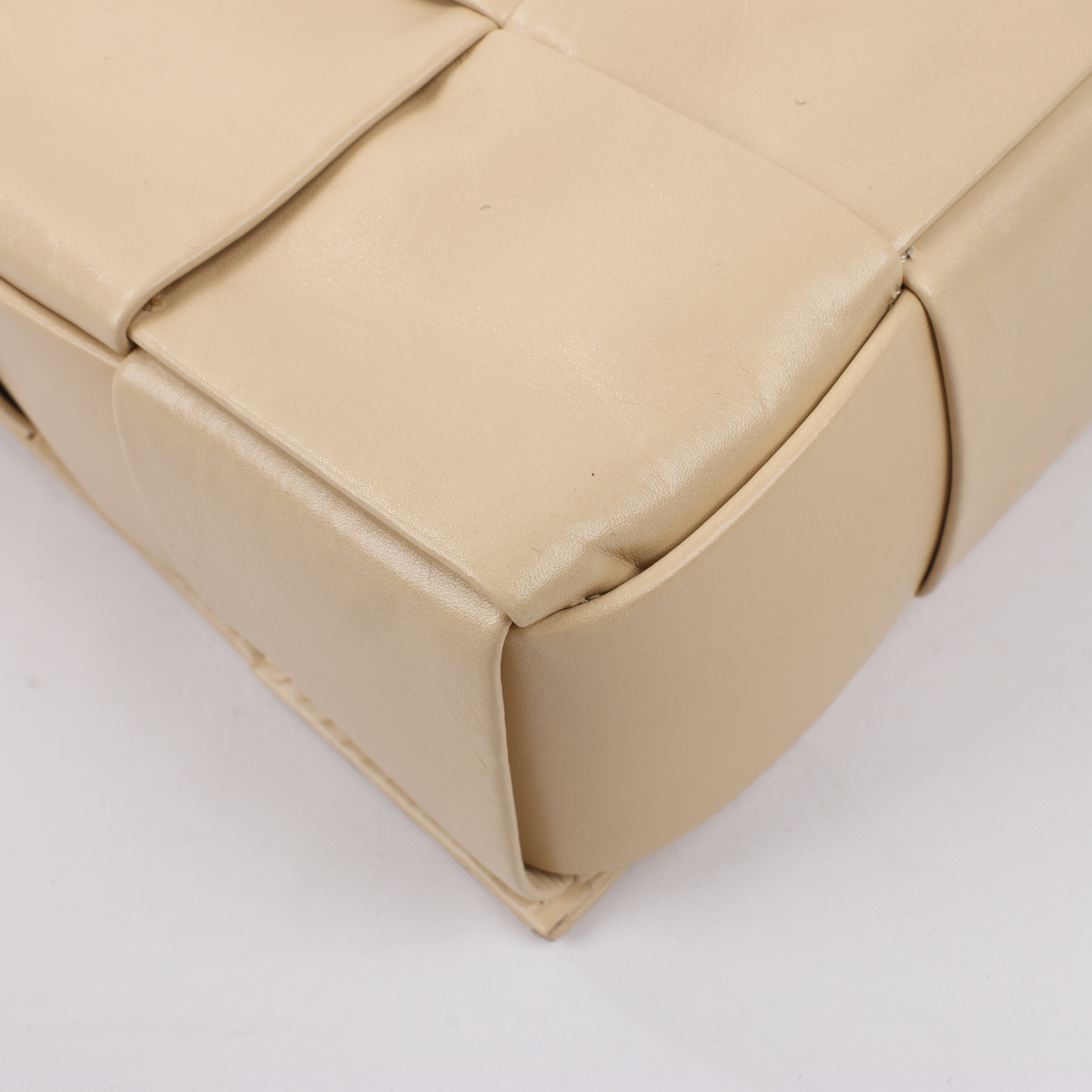 Brand: Bottega VenetaModel: Cassette Size: -Width: 22.5 cmHeight: 14.5 cmExterior Condition: ExcellentInterior Condition: ExcellentCondition Details: The exterior leather is clean and beautiful. The hardware is in great condition with light hairline scratches. The strap is in good condition with light creases. The interior is clean and in great condition, but has light one stripe stain.Colour: BeigeInterior Colour: BeigeHardware Colour: SilverMaterial: LeatherComes With: Dustbag