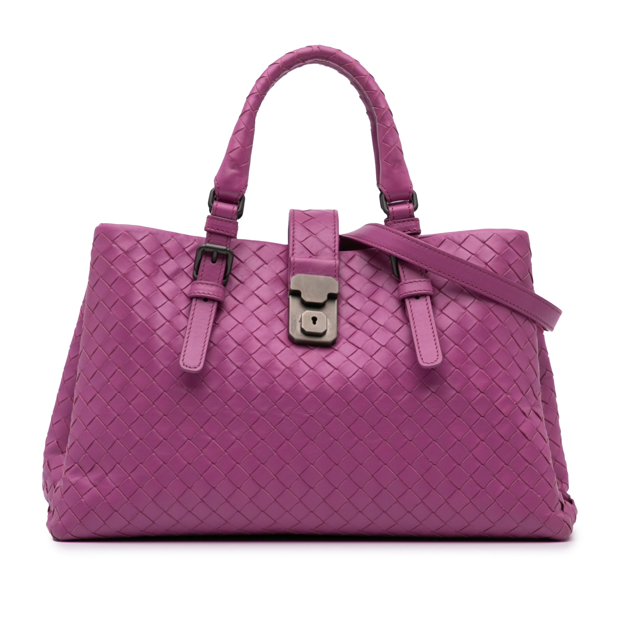 The Roma features a woven nappa leather body, rolled leather handles, detachable flat leather strap, a top strap with a push lock and magnetic closure, interior compartments, and interior zip and slip pockets. Retail Price: 3293.00