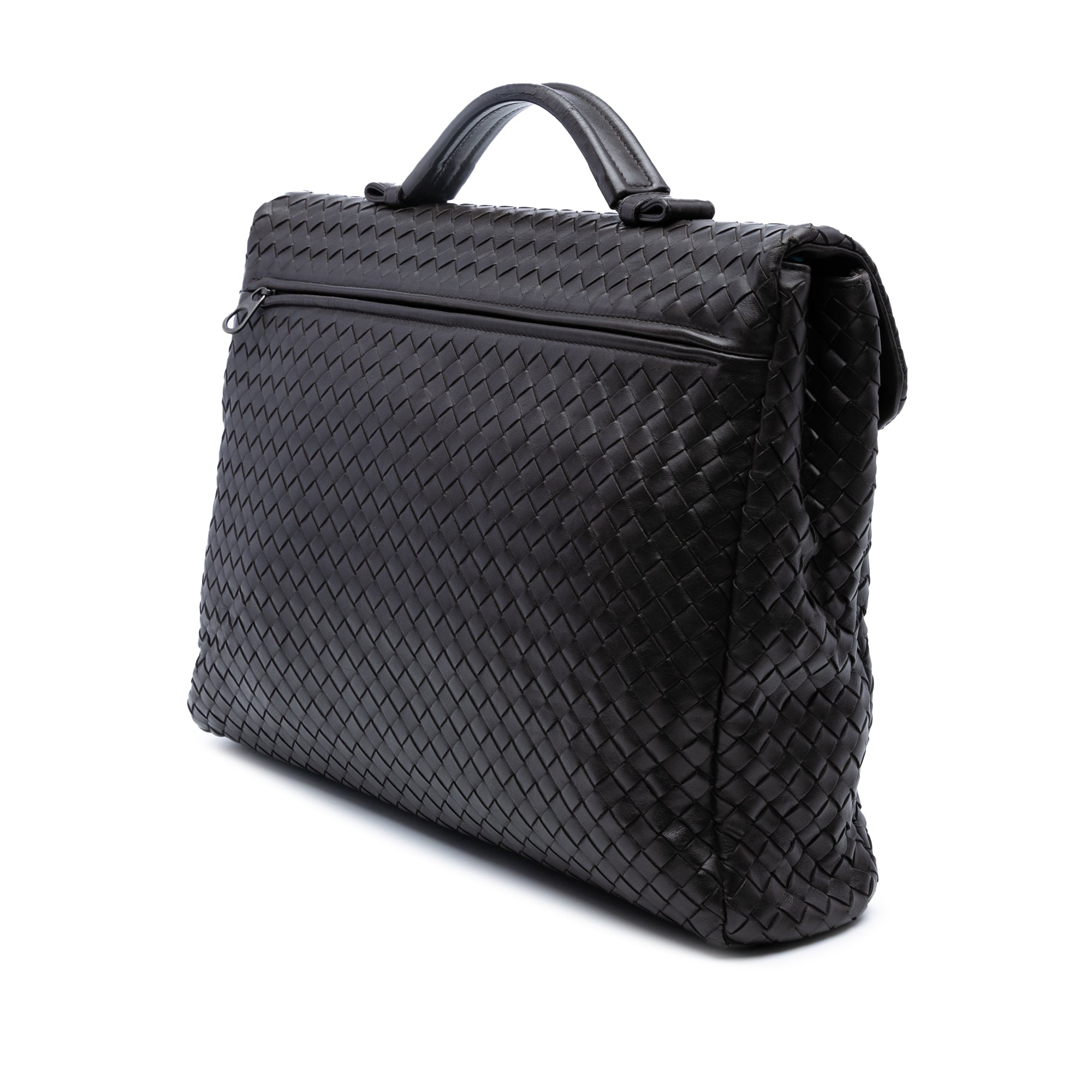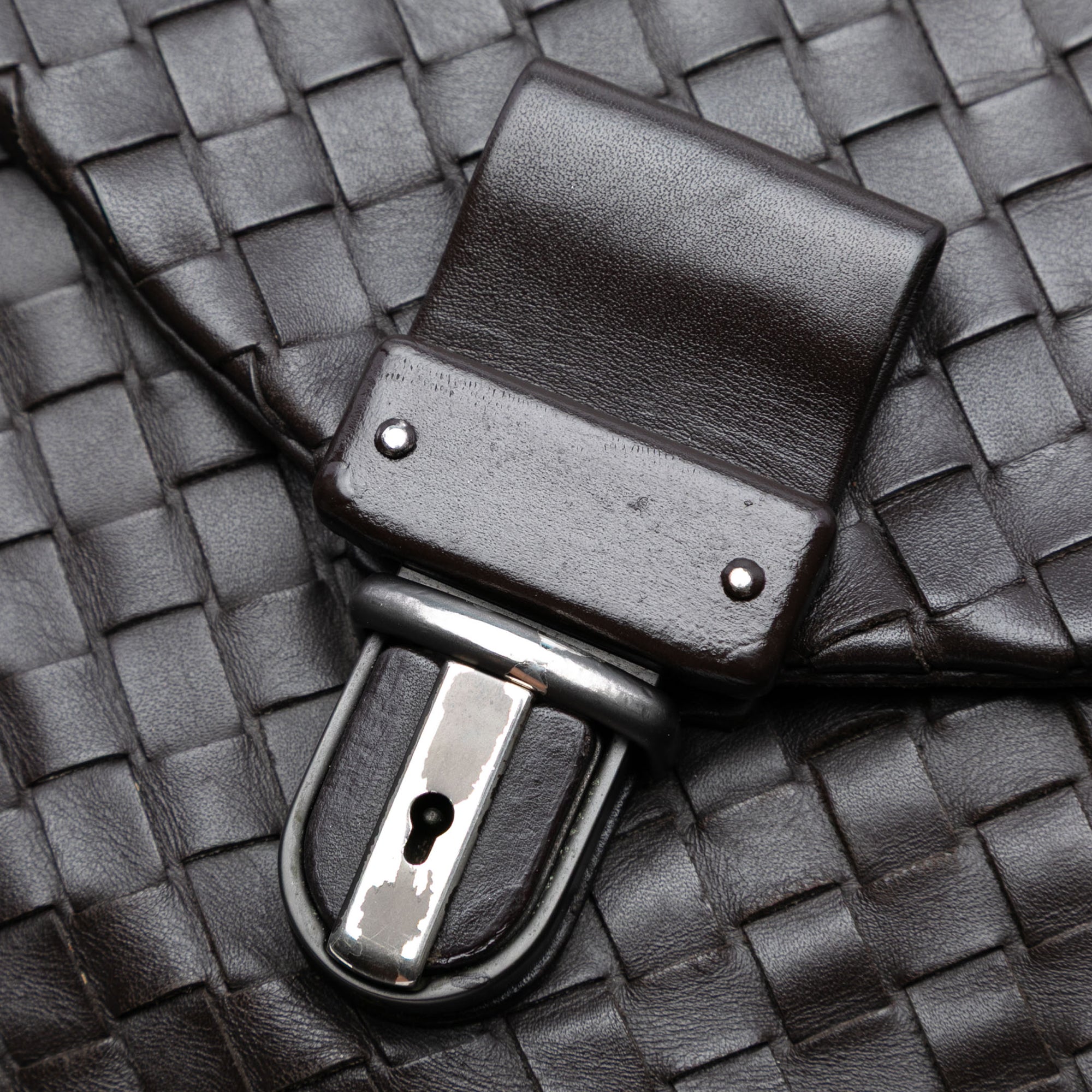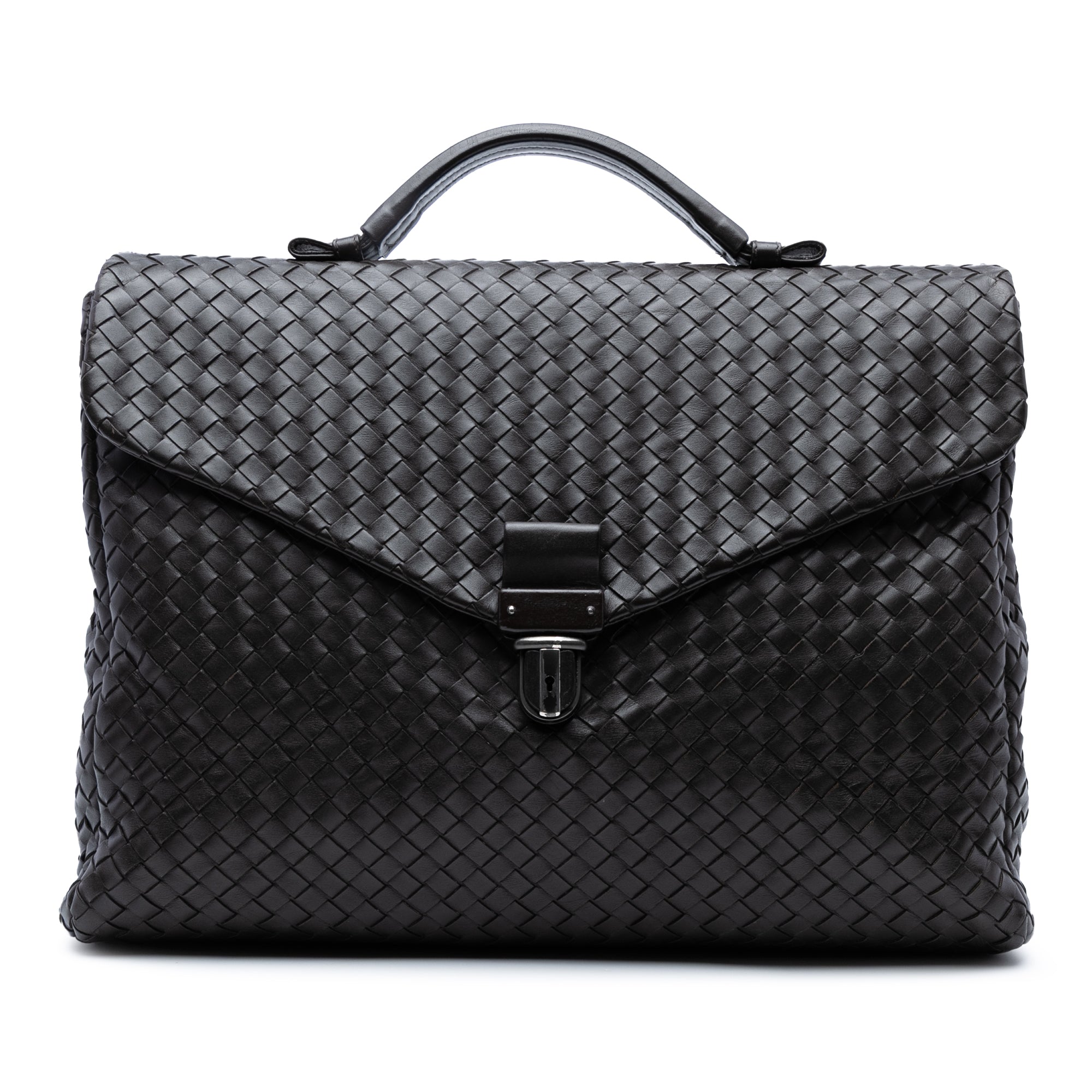 This business bag features a woven nappa leather body, a flat leather top handle, a front flap with a push lock closure, and an exterior back zip pocket. Retail Price: 2700.00