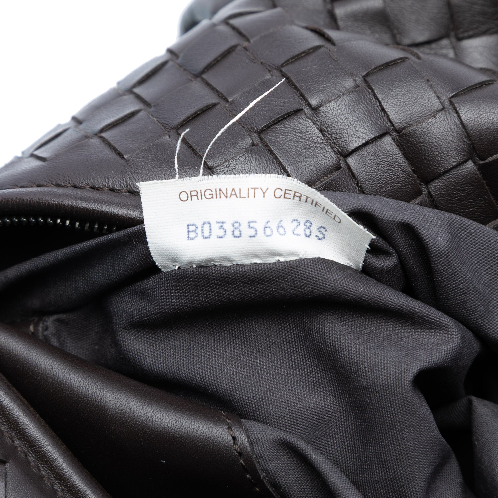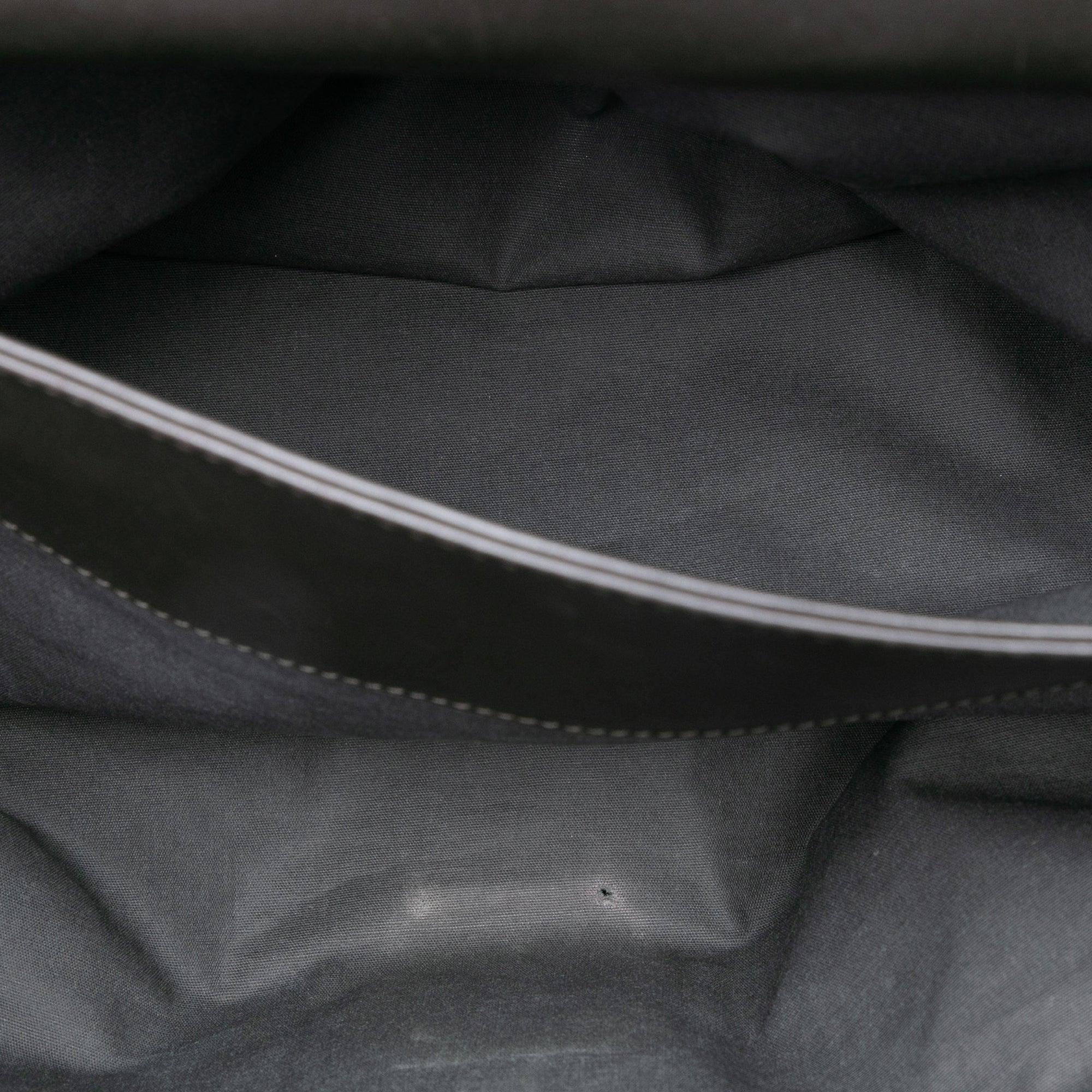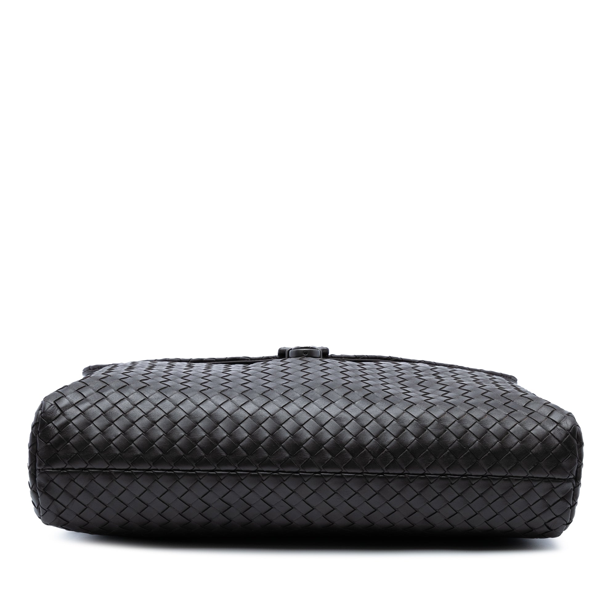 This business bag features a woven nappa leather body, a flat leather top handle, a front flap with a push lock closure, and an exterior back zip pocket. Retail Price: 2700.00