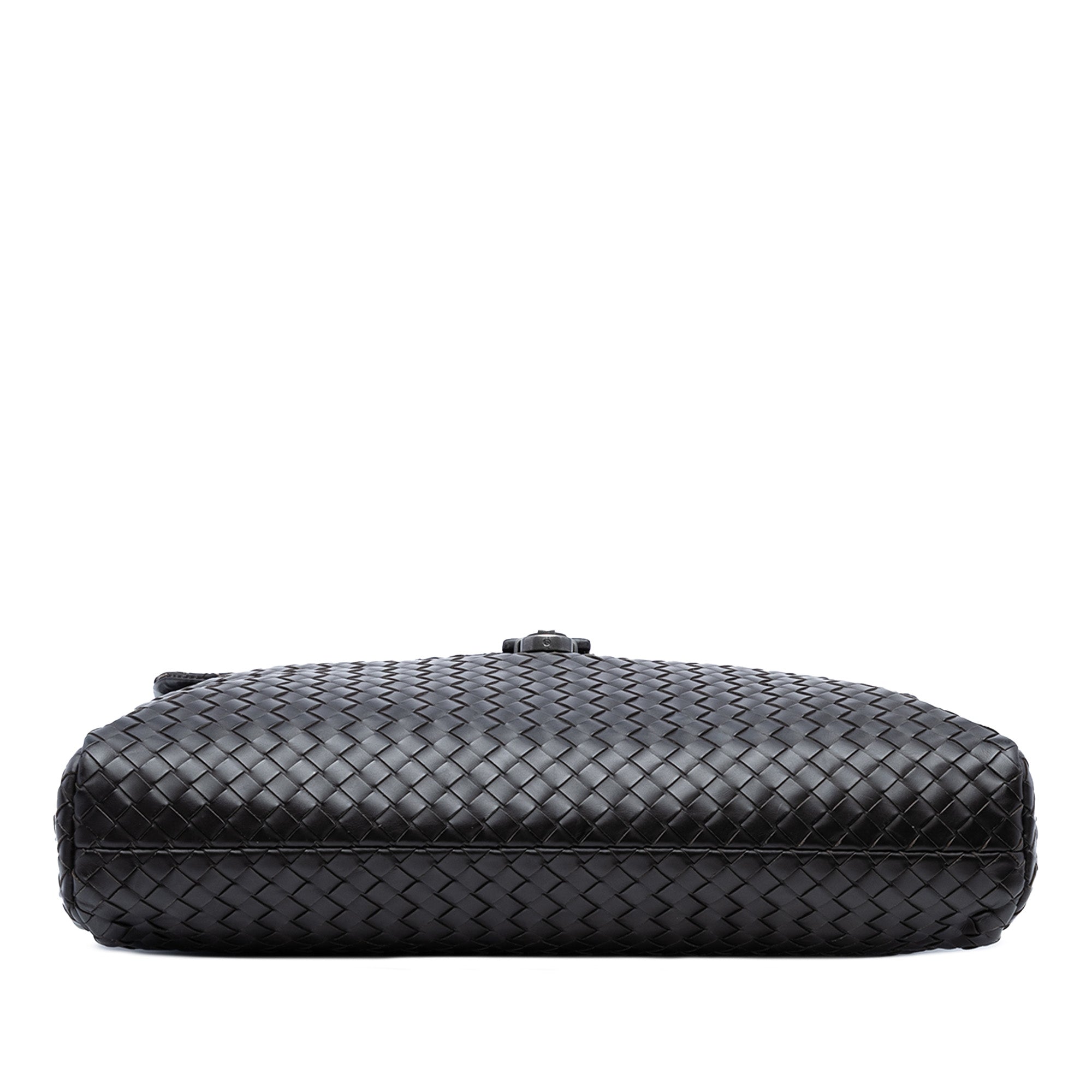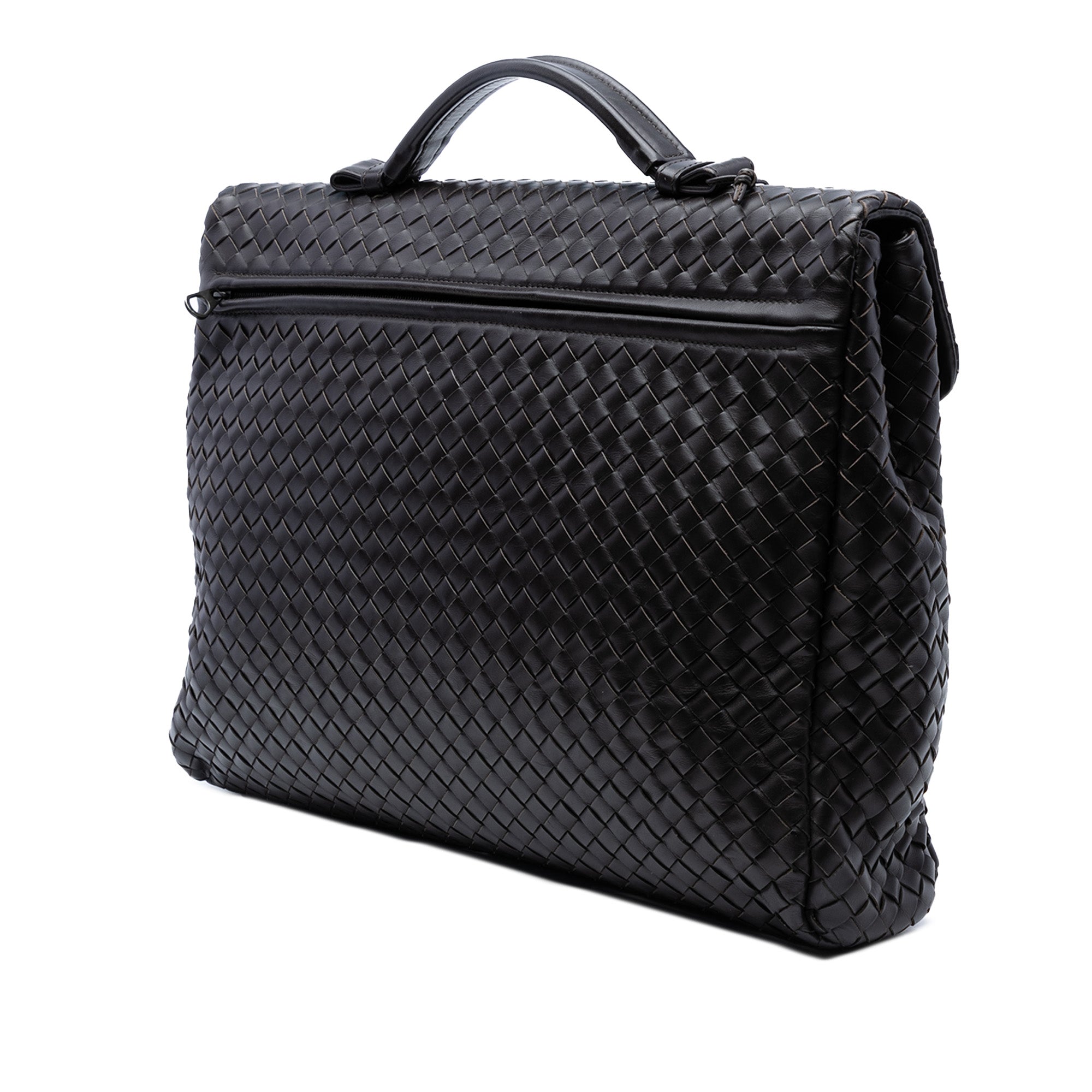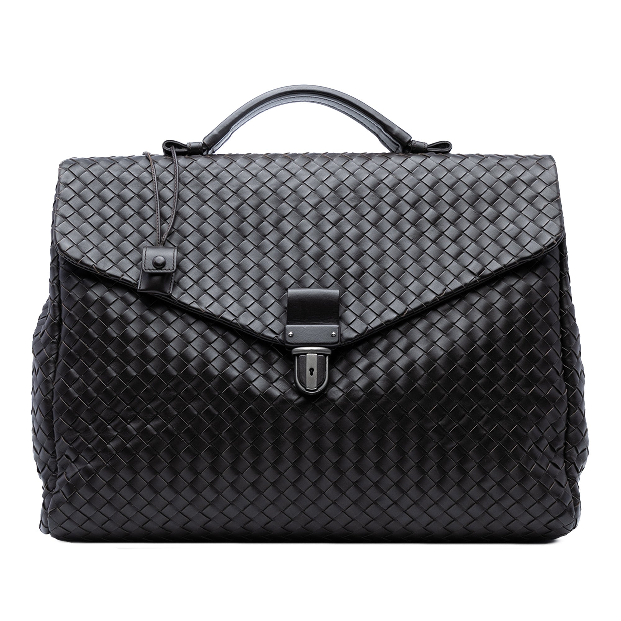 This business bag features a woven nappa leather body, a flat leather top handle, a front flap with a push lock closure, and an exterior back zip pocket. Retail Price: 2700.00