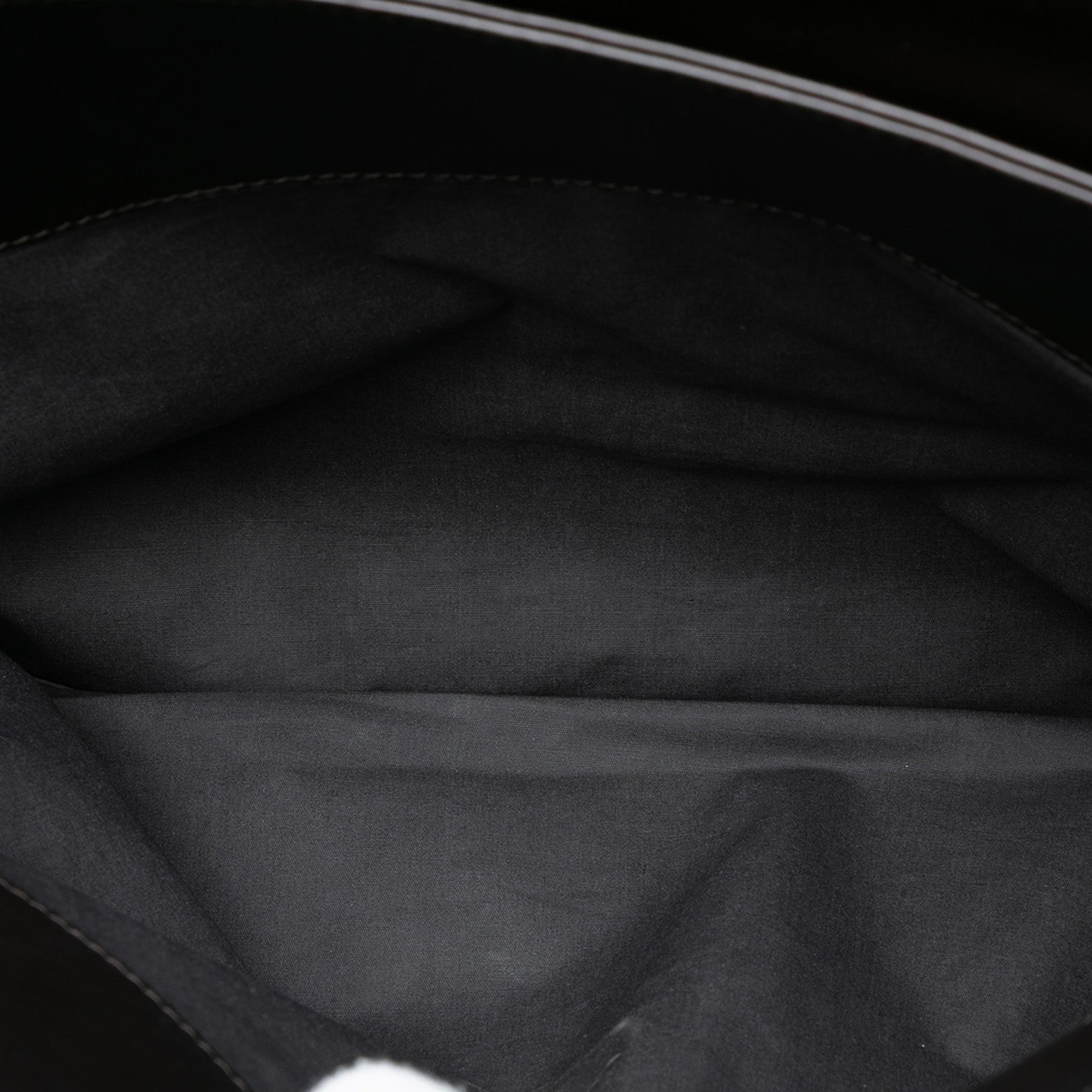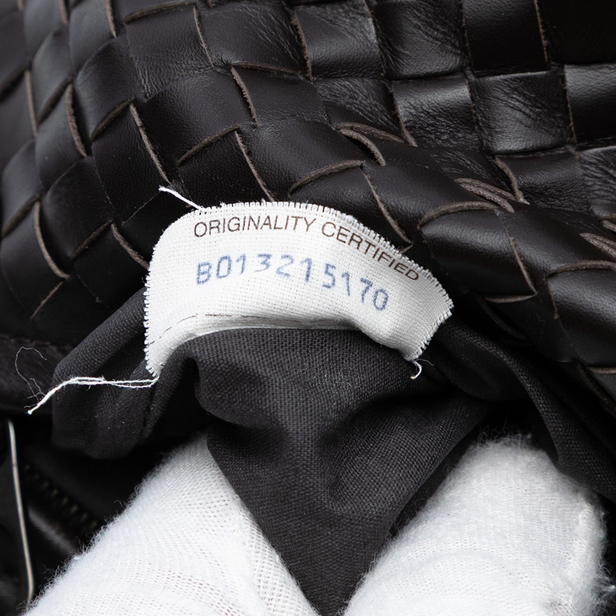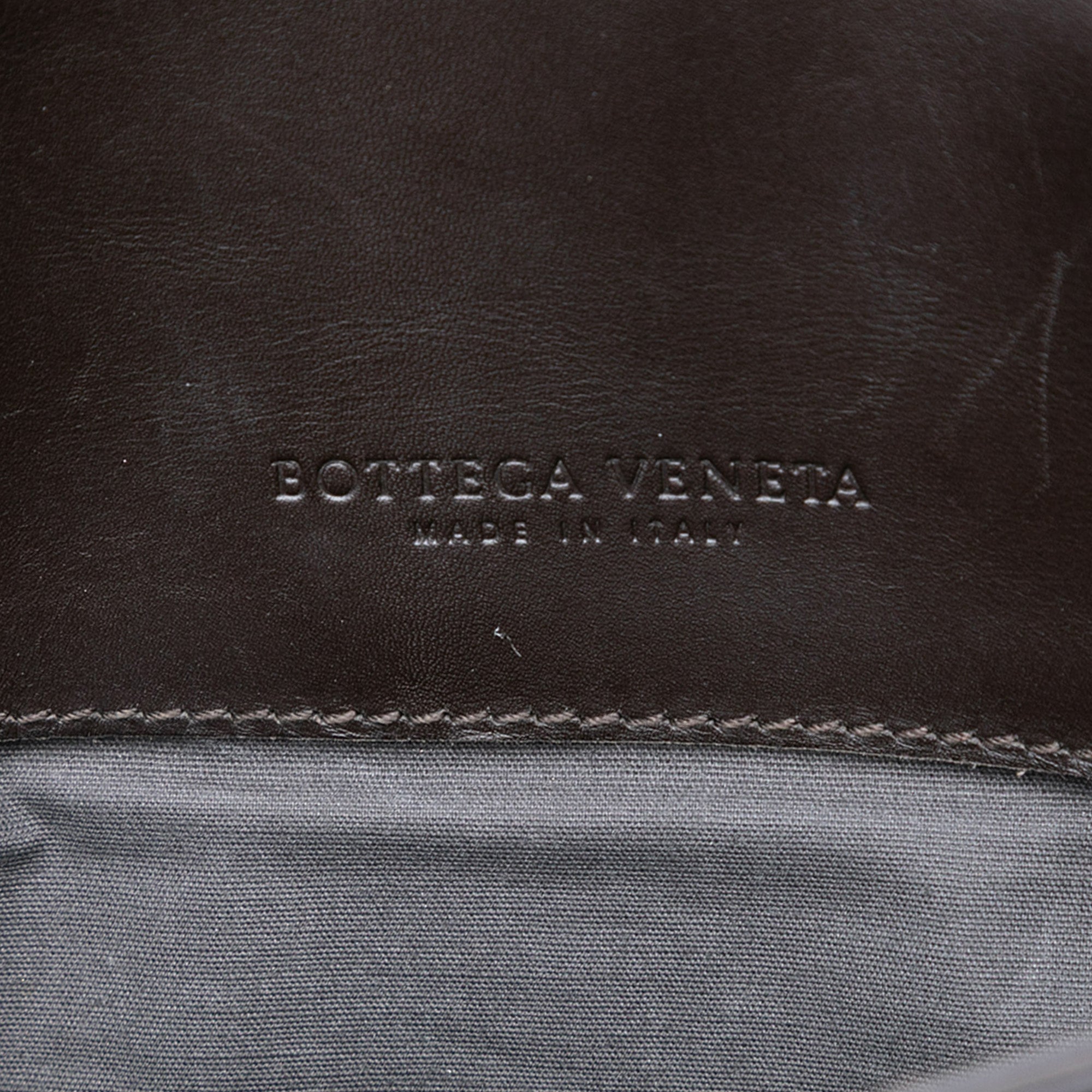This business bag features a woven nappa leather body, a flat leather top handle, a front flap with a push lock closure, and an exterior back zip pocket. Retail Price: 2700.00