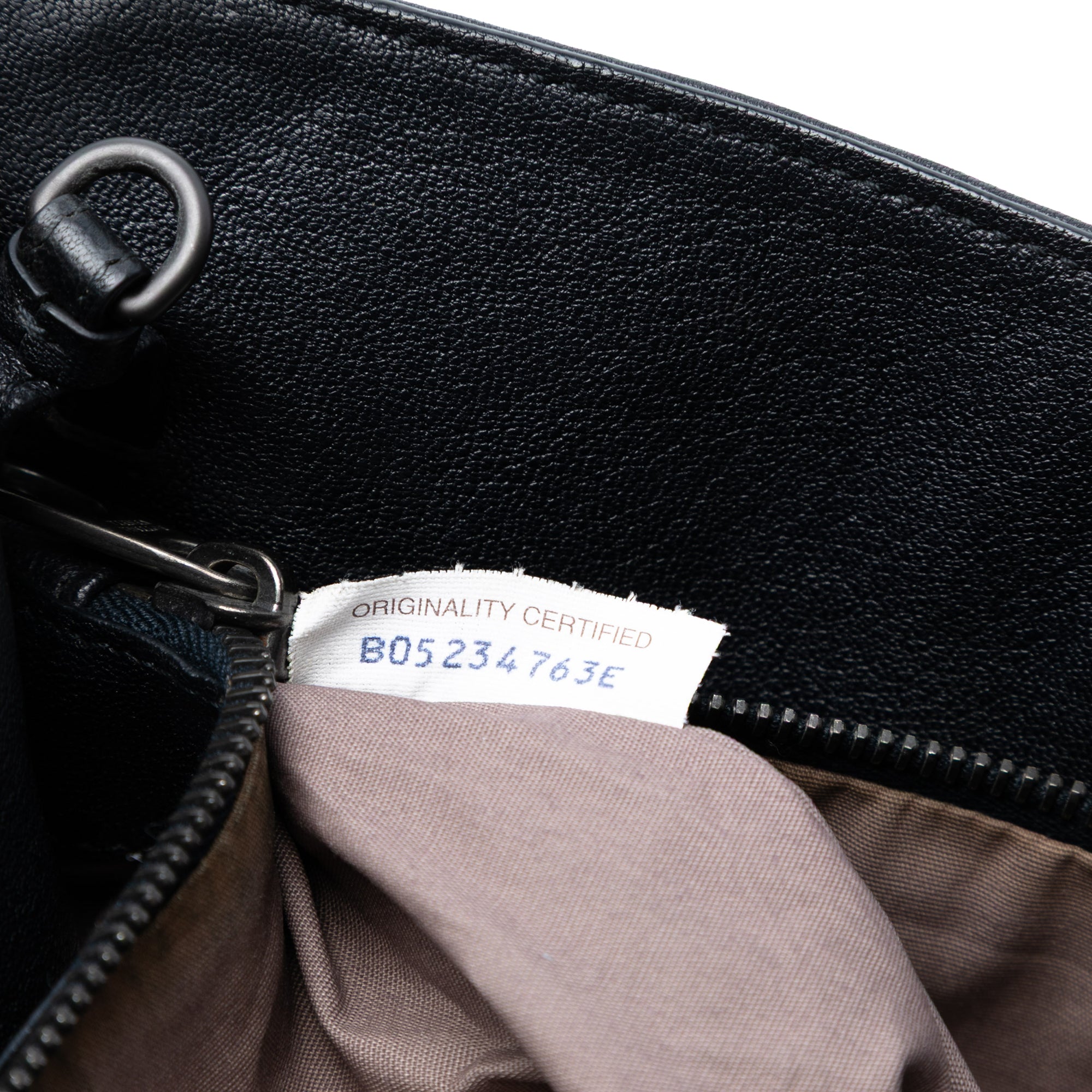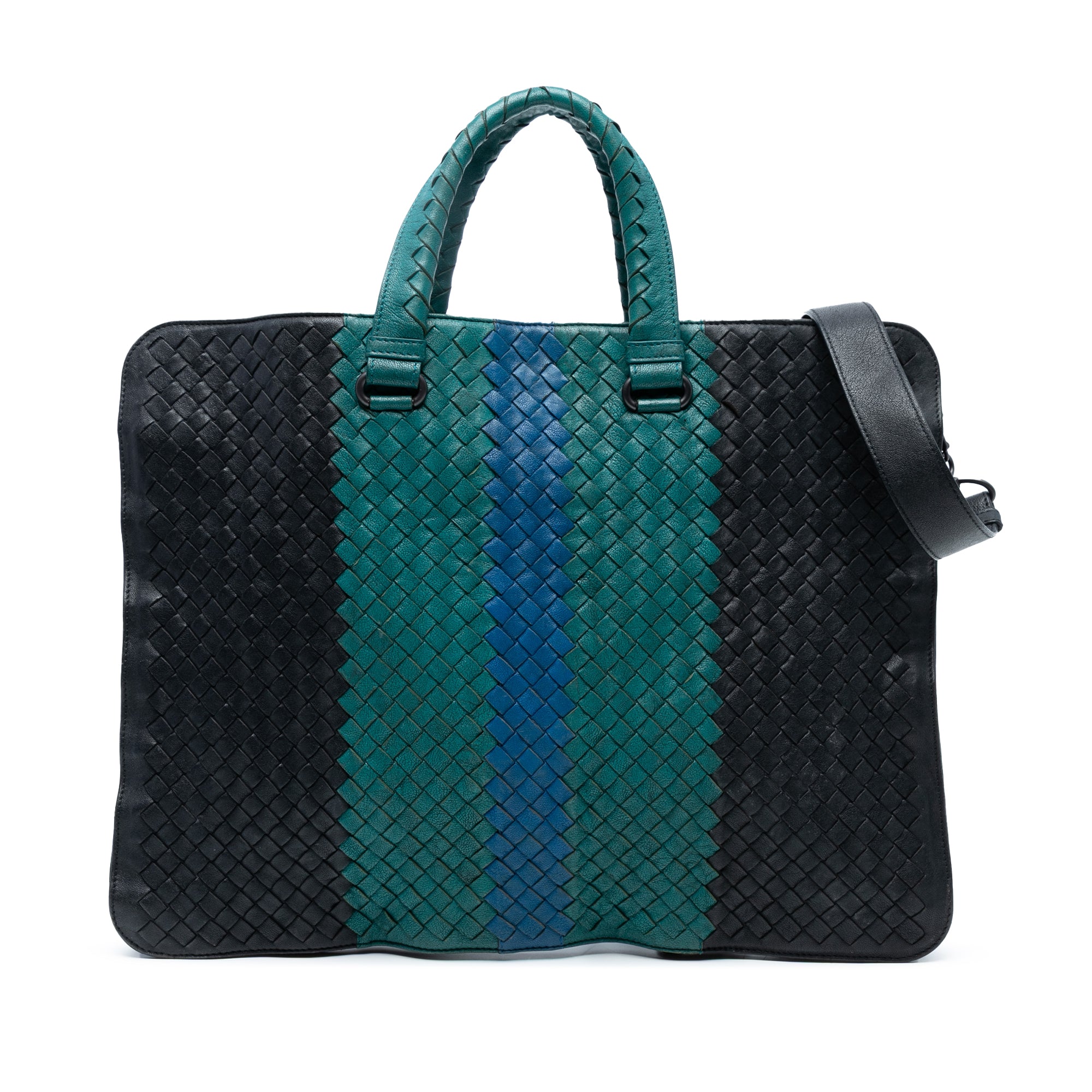 This business bag features a woven leather body, flat handles, a detachable strap, an open top, an interior zip compartment, and interior slip pockets. Retail Price: 3570.00