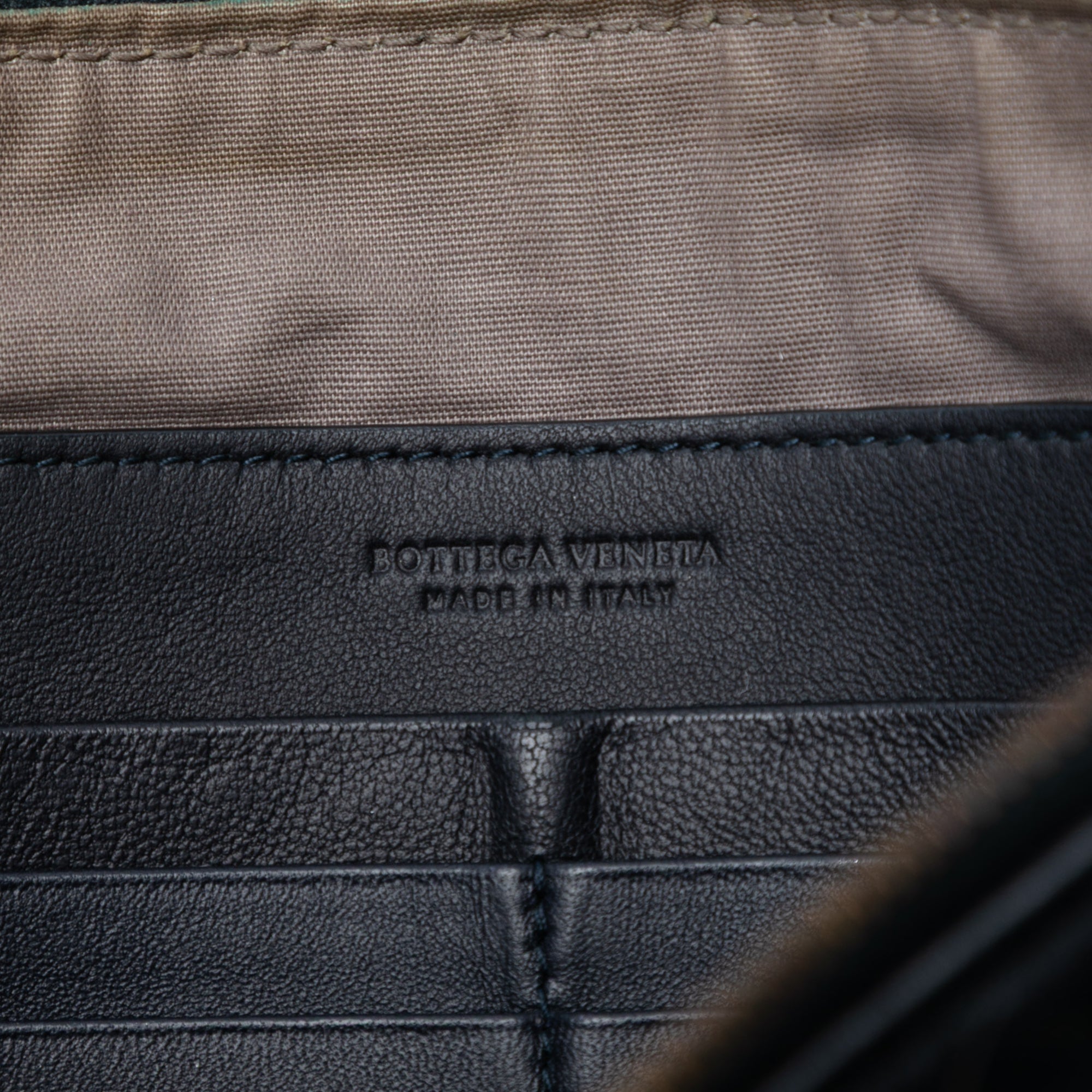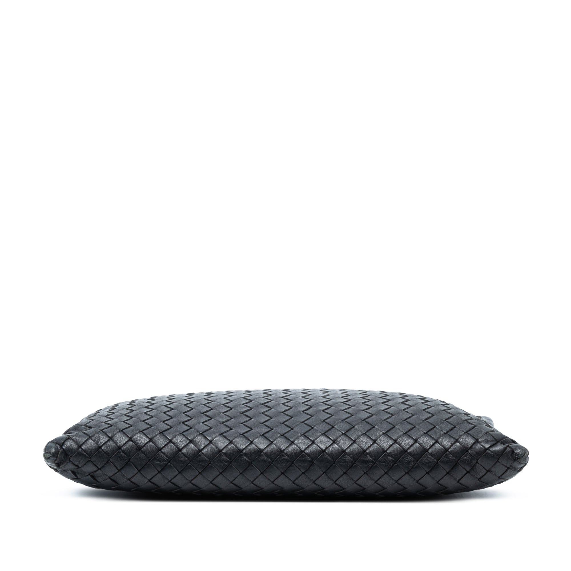 This clutch bag features a woven leather body, a top zip closure, and interior slip pockets. Retail Price: 1300.00