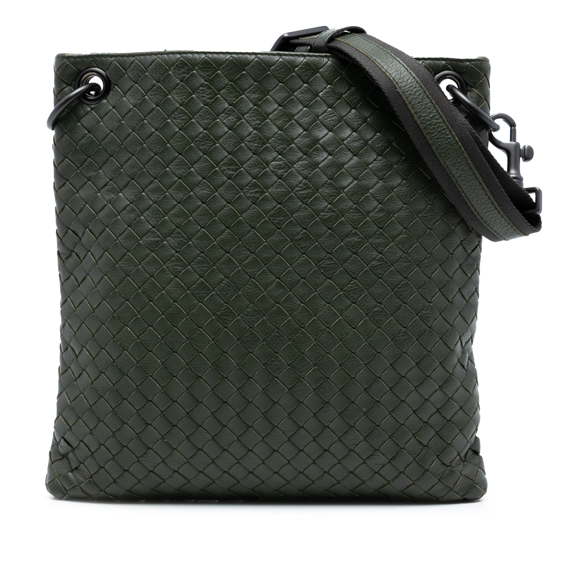 This crossbody bag features a woven leather body, an adjustable flat shoulder strap, an open top, and an interior zip pocket. Retail Price: 1670.00