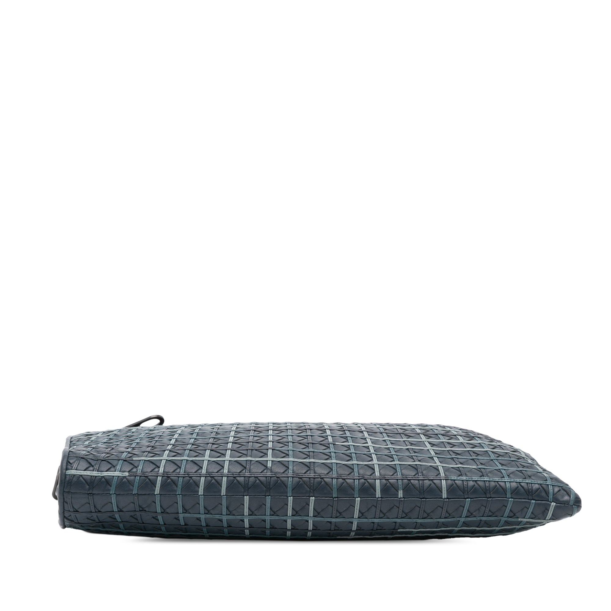 This clutch bag features a woven leather body, a top zip closure, an exterior zip pocket, and interior slip pockets. Retail Price: 1650.00