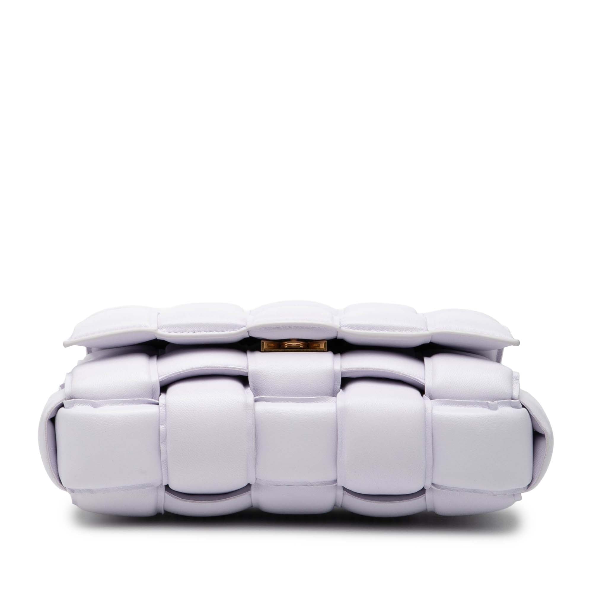 The Padded Cassette features a woven nappa leather body, a flat leather strap, a front flap with a clasp closure, and an interior zip pocket. Inclusion: Dust bag. Retail Price: 4633.00