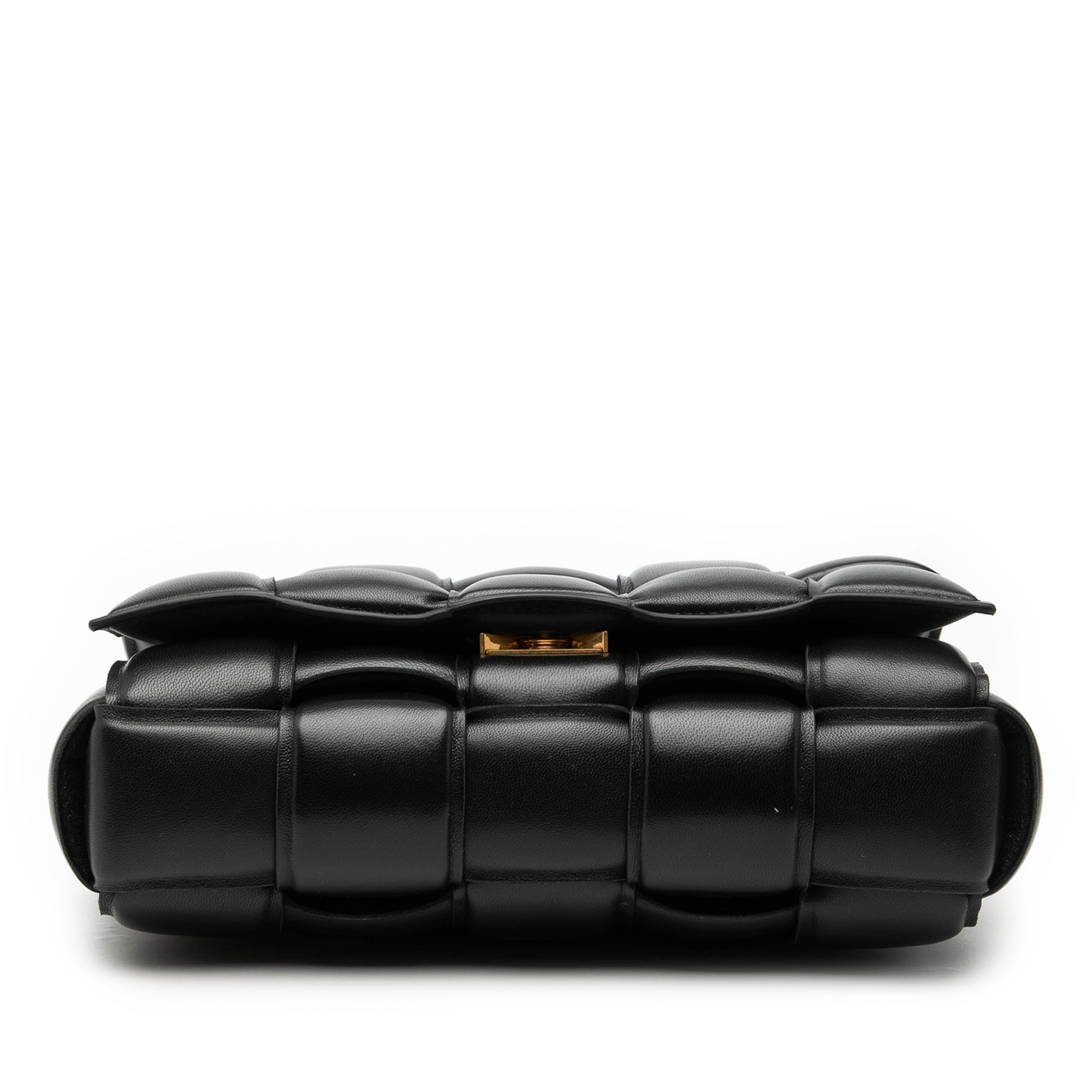 The Padded Cassette features a woven nappa leather body, a chain link handle, a chain link strap, a front flap with clasp closure, and an interior zip pocket. Inclusion: Dust bag. Retail Price: 3470.00