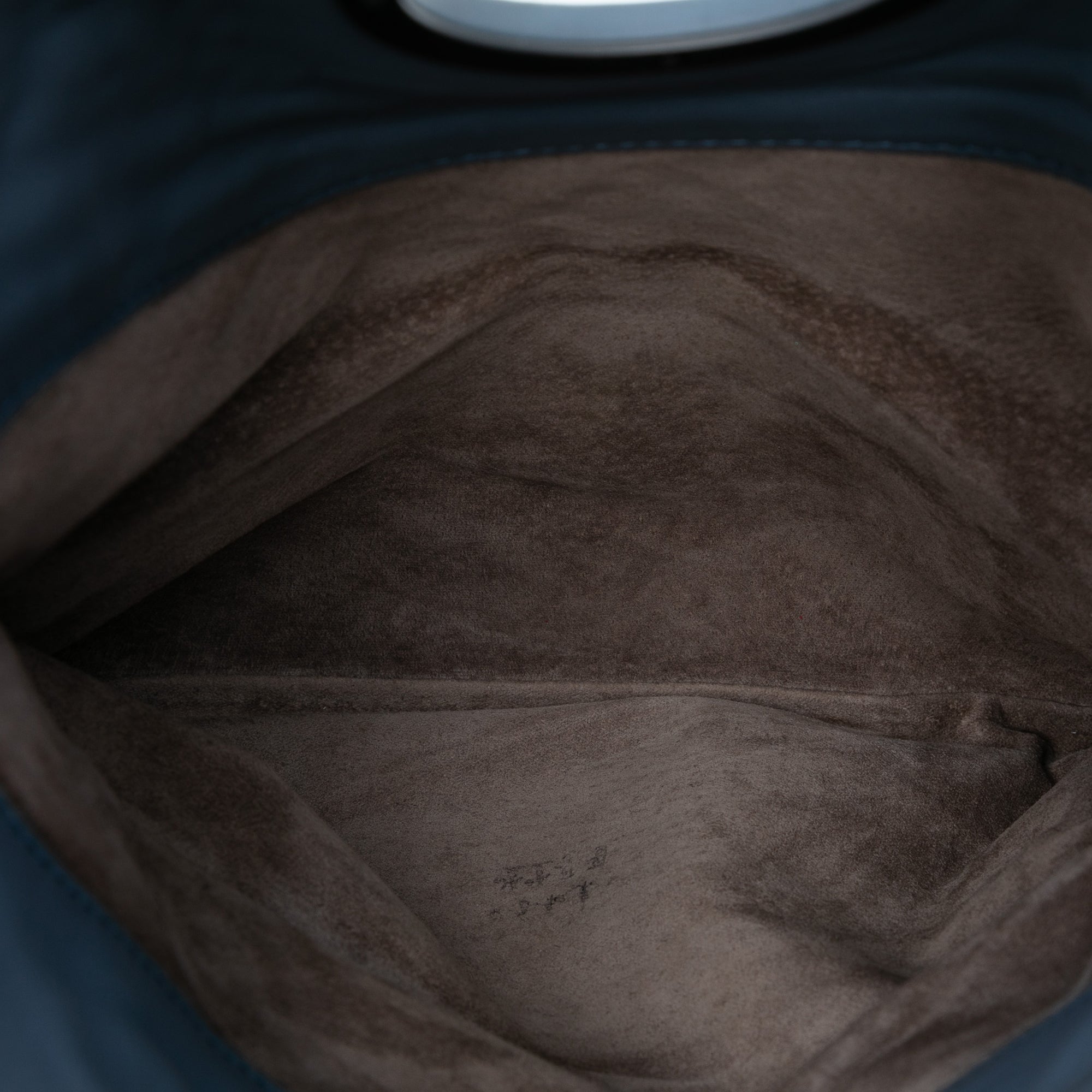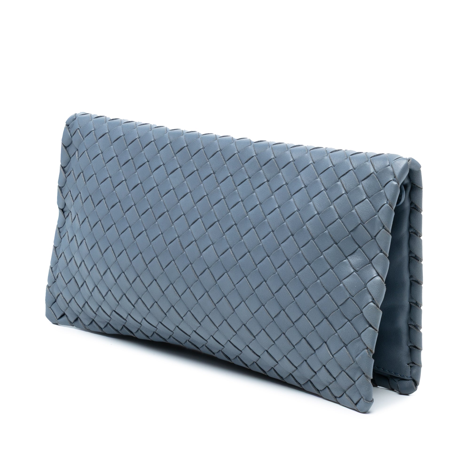 This clutch bag features a woven nappa leather body, a front flap with a turn lock closure, and an interior zip compartment. Retail Price: 1050.00