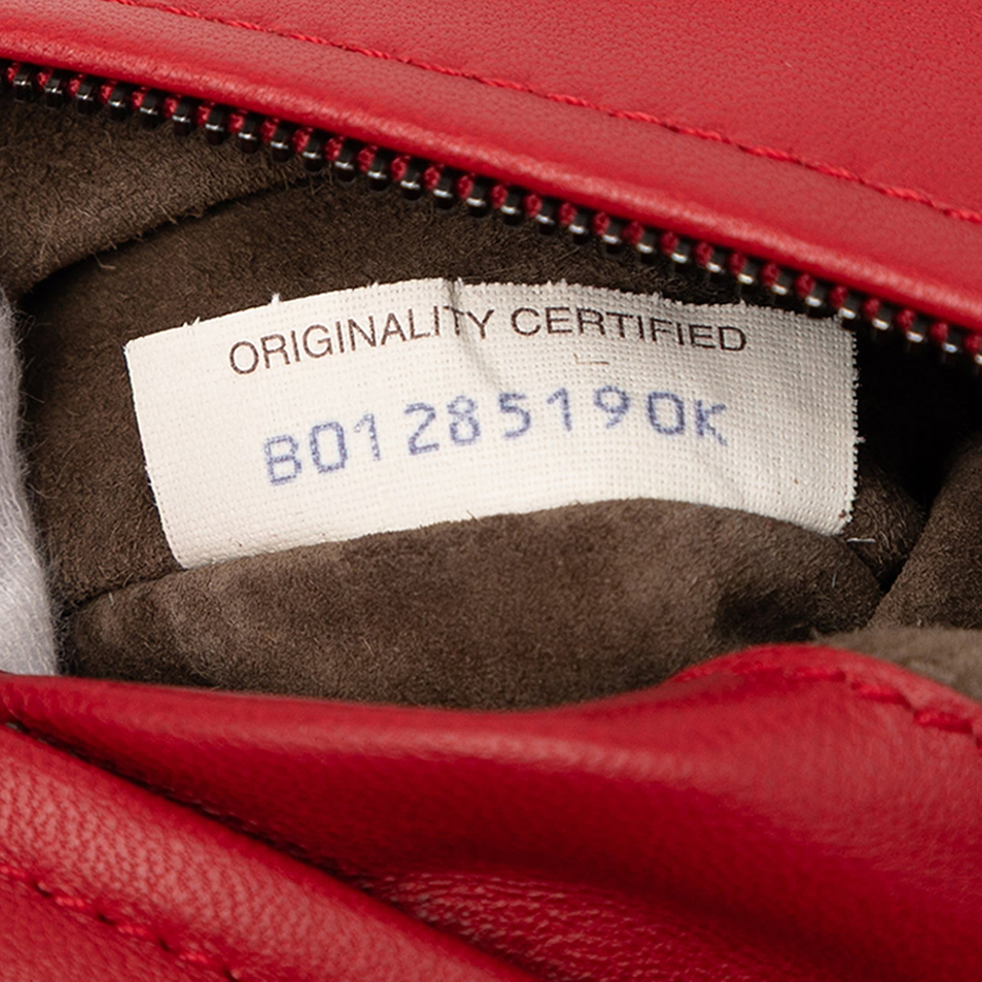 This clutch features a woven nappa leather body, a front flap with a turn lock closure, and an interior zip pocket. Retail Price: 950.00