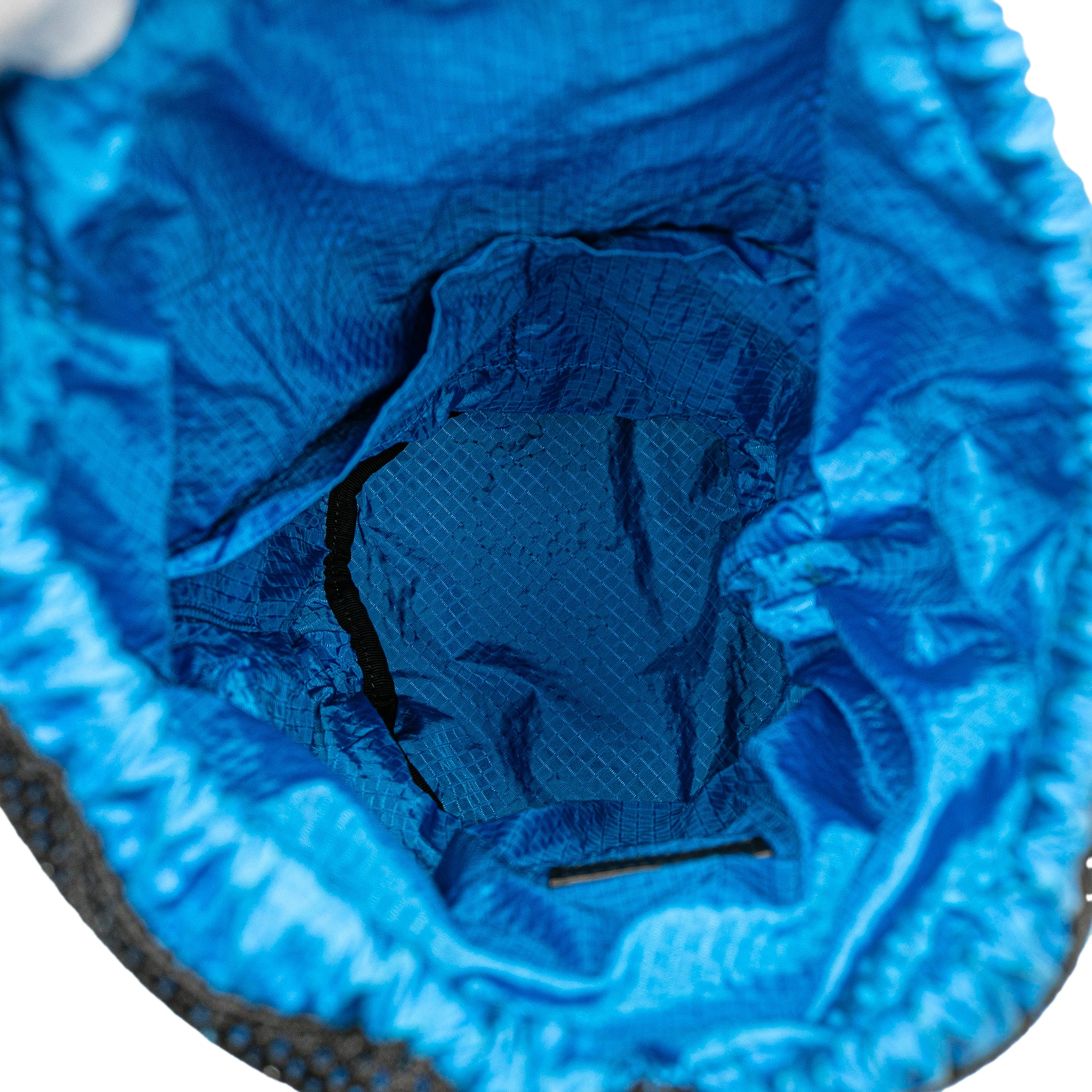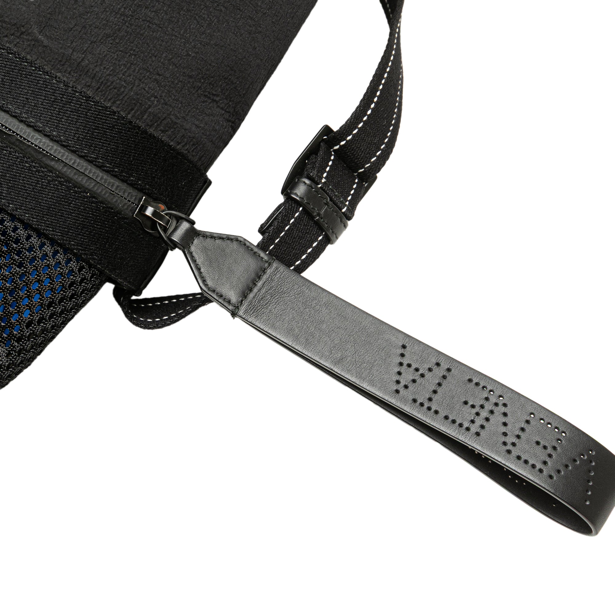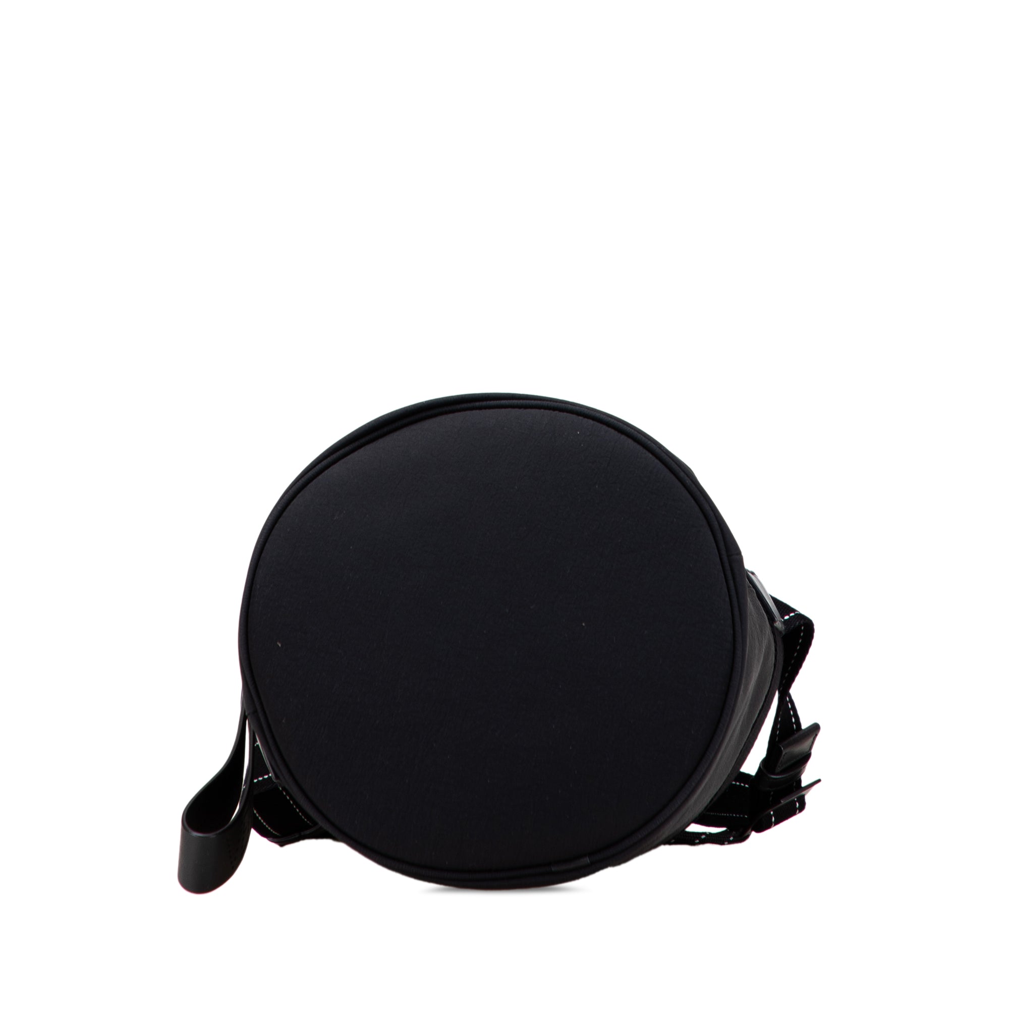 This bucket bag features a nylon and mesh body, a flat shoulder strap, a front zip pocket, and a top drawstring closure. Retail Price: 1290.00