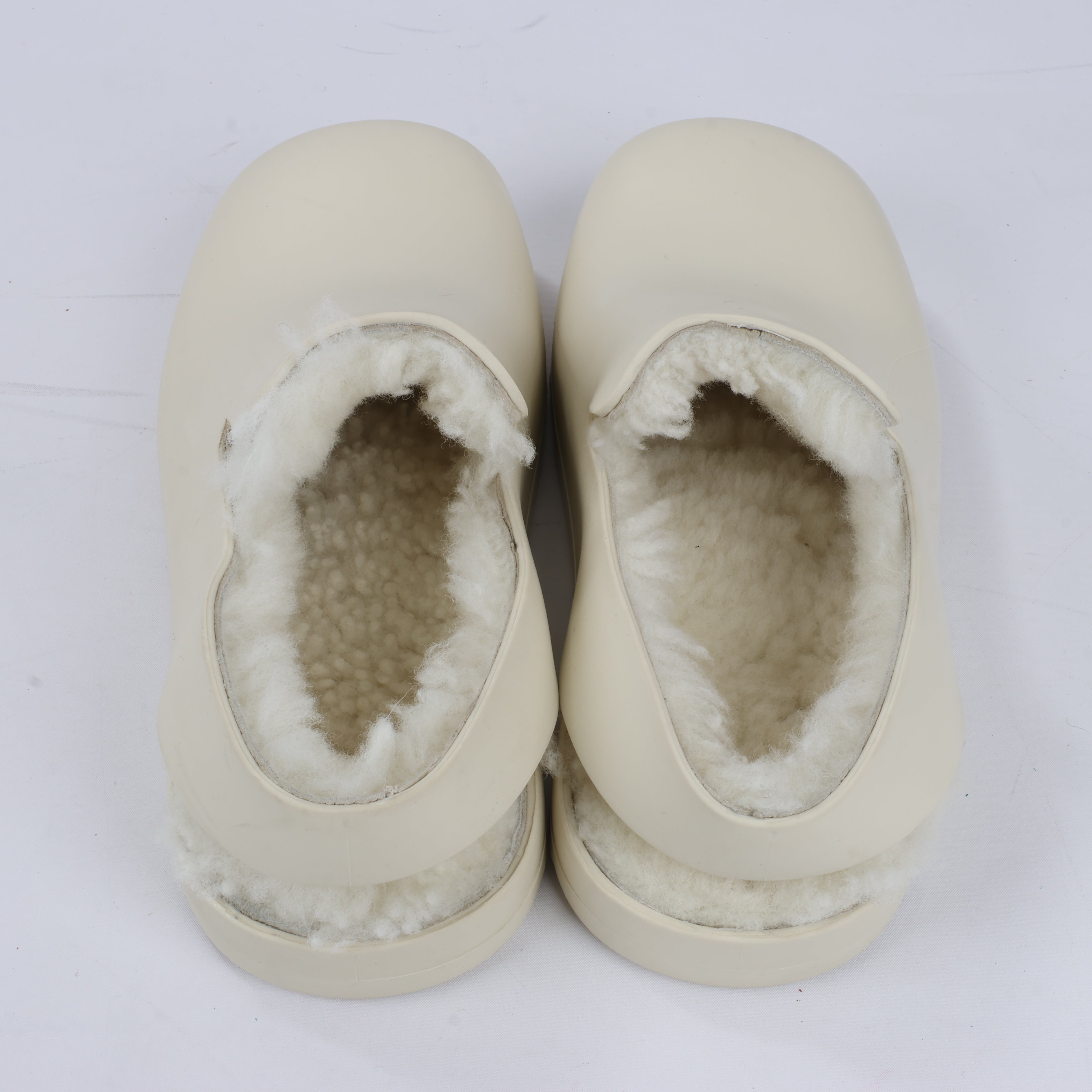 Bottega Veneta Puddle Shearling Cozy Low Top Shoes in Ivory, crafted from matte rubber for a sleek finish. Lined with plush shearling for ultimate comfort and warmth, these statement shoes combine modern design with functionality. Size and style for effortless wear.