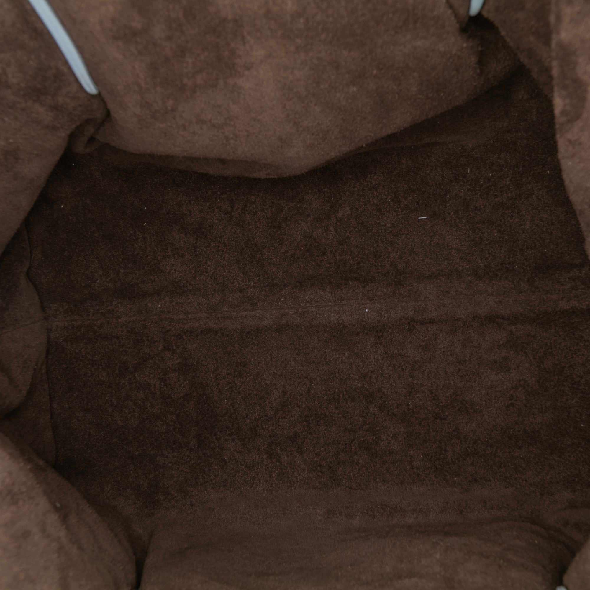 This satchel features a woven leather body, rolled leather top handles, a detachable and adjustable flat leather shoulder strap, an open top, and a pouch inclusion. Retail Price: 3500.00