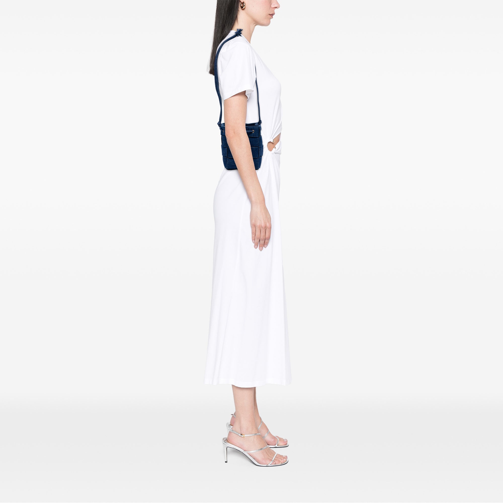 This bucket bag features a woven denim body, a denim shoulder strap, and an open top with a drawstring closure. Retail Price: 1800.00