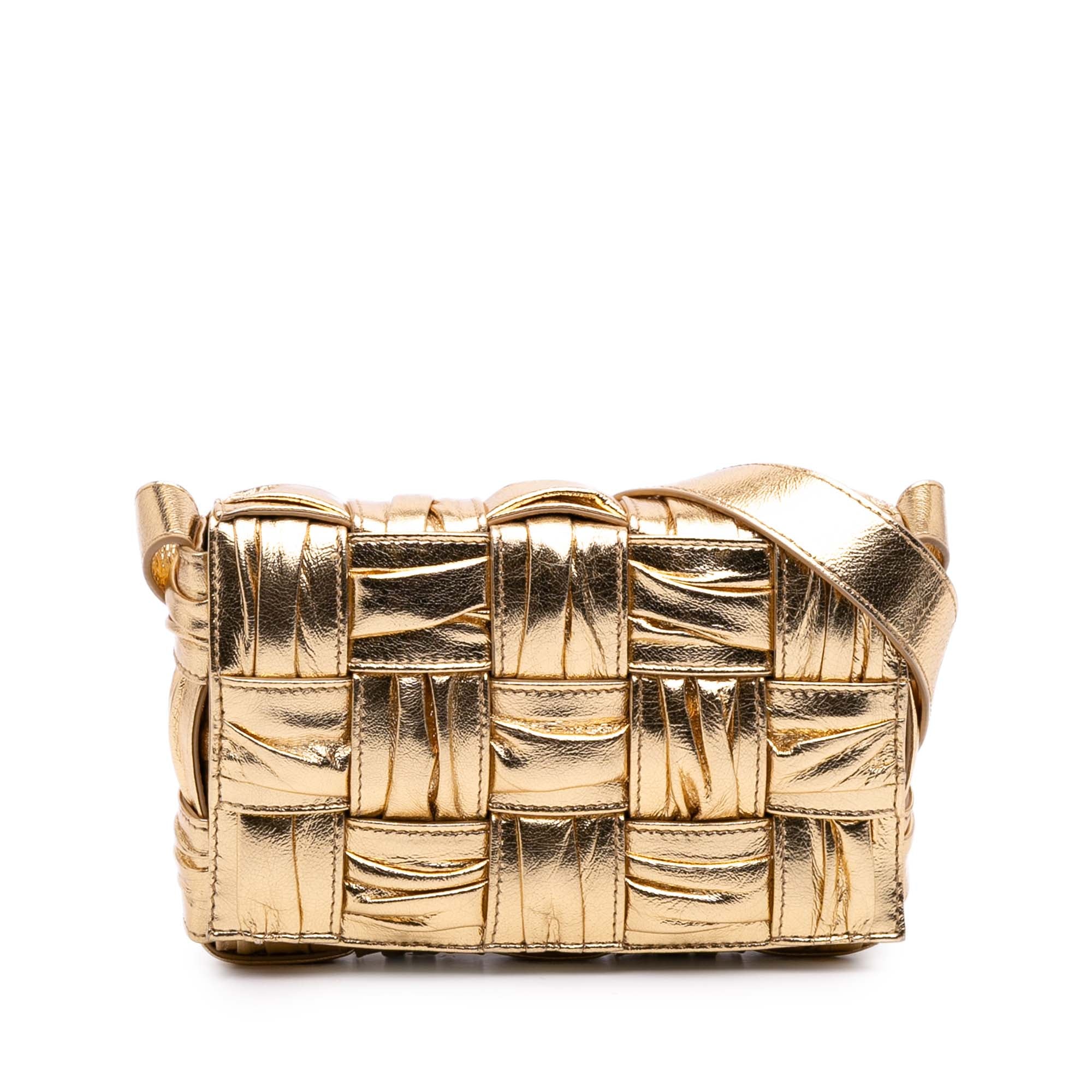 The Cassette features a metallic woven leather body, an adjustable flat leather shoulder strap, a flap with push lock closure, and an interior zip pocket. Inclusion: Dust bag. Retail Price: 4500.00
