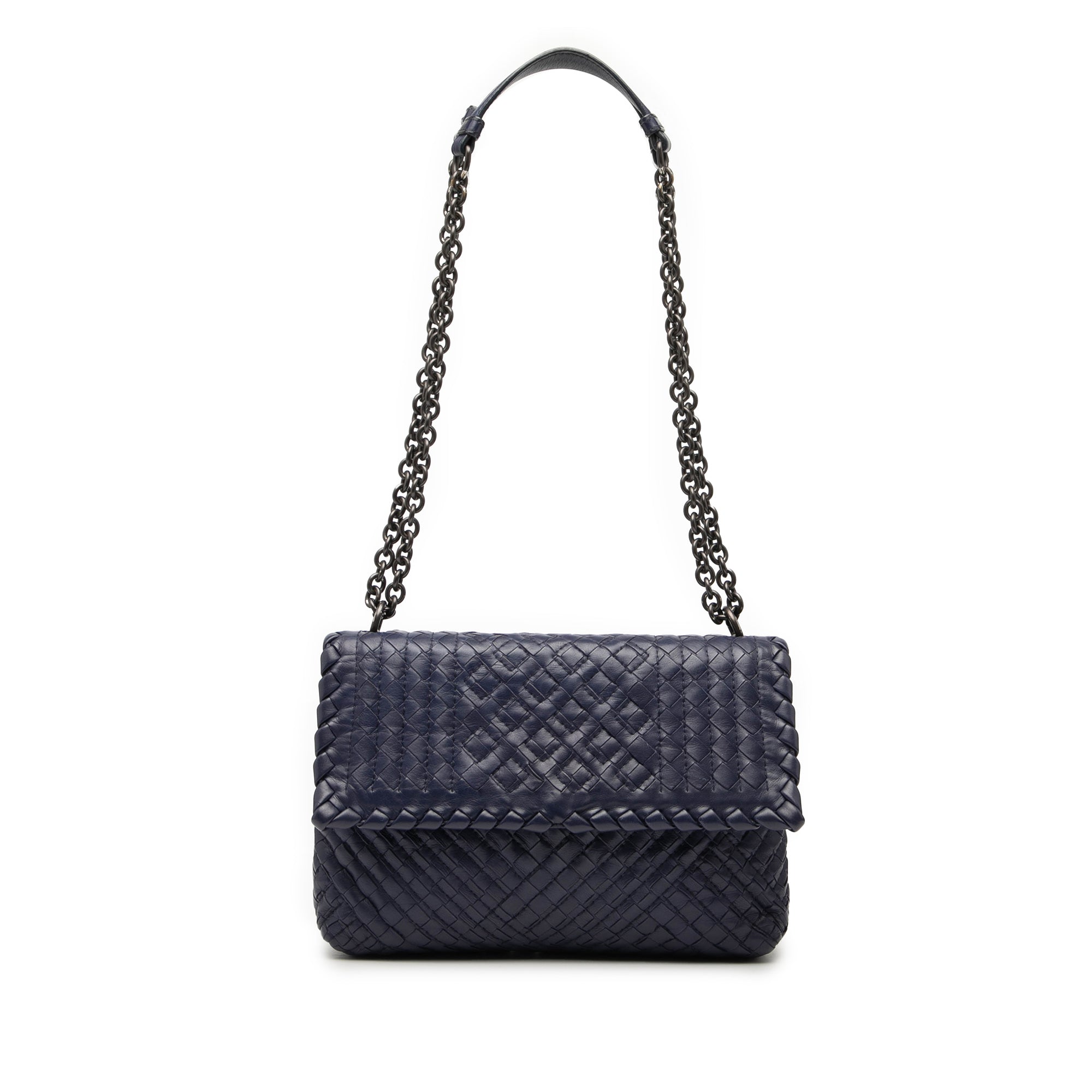 The Olimpia features a woven leather body, chain link shoulder straps with leather guard, a flap with magnetic snap closure, and an interior zip pocket. Retail Price: 2500.00