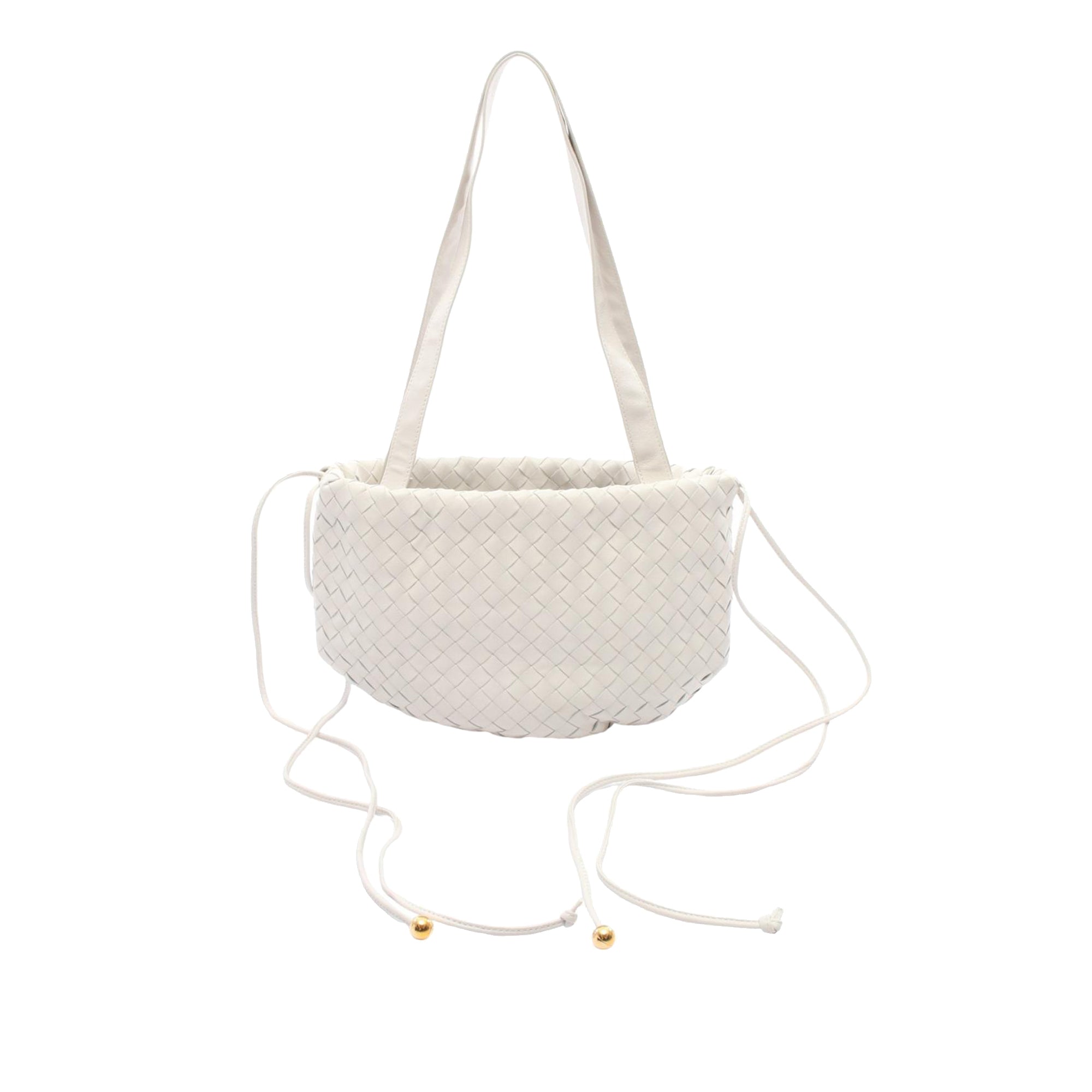 The Intrecciato Bulb features a woven leather body, flat leather handles and a drawstring closure. Retail Price: 1795.00
