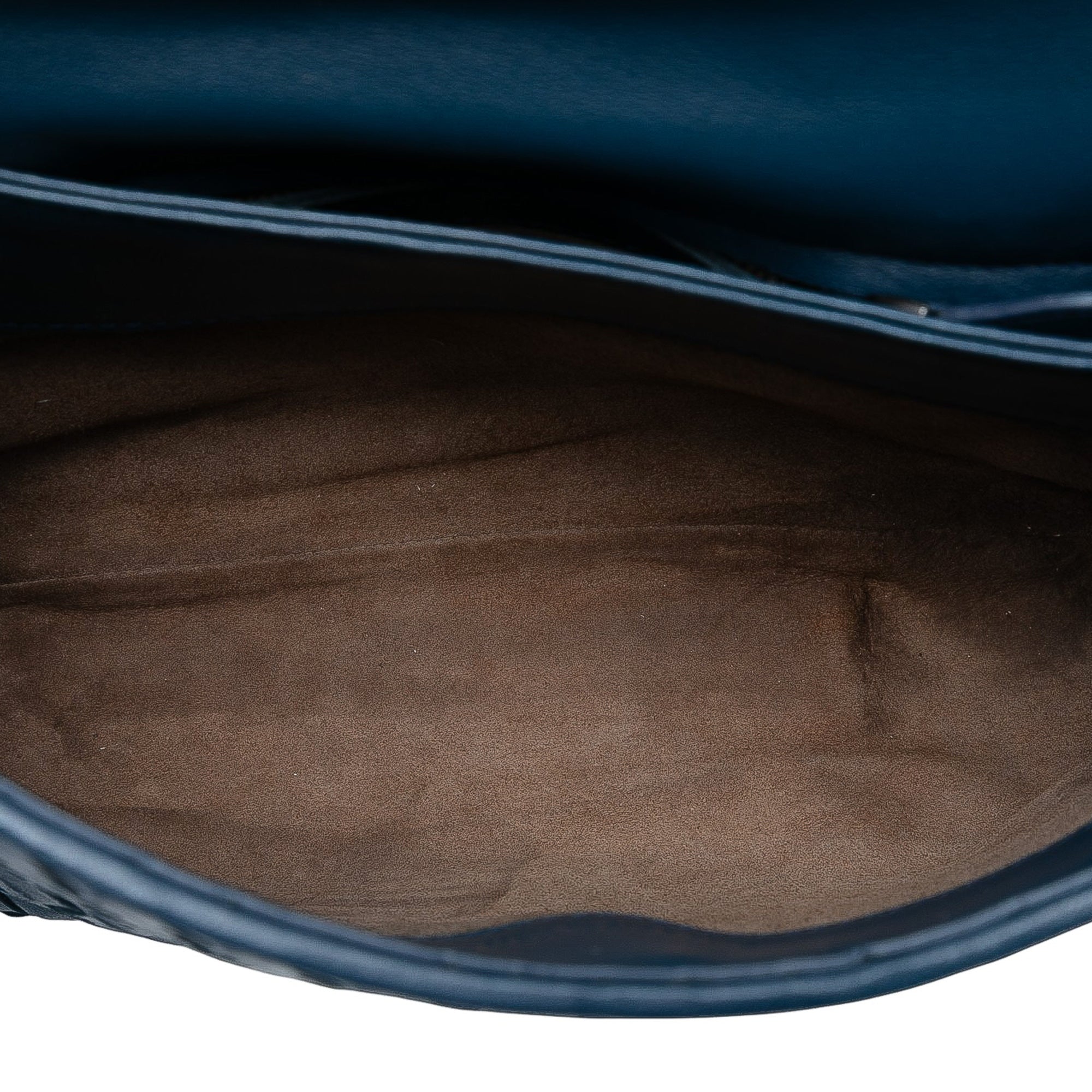 The Olimpia features a woven leather body, a chain link shoulder strap with leather guard, a flap with magnetic snap closure, and an interior zip pocket. Inclusion: Dust bag. Retail Price: 2500.00