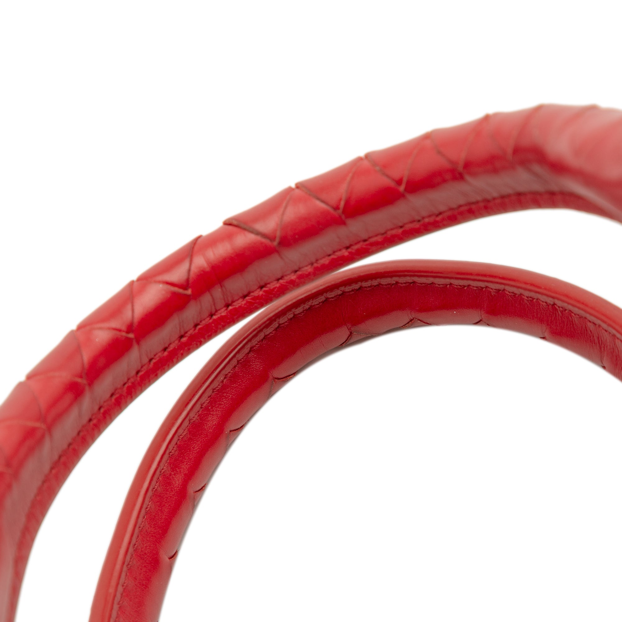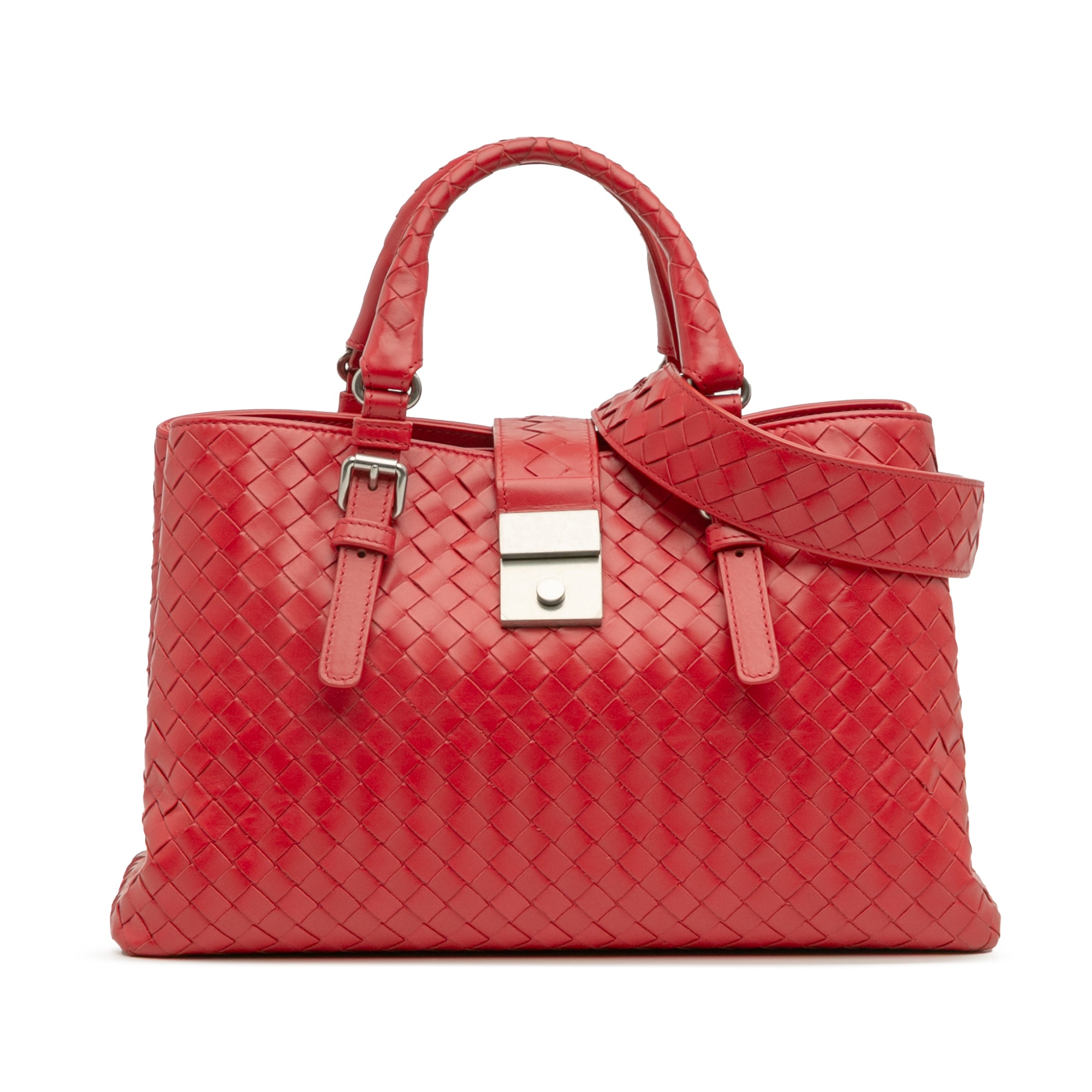 The Small Roma satchel features a woven nappa leather body, rolled leather handles, a detachable flat leather strap, a top strap with a push lock and magnetic closure, interior compartments, and an interior zip pocket. Inclusion: Dust bag. Retail Price: 4100.00
