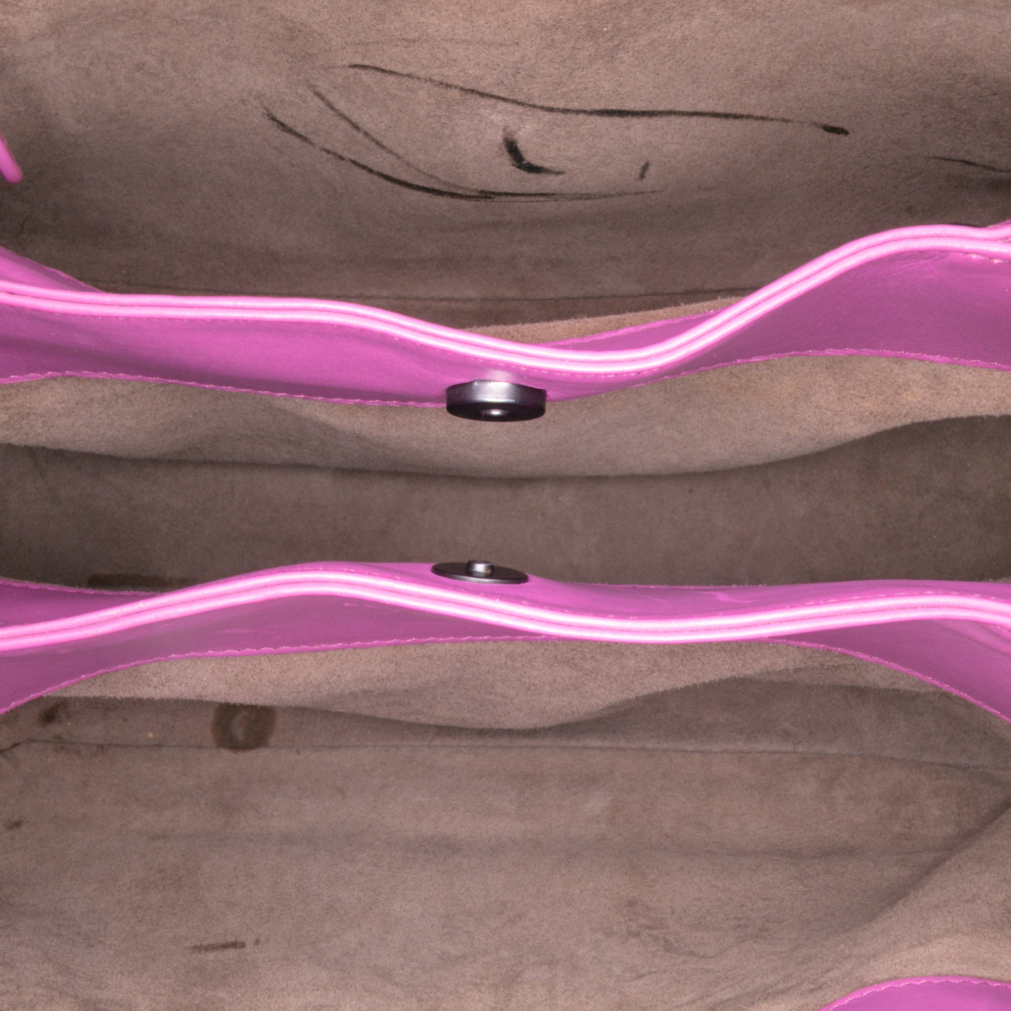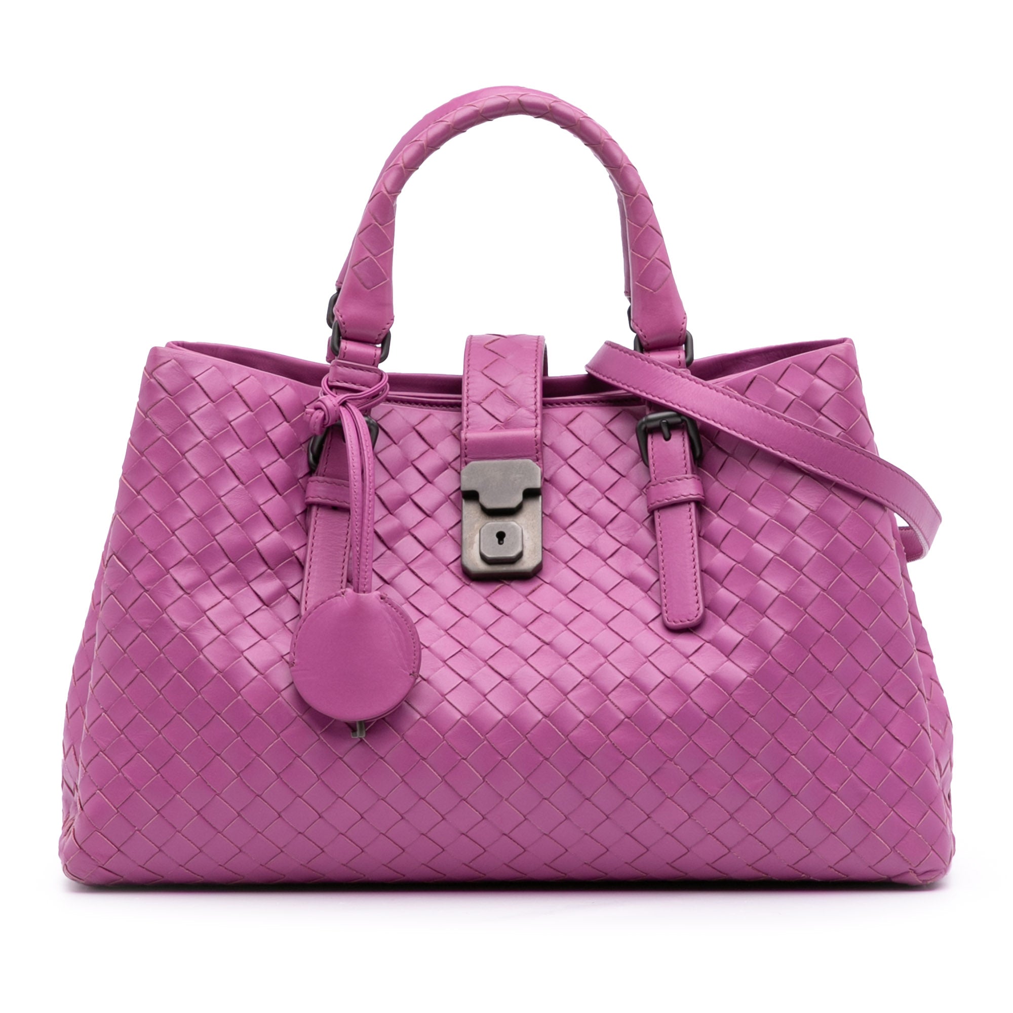 The Small Roma satchel features a woven nappa leather body, rolled leather handles, a detachable flat leather strap, a top strap with a push lock and magnetic closure, interior compartments, and an interior zip pocket. Retail Price: 3100.00