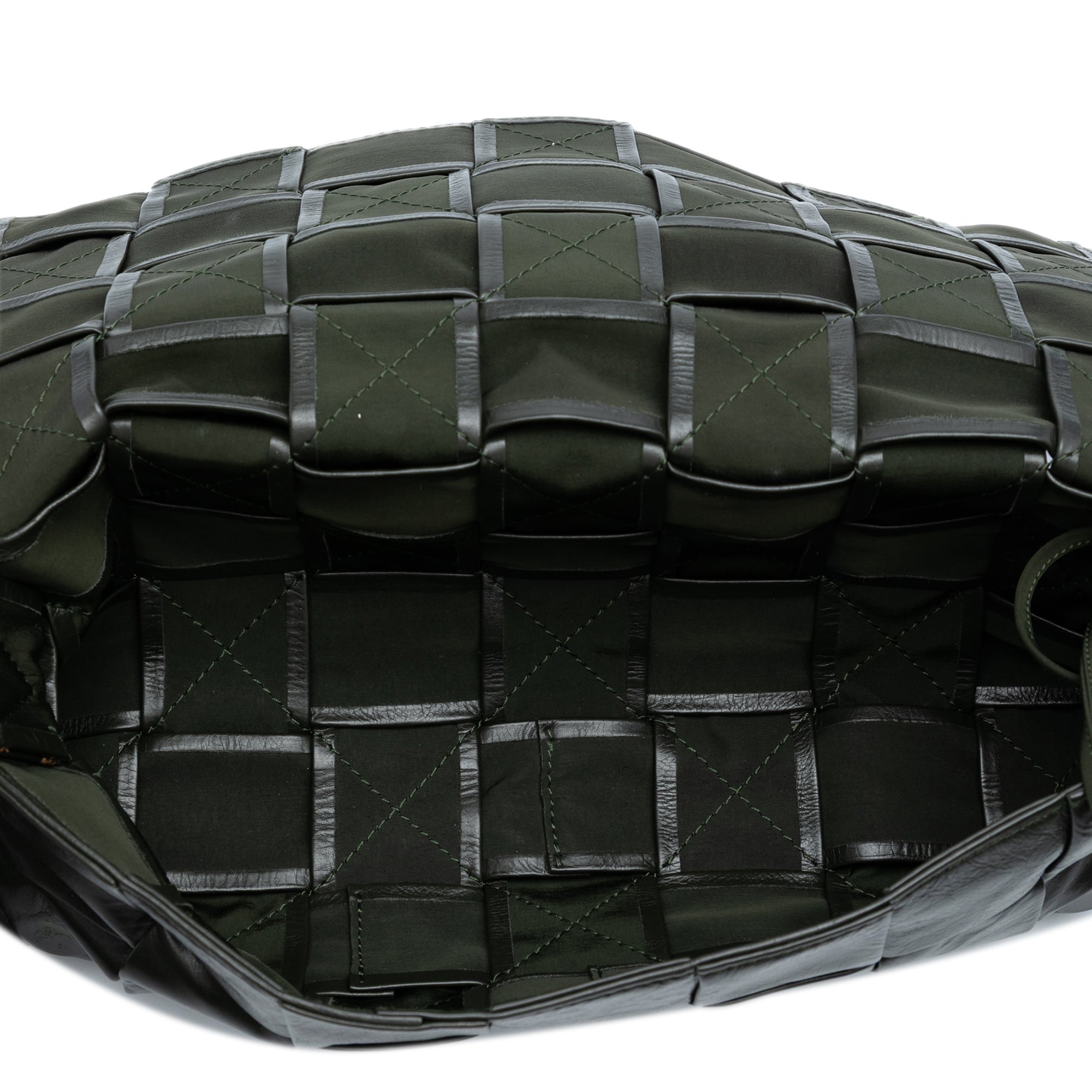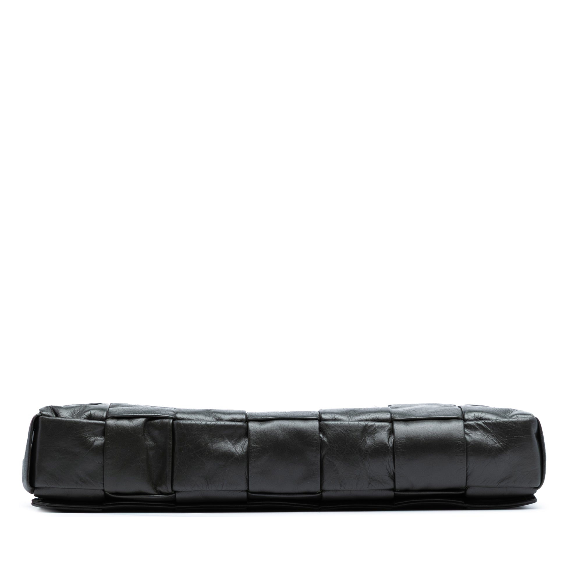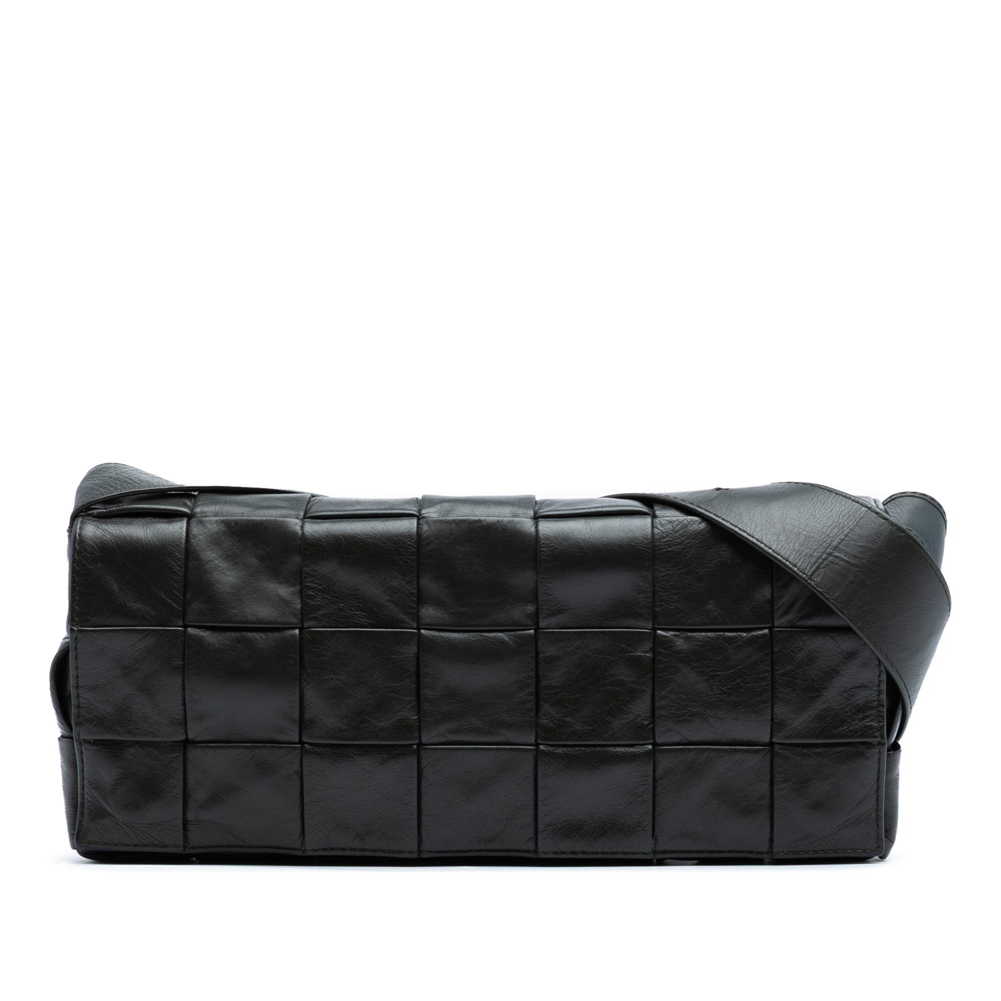 The Cassette features a woven nappa leather body, a flat leather shoulder strap, a front flap with magnetic snap closure, and an interior zip pocket. Retail Price: 1546.00