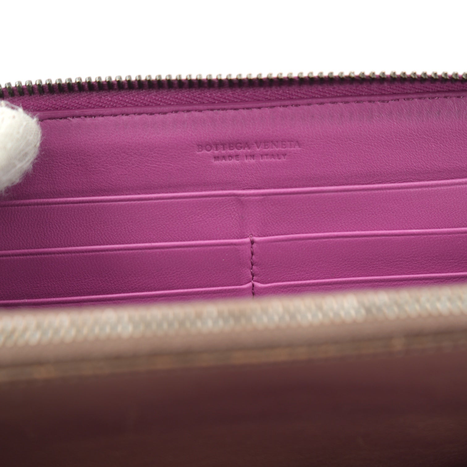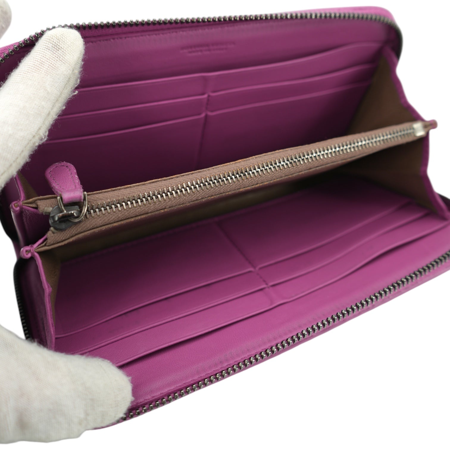 Discover The Essence Of Italian Craftsmanship With This Bottega Veneta Purple Intrecciato Leather Zippy Continental Wallet. A True Icon Of The House, This Medium-sized Accessory Features The Signature Intrecciato Hand-woven Leather In a Vibrant Purple Hue, Beautifully Complemented By Sleek Gunmetal Hardware. Crafted In Italy Between 2010 And 2019, This Piece Offers Both Elegance And Practicality With Its Secure Zip-around Closure And a Meticulously Organized Interior. Inside, You Will Find Eight Credit Card Slots, Two Open Compartments, a Central Zip Coin Pocket, And Two Side Flat Pockets, All Lined With a Sophisticated Blend Of Leather And Fabric. Authenticated By a Serial Number And Featuring The 'Bottega Veneta - Made In Italy' Engraving, This Vintage Treasure Comes With Its Original Box, Making It a Perfect Addition For Any Second-hand Enthusiast Looking For Timeless Style.