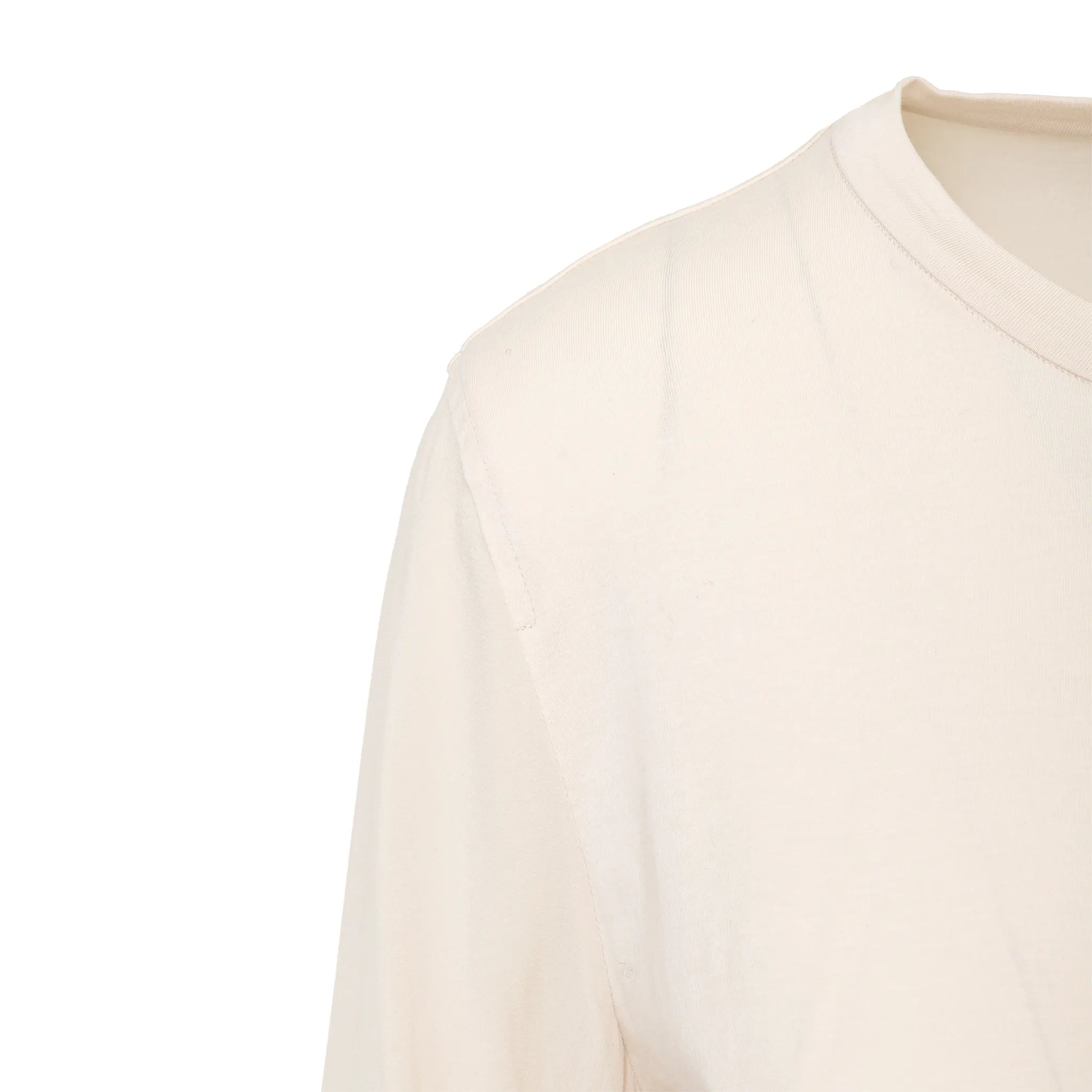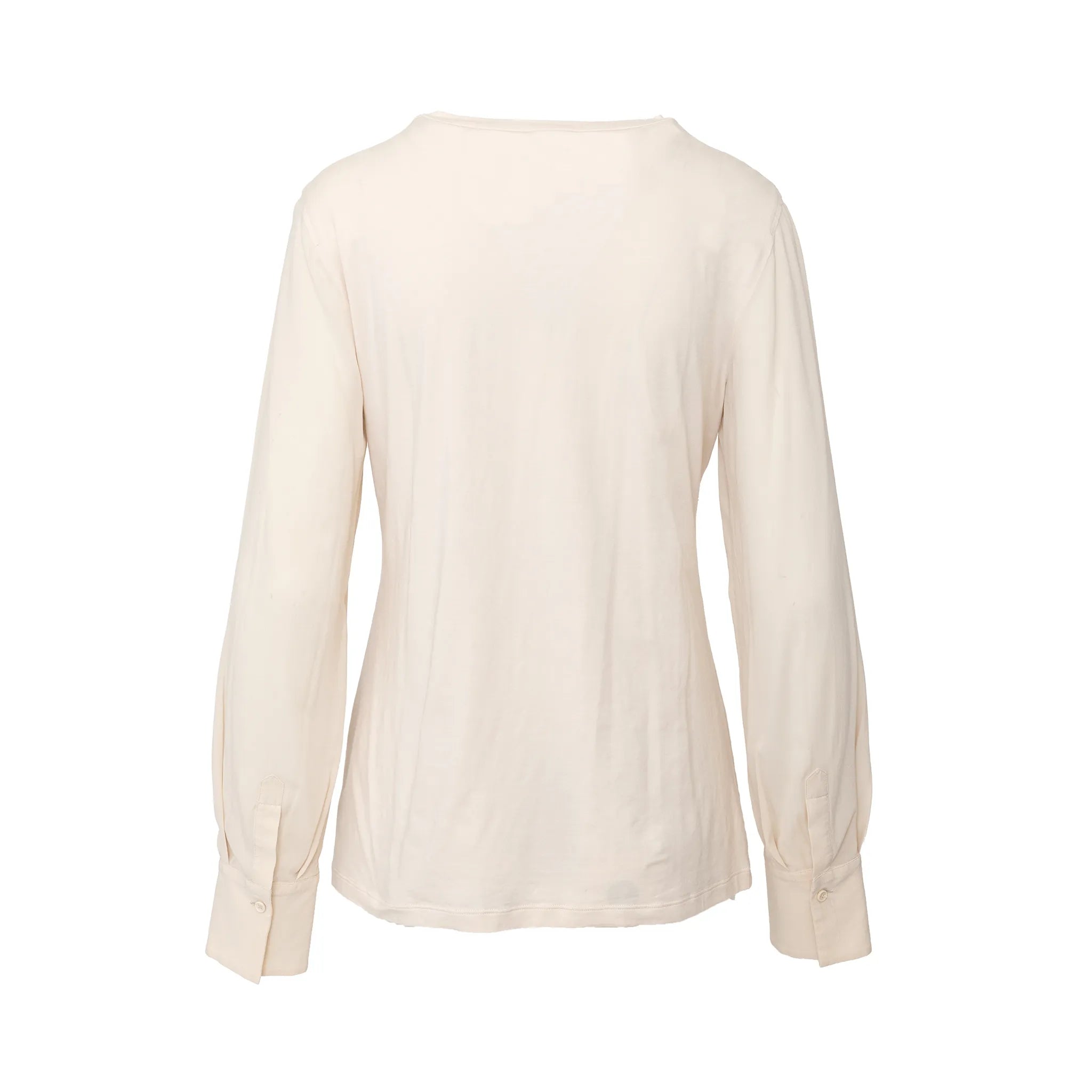 Brunello Cucinelli top in a creamy off-white cotton blend. Features a rounded V-neck and silk-blend cuffed sleeves for a casual yet elevated look.