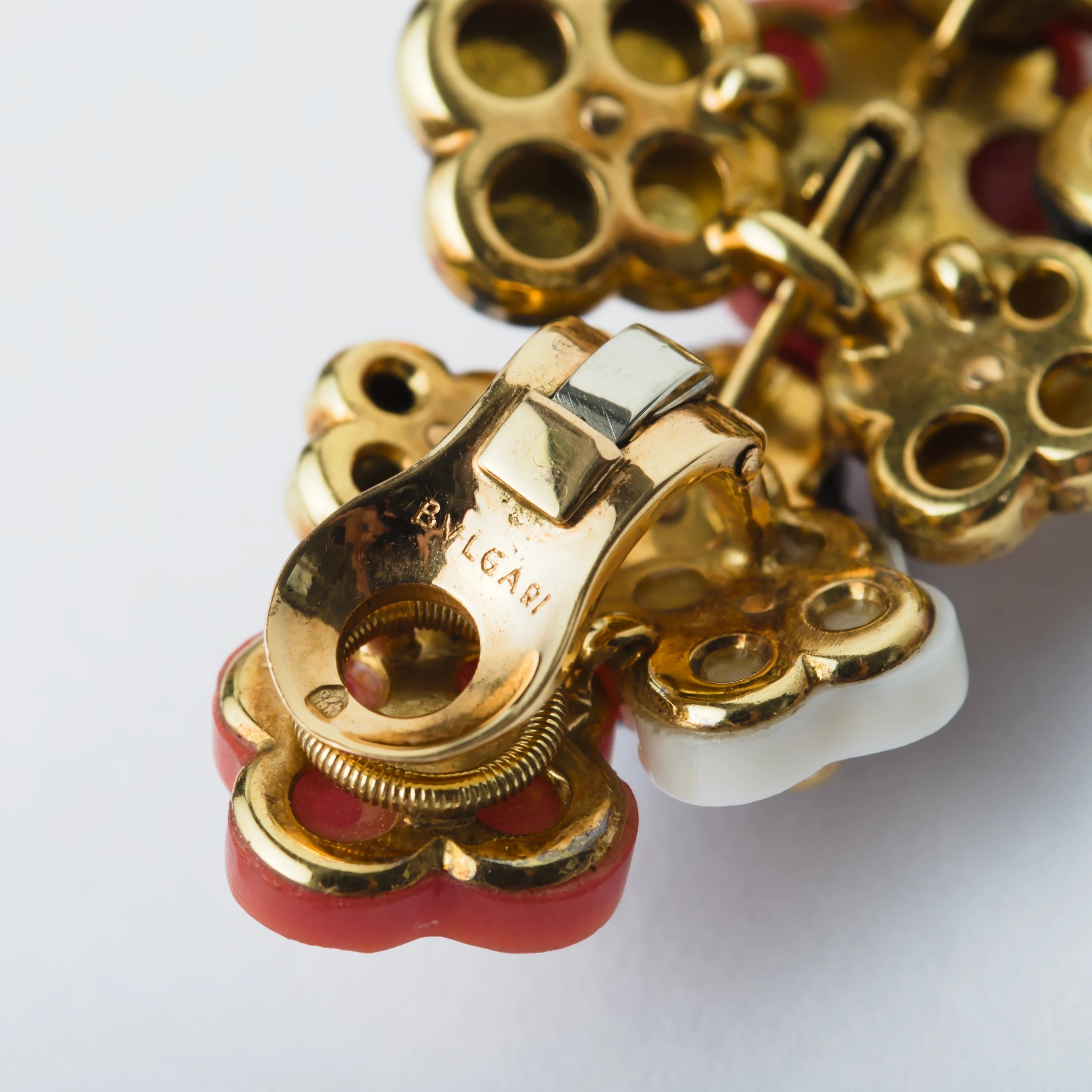Rare pair of vintage Bulgari earrings in yellow gold, set with coral, onyx and white agate, with an impressive total weight of 54 grams.