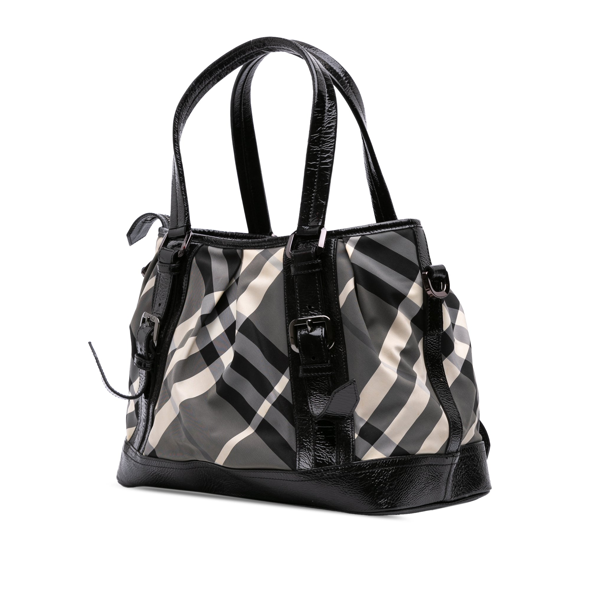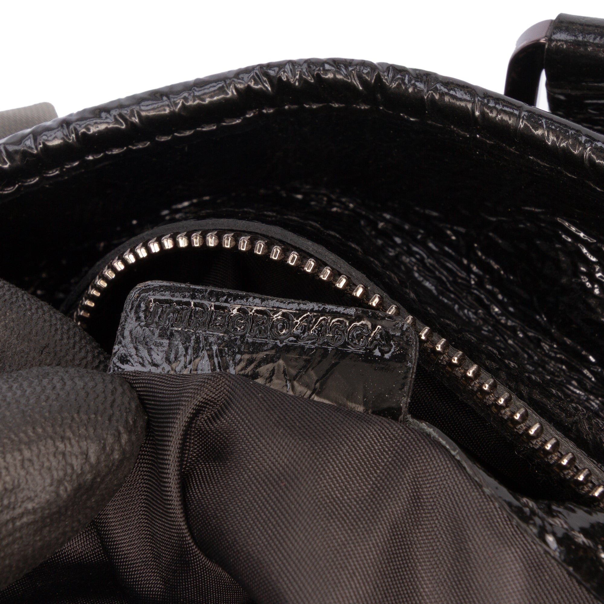 This satchel features a nylon body with patent leather trim, flat patent leather handles, a detachable and adjustable patent leather shoulder strap with leather guard, a top zip closure, and interior zip, slip and open pockets. Retail Price: 1495.00