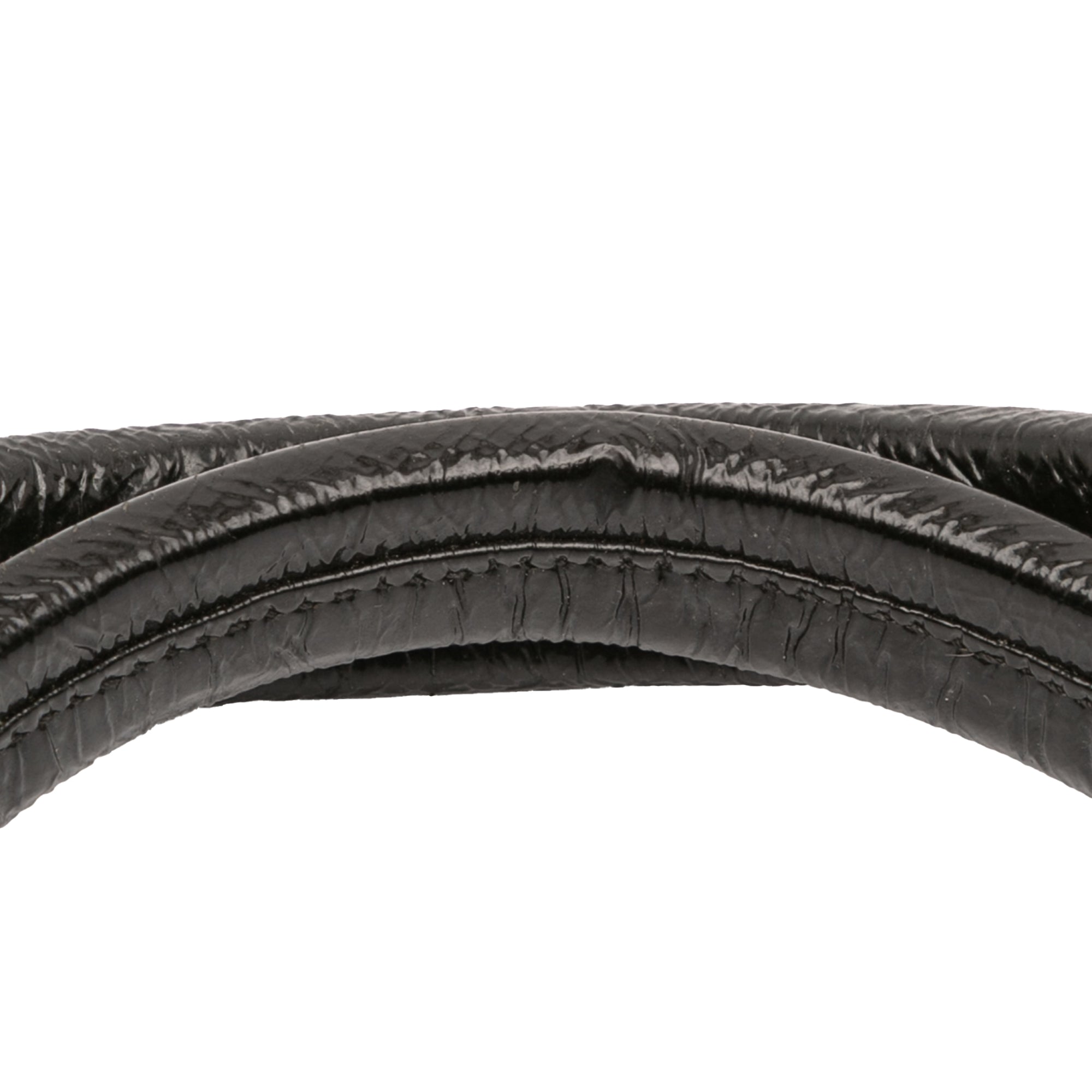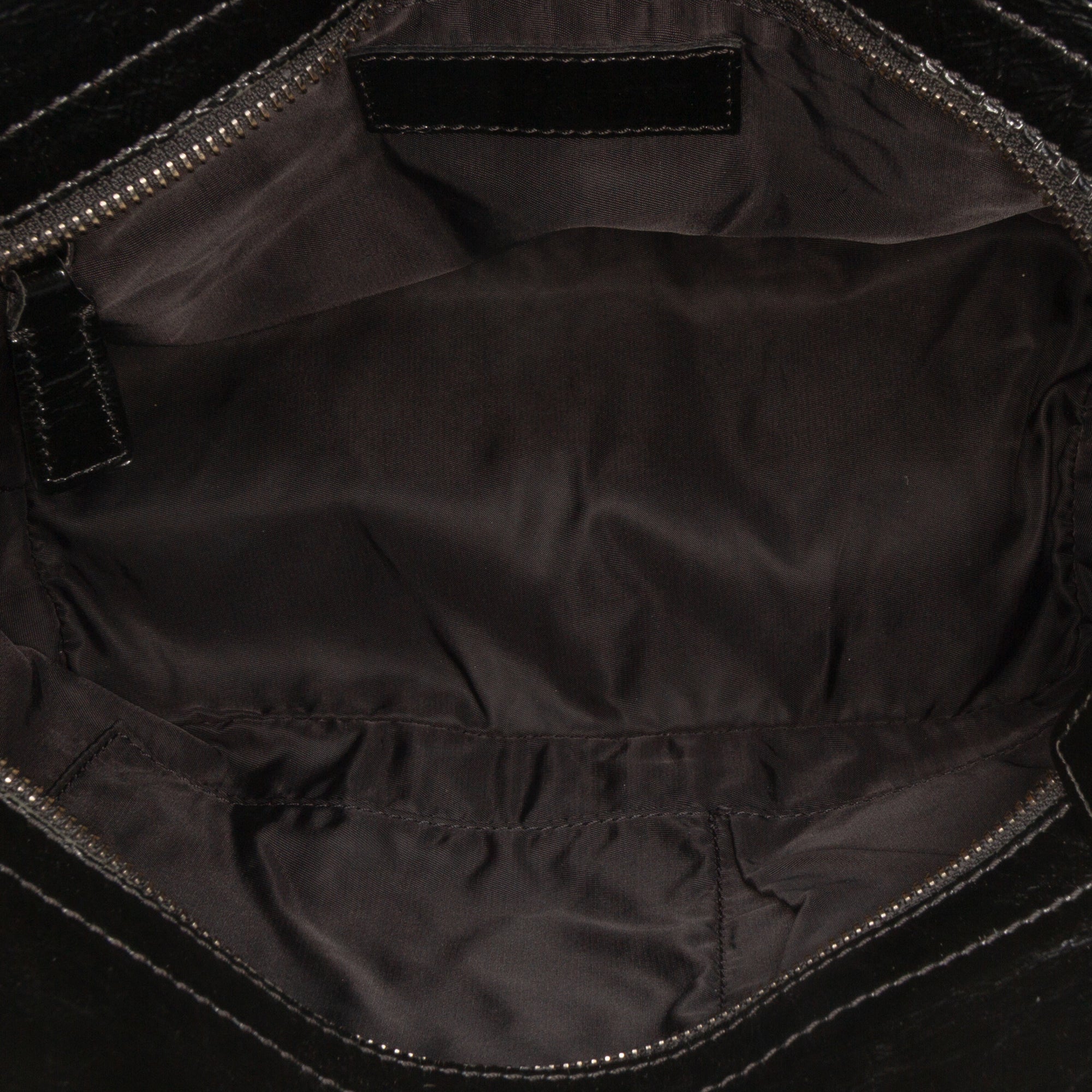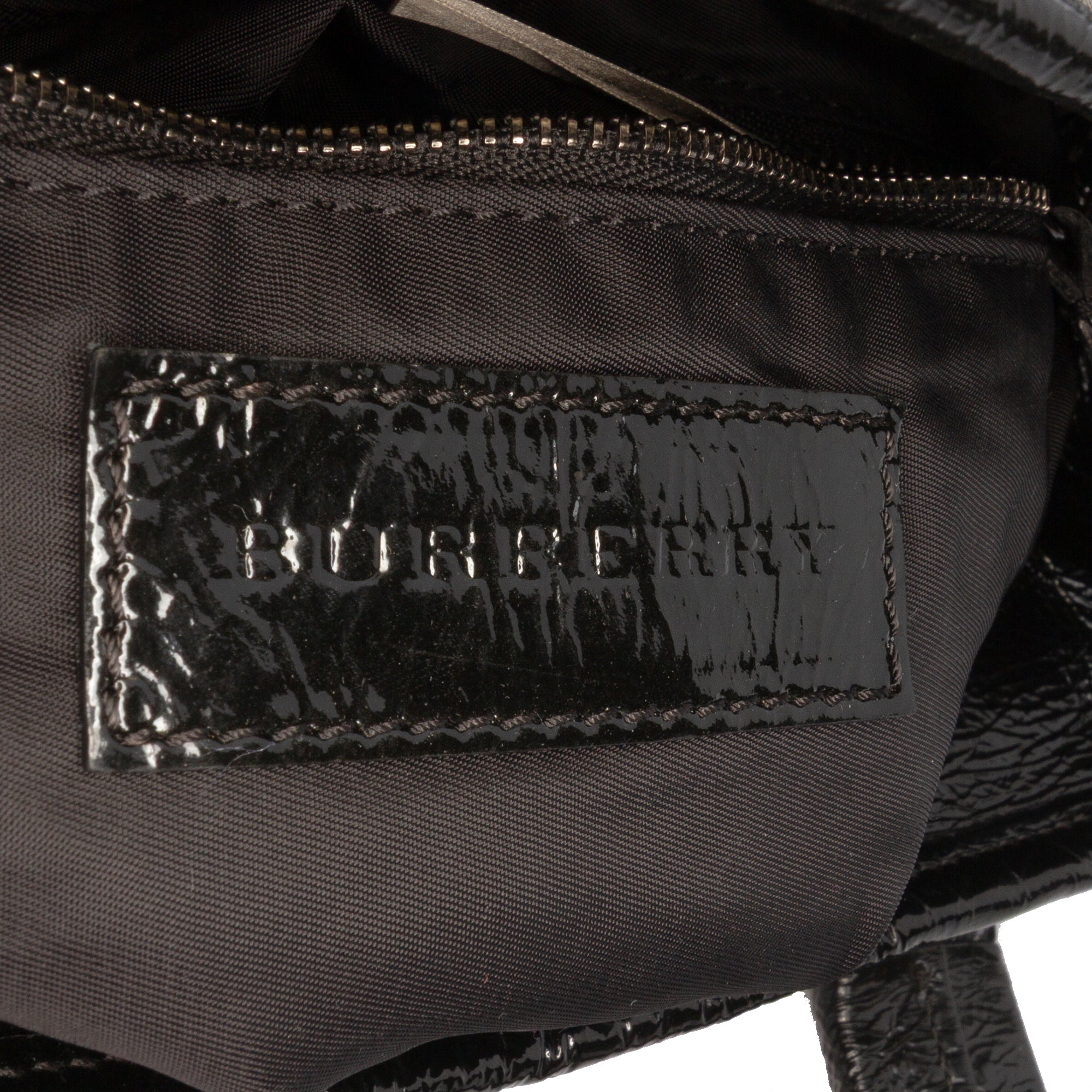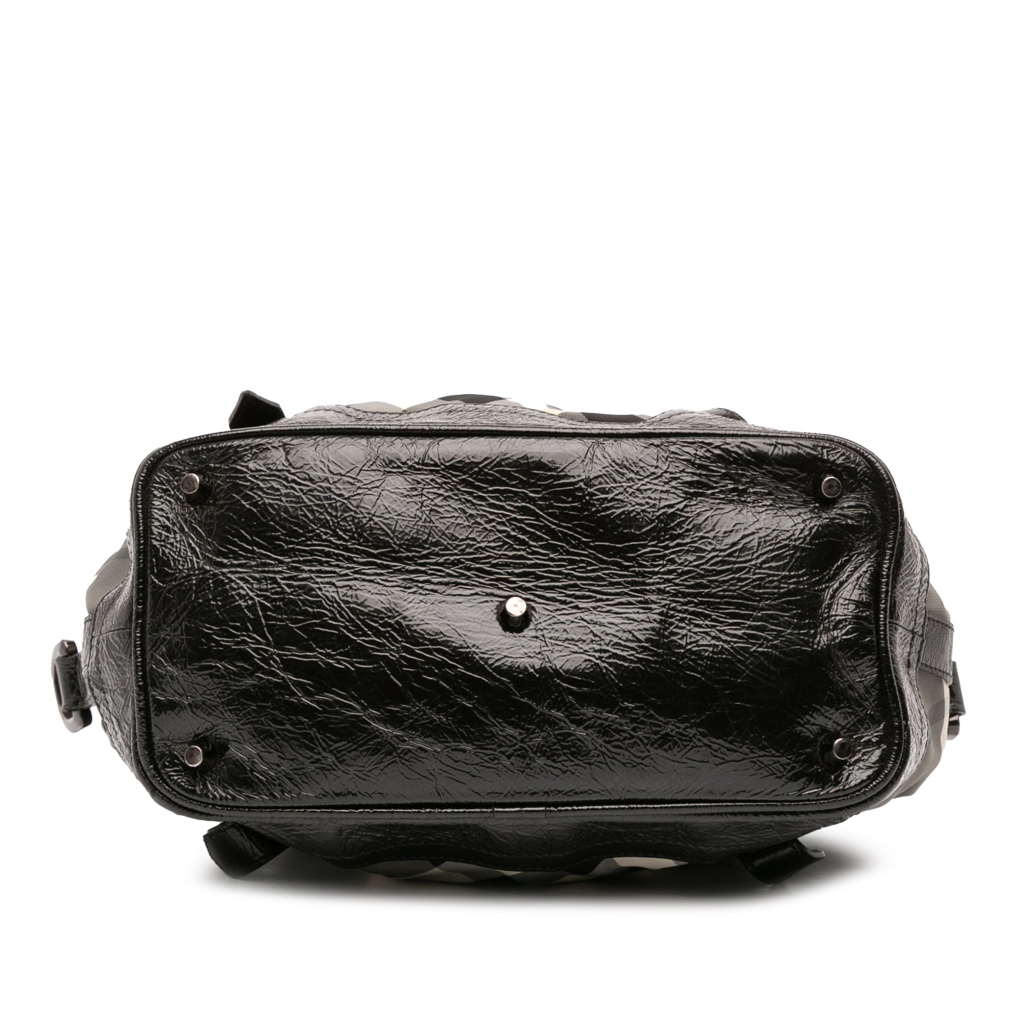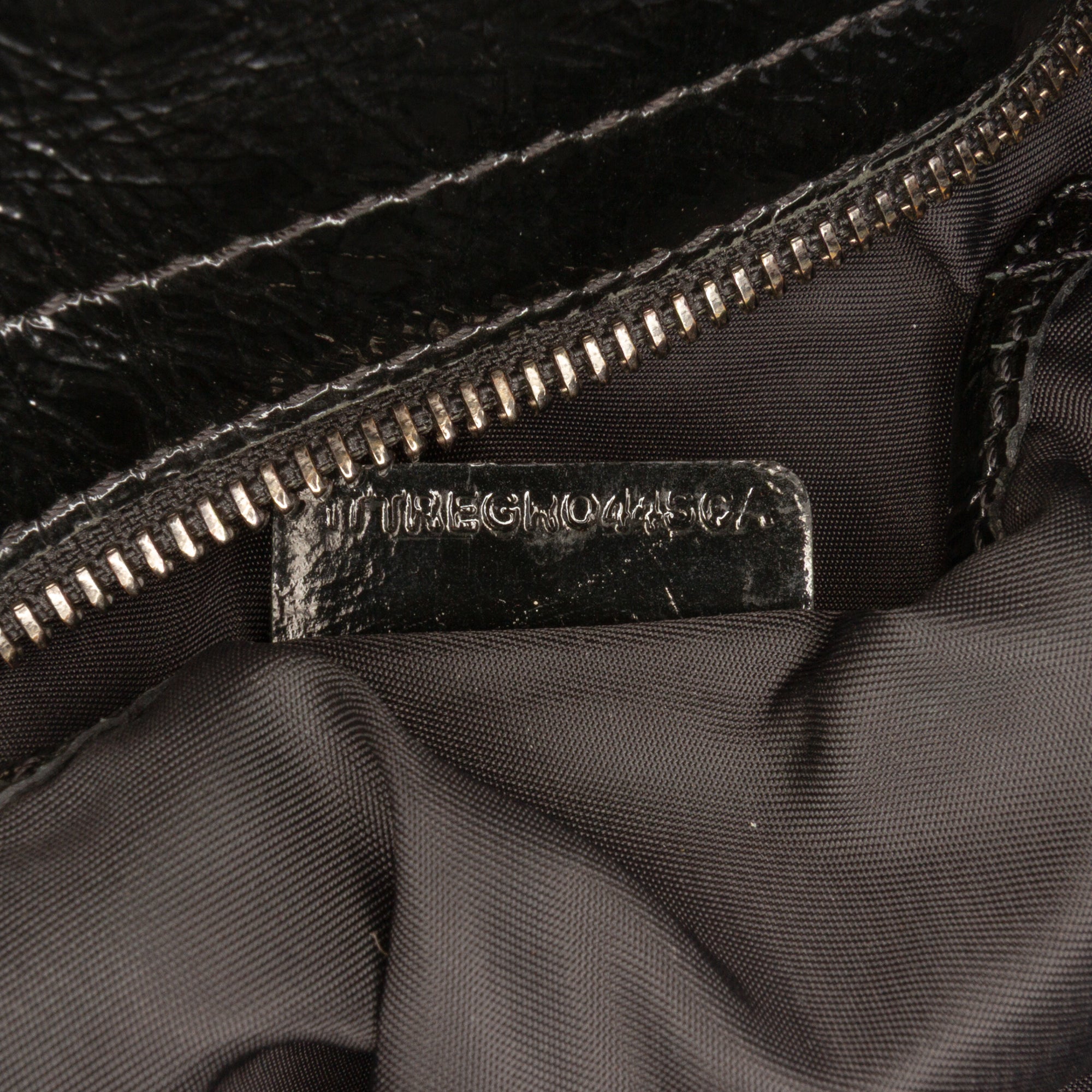 This satchel features a nylon body with patent leather trim, flat patent leather top handles, a detachable and adjustable patent leather shoulder strap with leather guard, a top zip closure, and interior zip and slip pockets. Retail Price: 1220.00